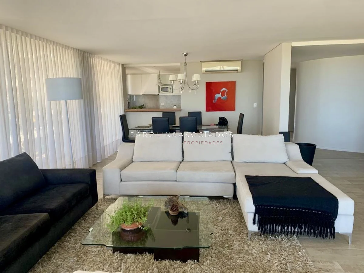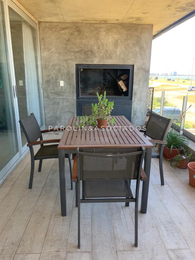 El living comedor esquinero, completamente vidriado, brinda una conexión directa con el exterior y acceso al balcón principal con parrillero propio, ideal para disfrutar del aire libre y vistas abiertas al mar.