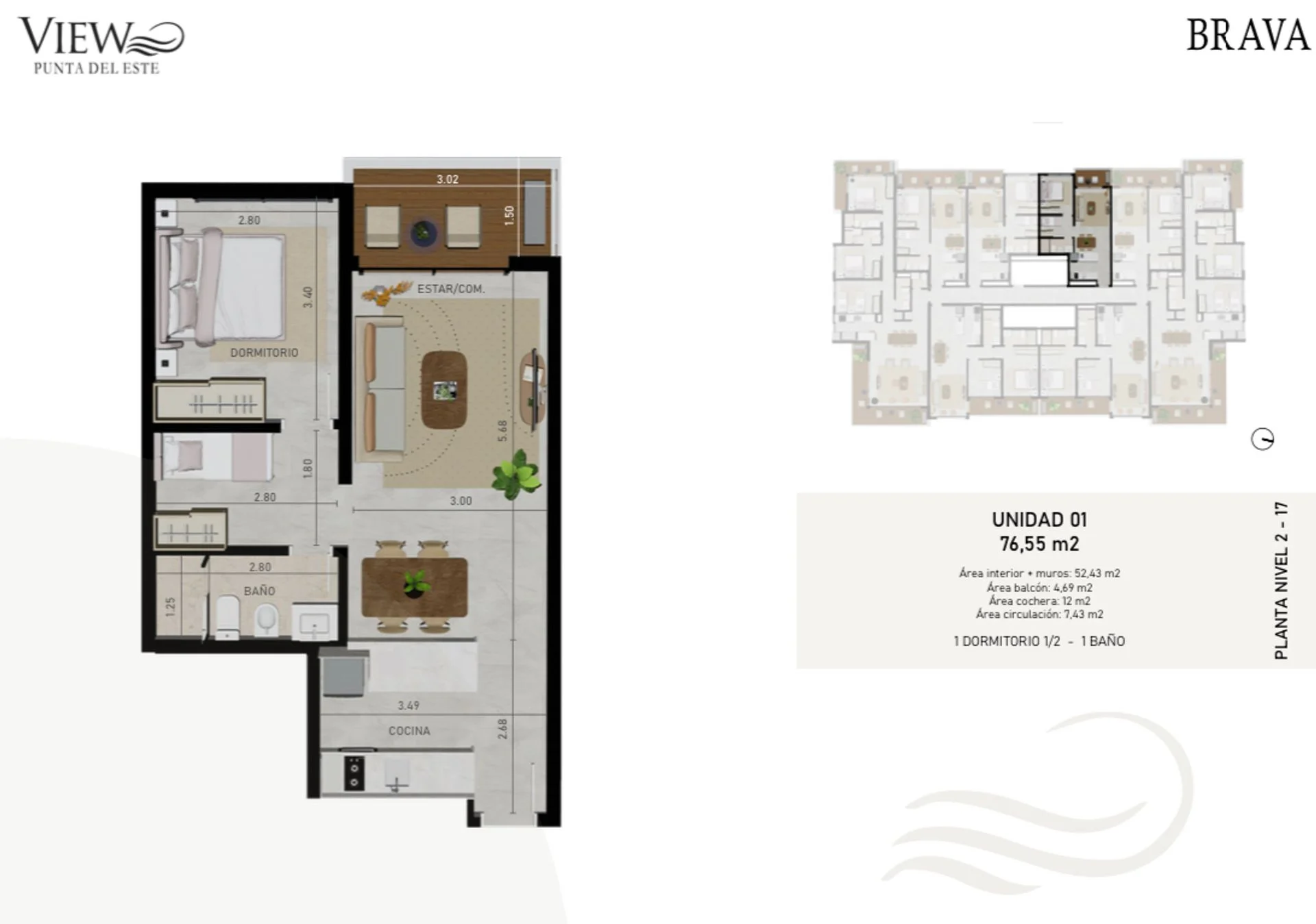 76,55 m² 1 dormitorio 1/2, 1 baño