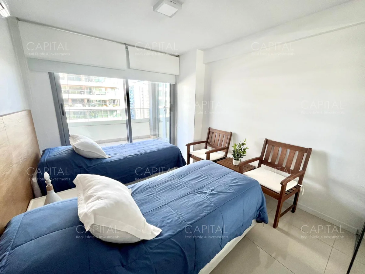 Todos los amenities, cochera Fija, 2 dormitorios (principal en suite), 2 baños completos, balcón, cofre de seguridad, ropa blanca, servicio de limpieza (opcional), tv por cable, Wi-Fi, pileta climatizada descubierta, Sauna, Yacuzzi, Parrillero, gimnasio, microcine, salas de juegos, Servicio de Playa incluído en temporada Alta.