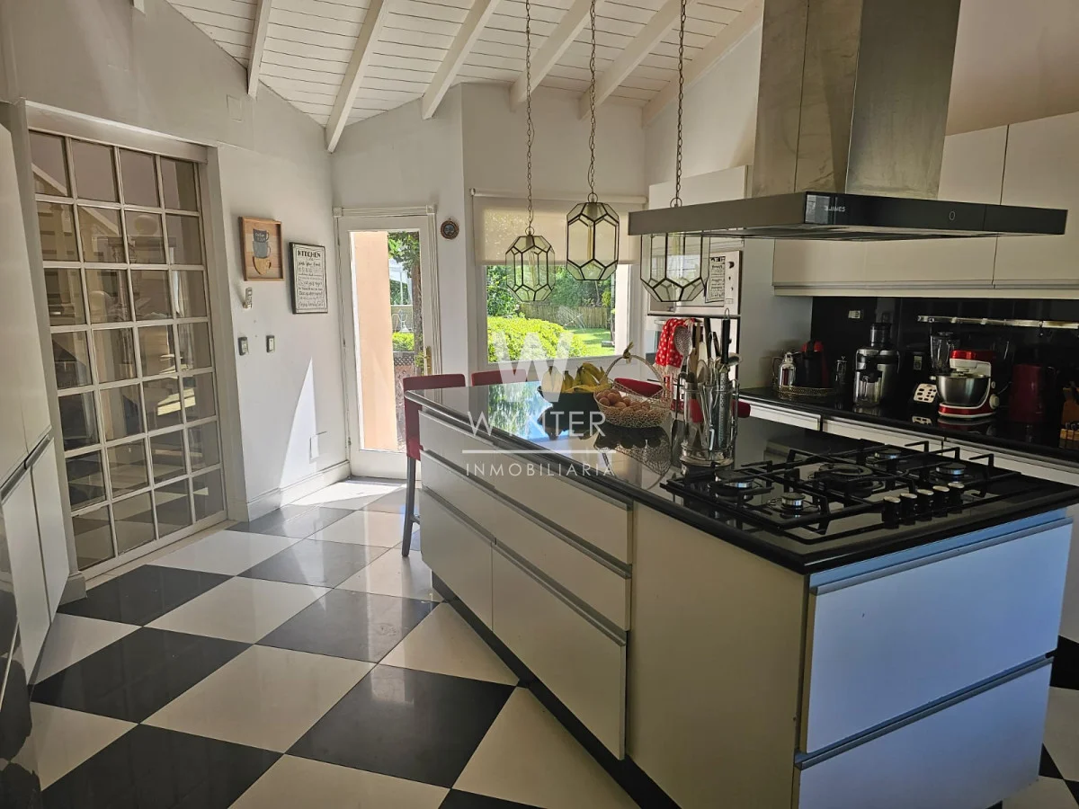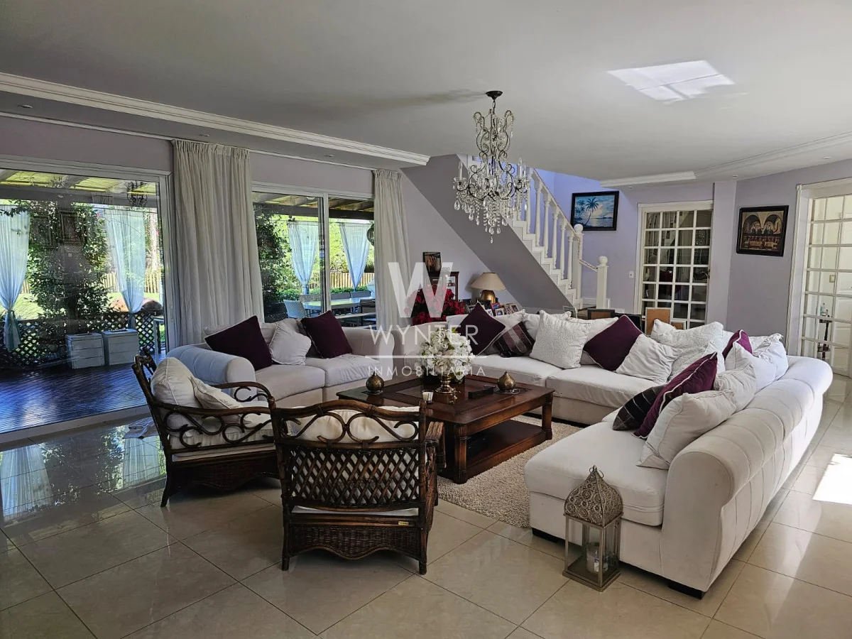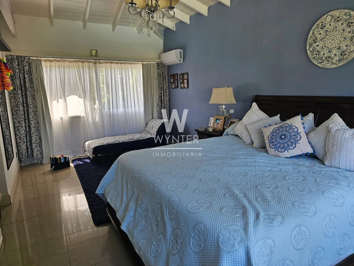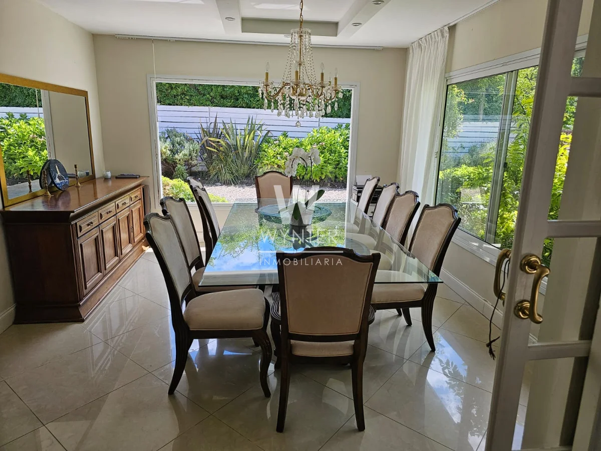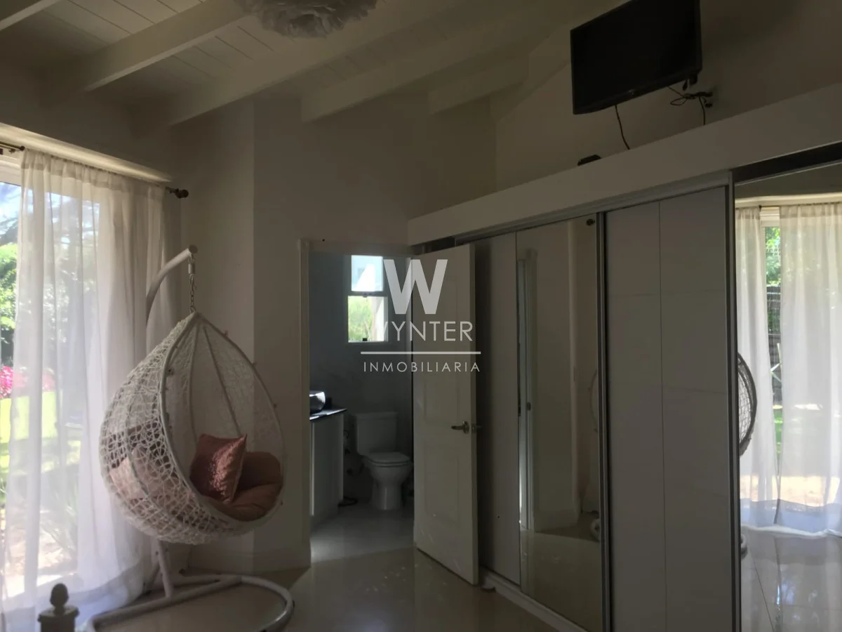 Cuenta con 5 dormitorios, 4 de ellos en suite con vestidores todos, 5 baños, uno con bañera doble , amplio living de 80 m2 con estufa a leña, comedor, sala de juegos, amplia cocina con isla, barbacoa de 100 m2 más lavadero y dormitorio de servicio además de estacionamiento para 4 autos. Todas las habitaciones cuentan con aire acondicionado frio-calor. Sistema de audio en pérgola y piscina.