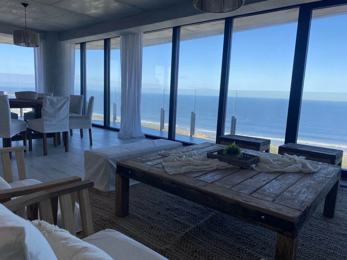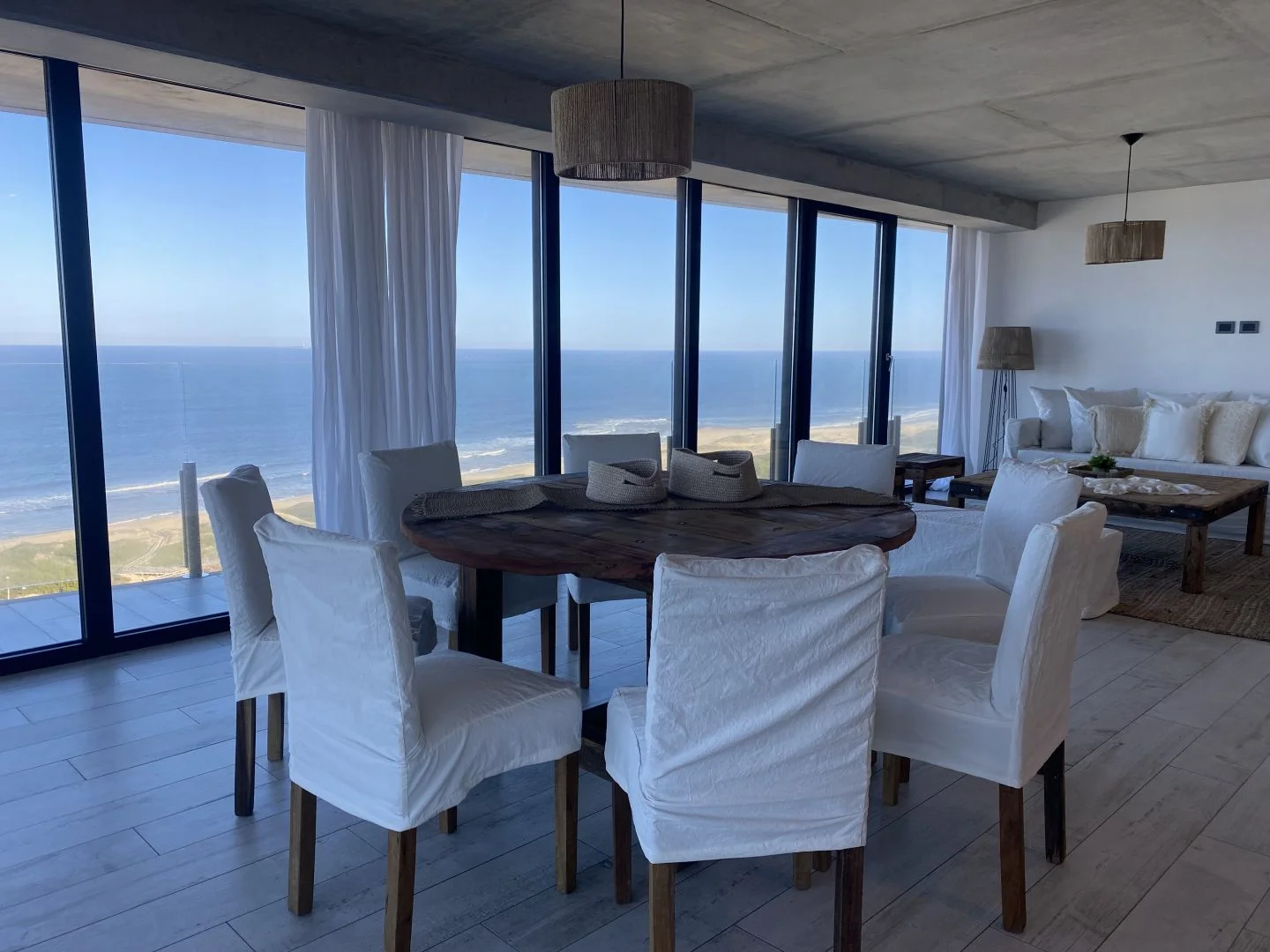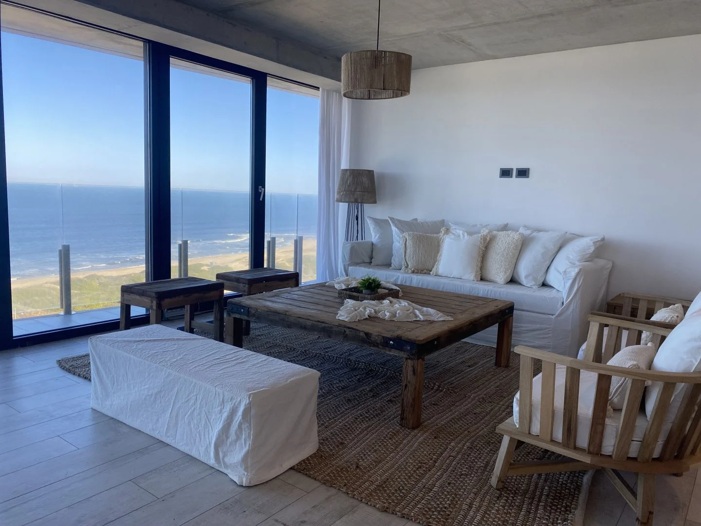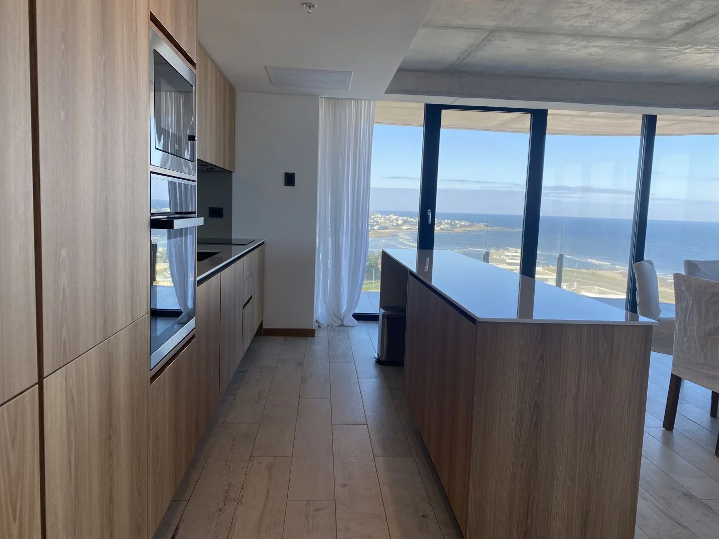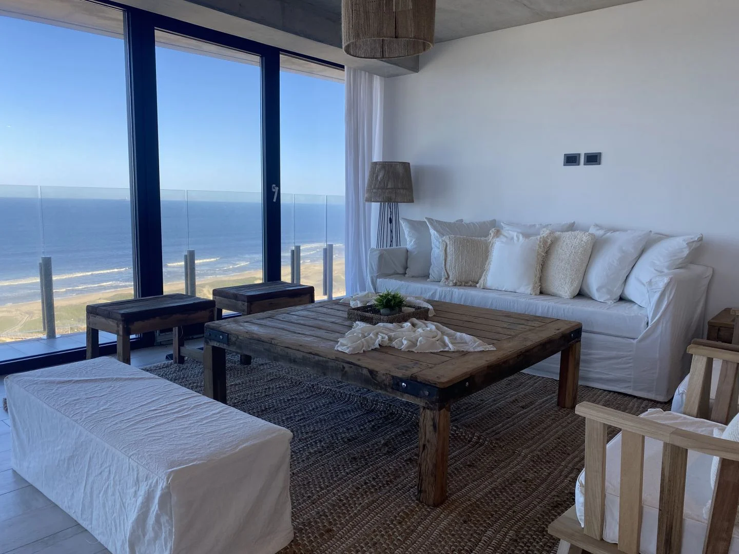 El diseño del apartamento integra armoniosamente el living, la cocina y el comedor, fluyendo hacia una terraza envolvente que captura vistas espectaculares de la Brava y La Barra.