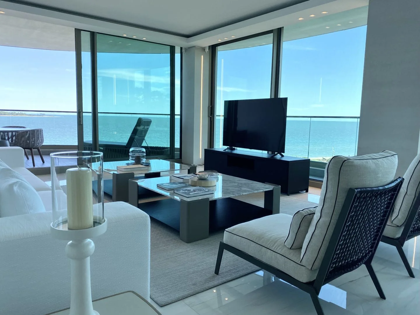 Espectacular apartamento de 4 dormitorios en suite, espacioso living, comedor, cocina totalmente equipada, toilette, terraza con vista directa al mar y puesta del sol.