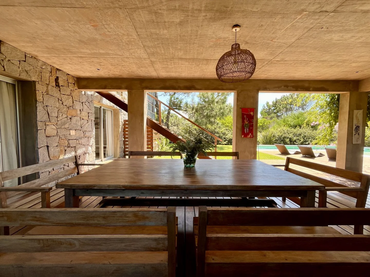 El exterior de la propiedad ofrece un oasis de relajación y diversión entre la bella vegetación, con un amplio parrillero cubierto, una terraza perfecta para disfrutar de comidas al aire libre, y una piscina privada para refrescarse en los cálidos días de verano. Esta casa es el lugar ideal para disfrutar de la tranquilidad y la belleza natural de José Ignacio.