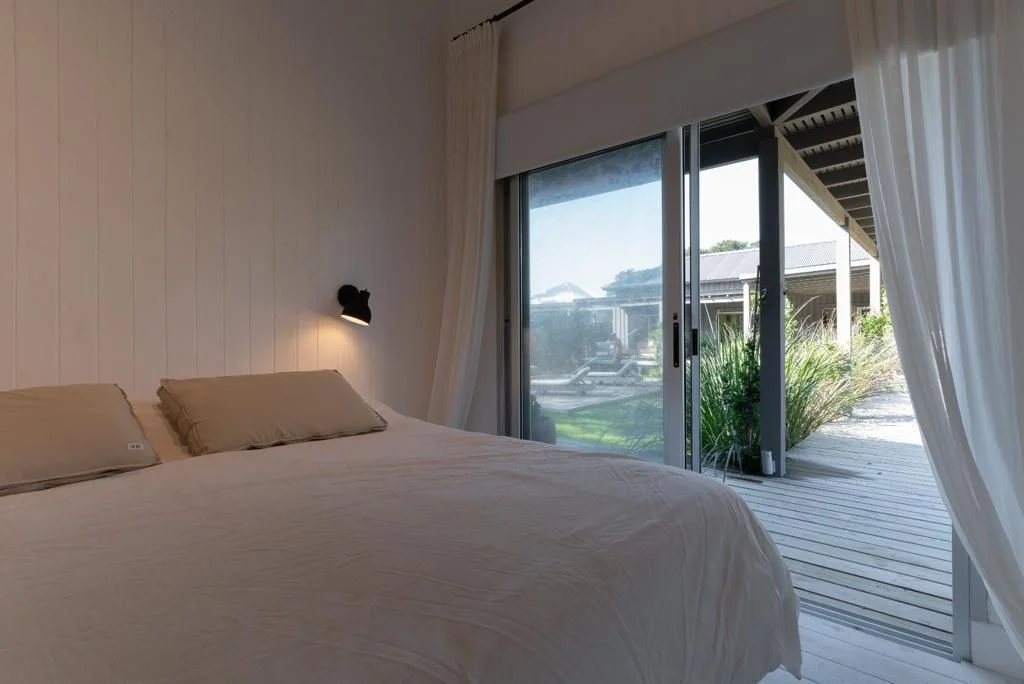 El bloque principal cuenta con un amplio living-comedor, cocina integrada con barra, toilette y una master suite con vestidor y baño en suite, con acceso directo al exterior.