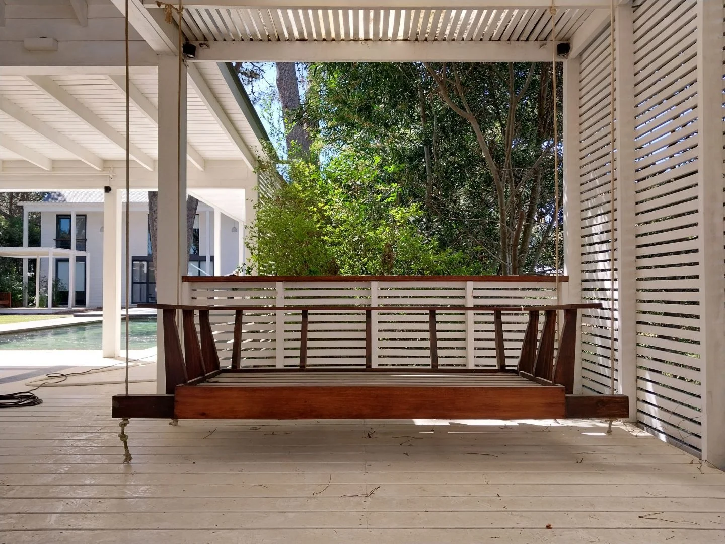 Destaca el jardín con pasto, arena, y la gran piscina en el centro de la casa.