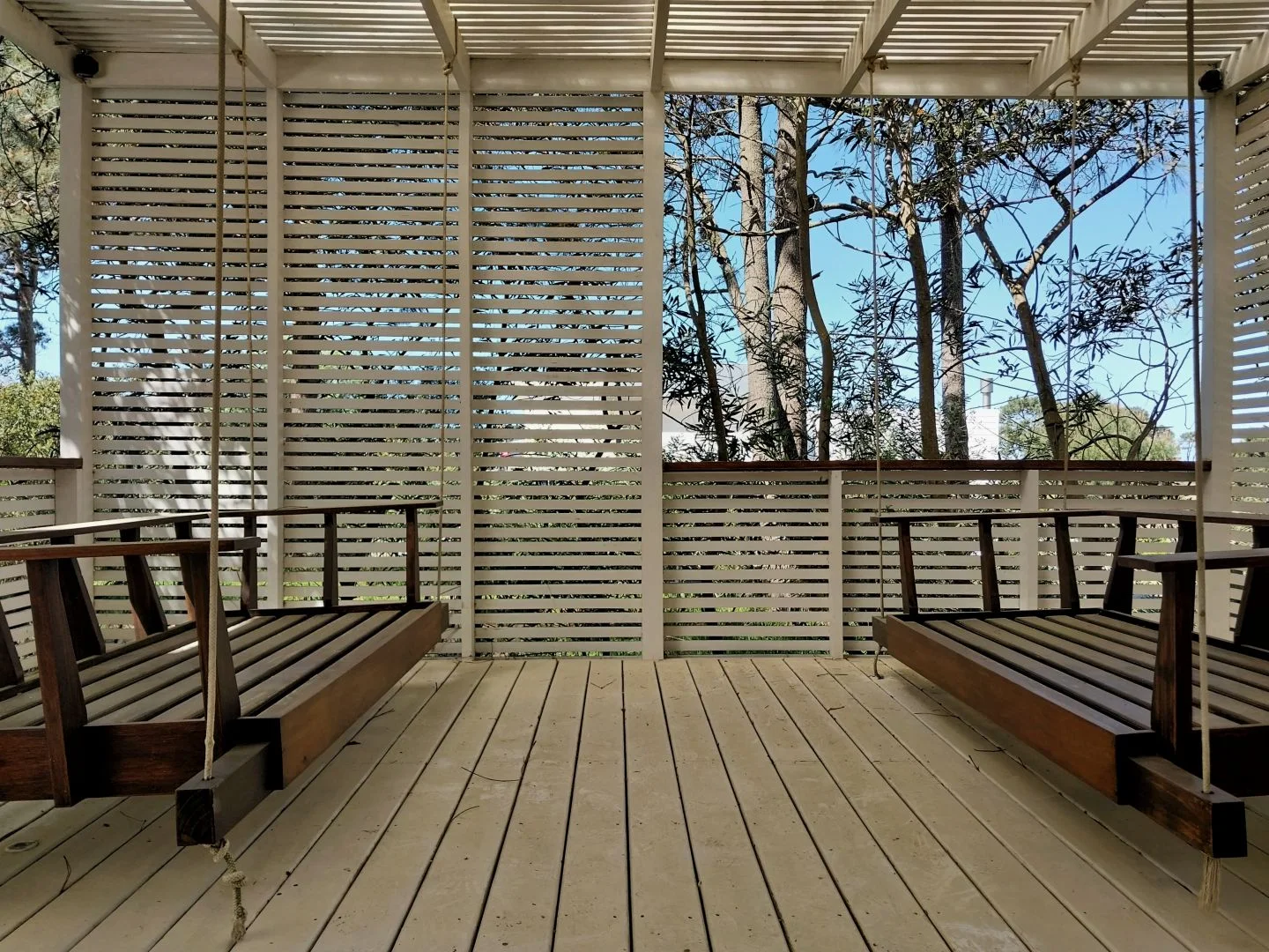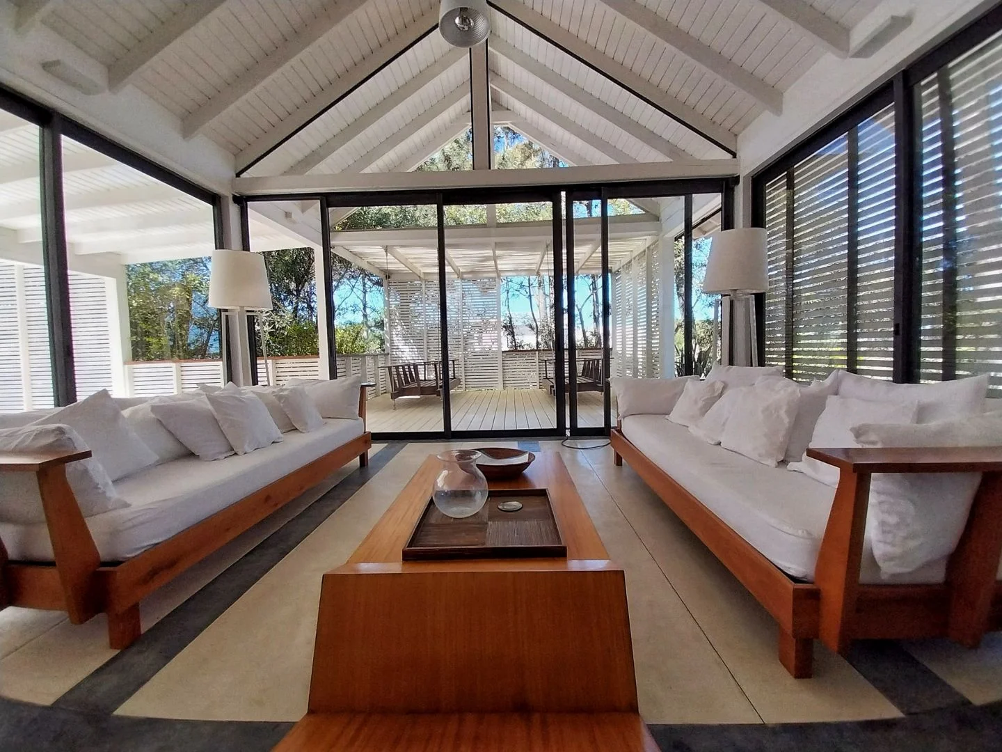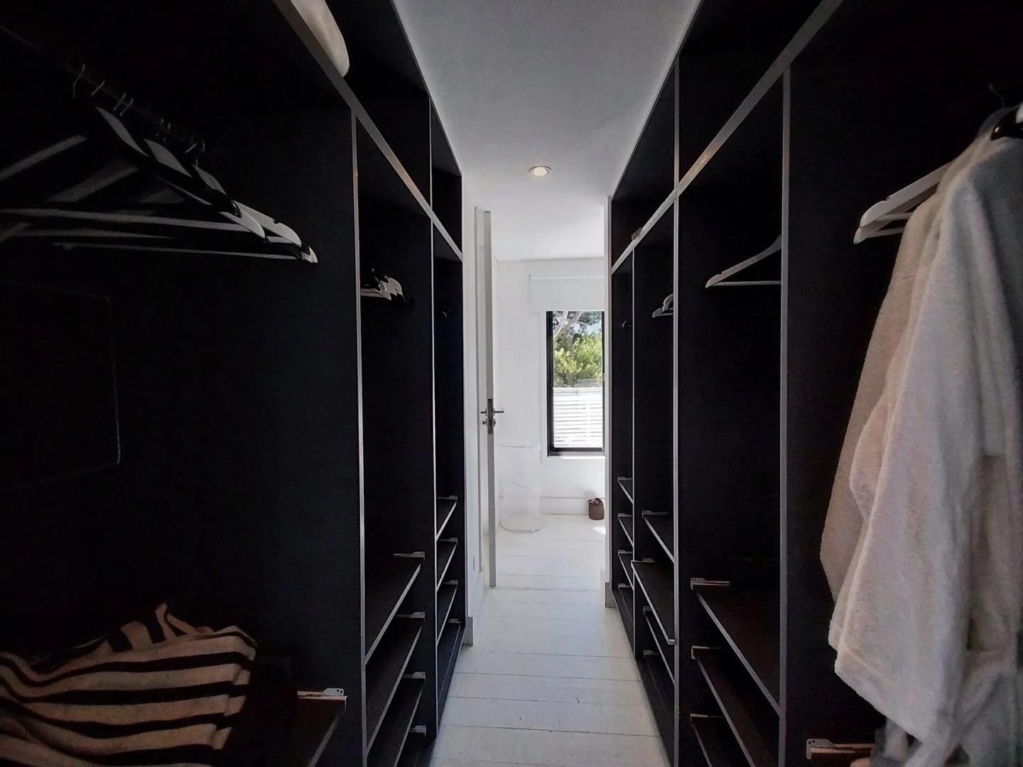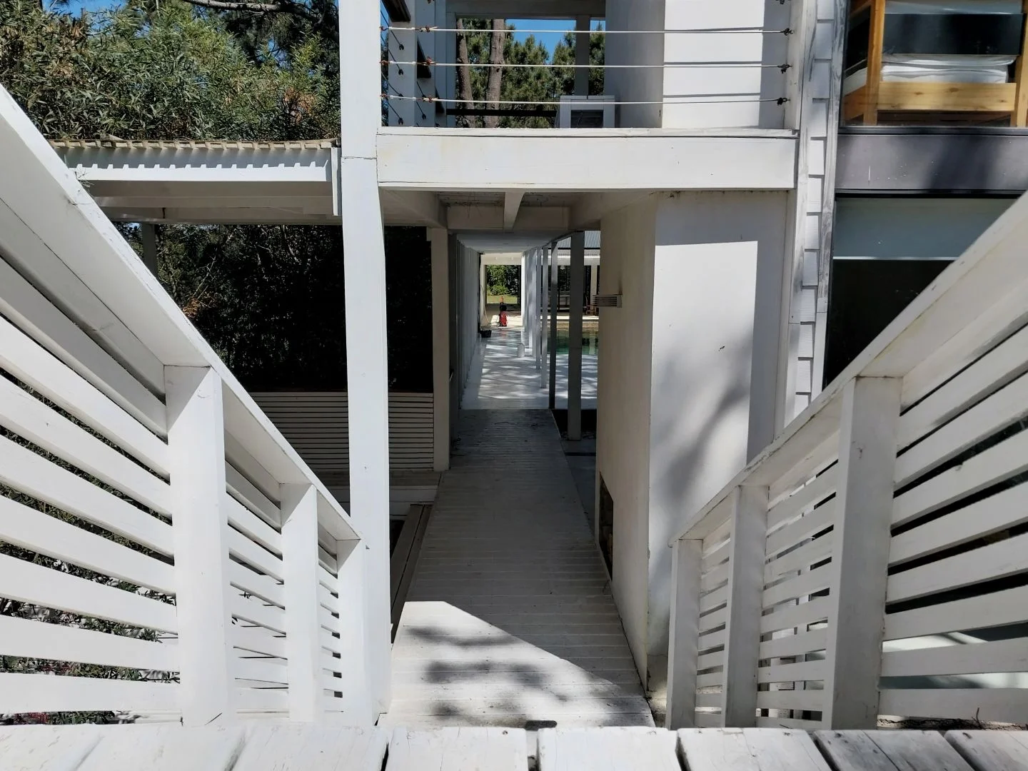 A través de las galerías, donde encontramos algunos livings exteriores, fogones, vamos al bloque de atrás donde está la sala de TV, las cuatro suites, una de ellas con vestidor, y dos kitchenette una en cada planta..