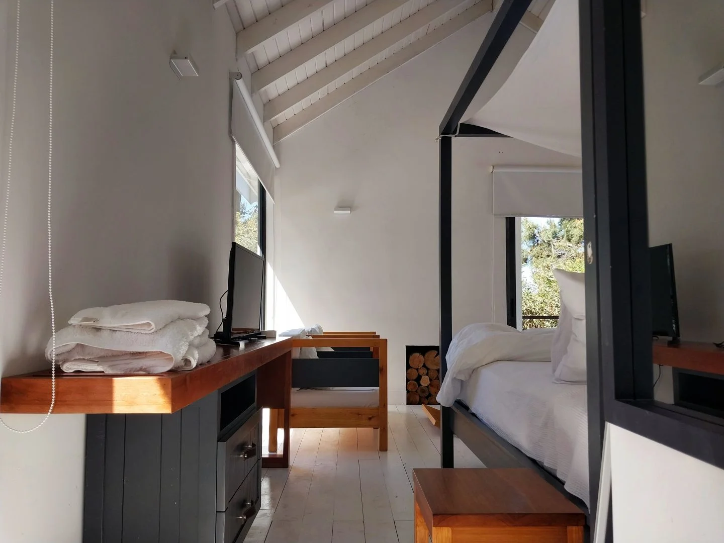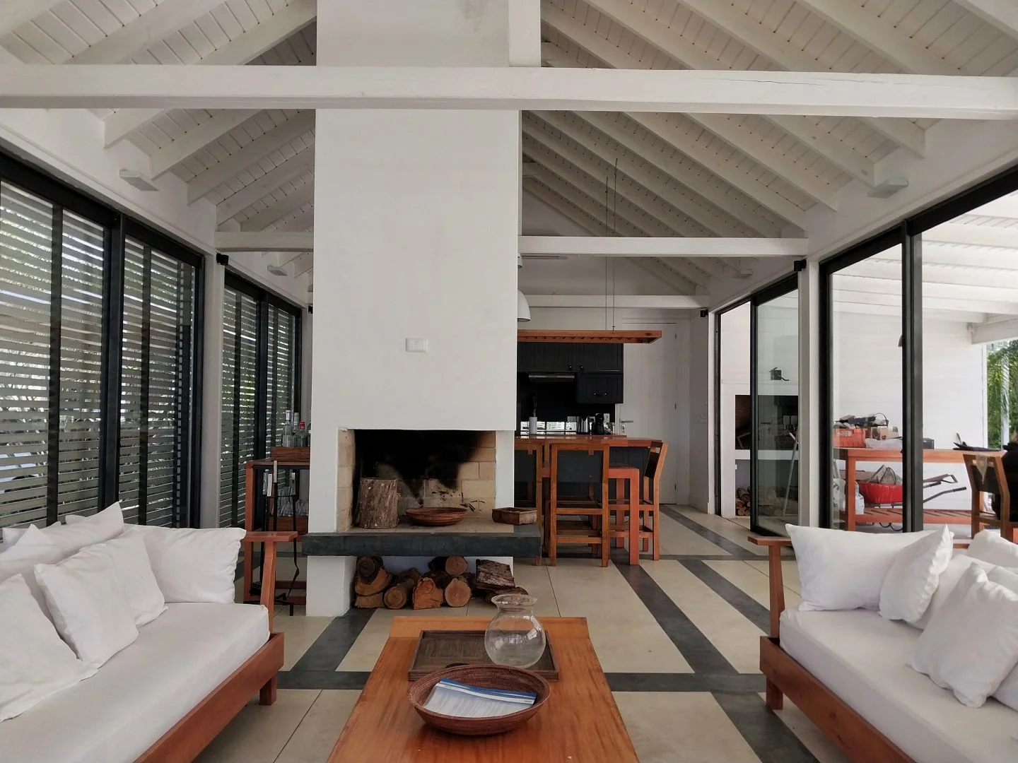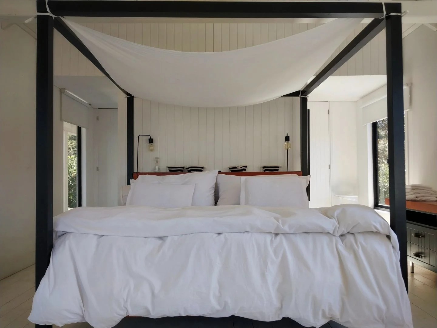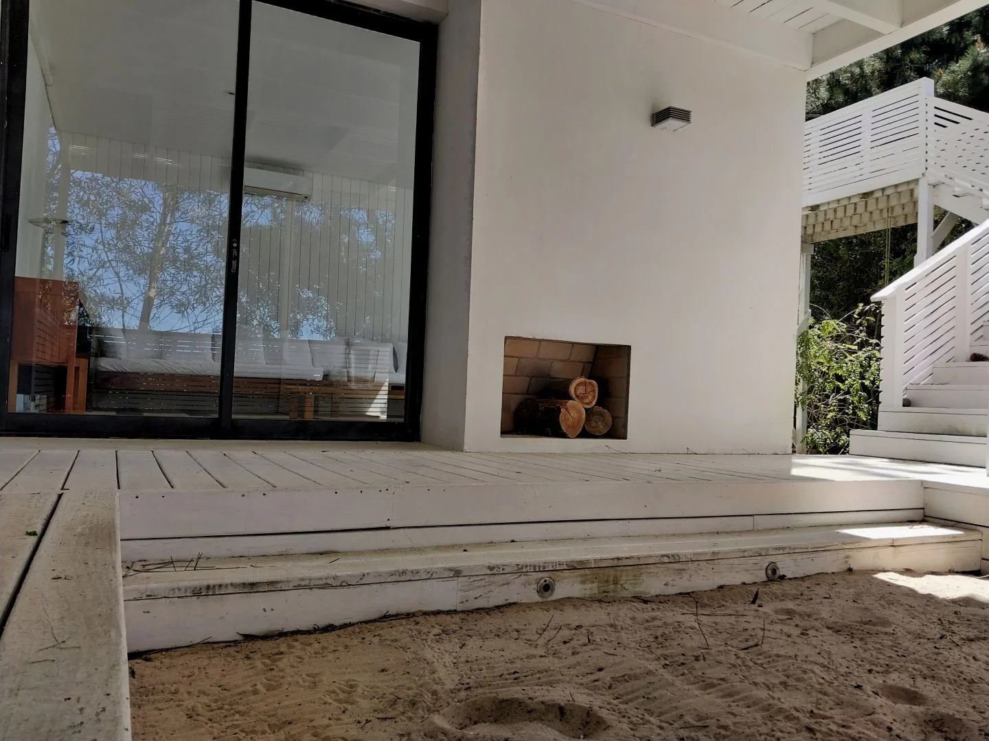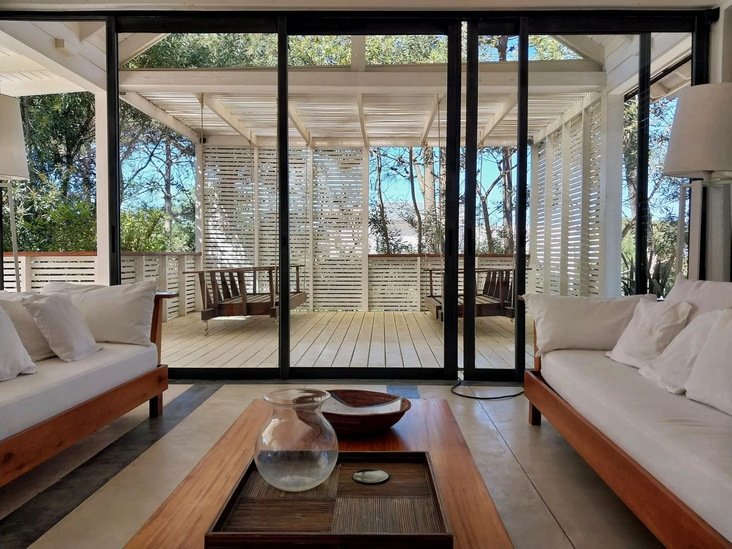 A través de las galerías, donde encontramos algunos livings exteriores, fogones, vamos al bloque de atrás donde está la sala de TV, las cuatro suites, una de ellas con vestidor, y dos kitchenette una en cada planta..