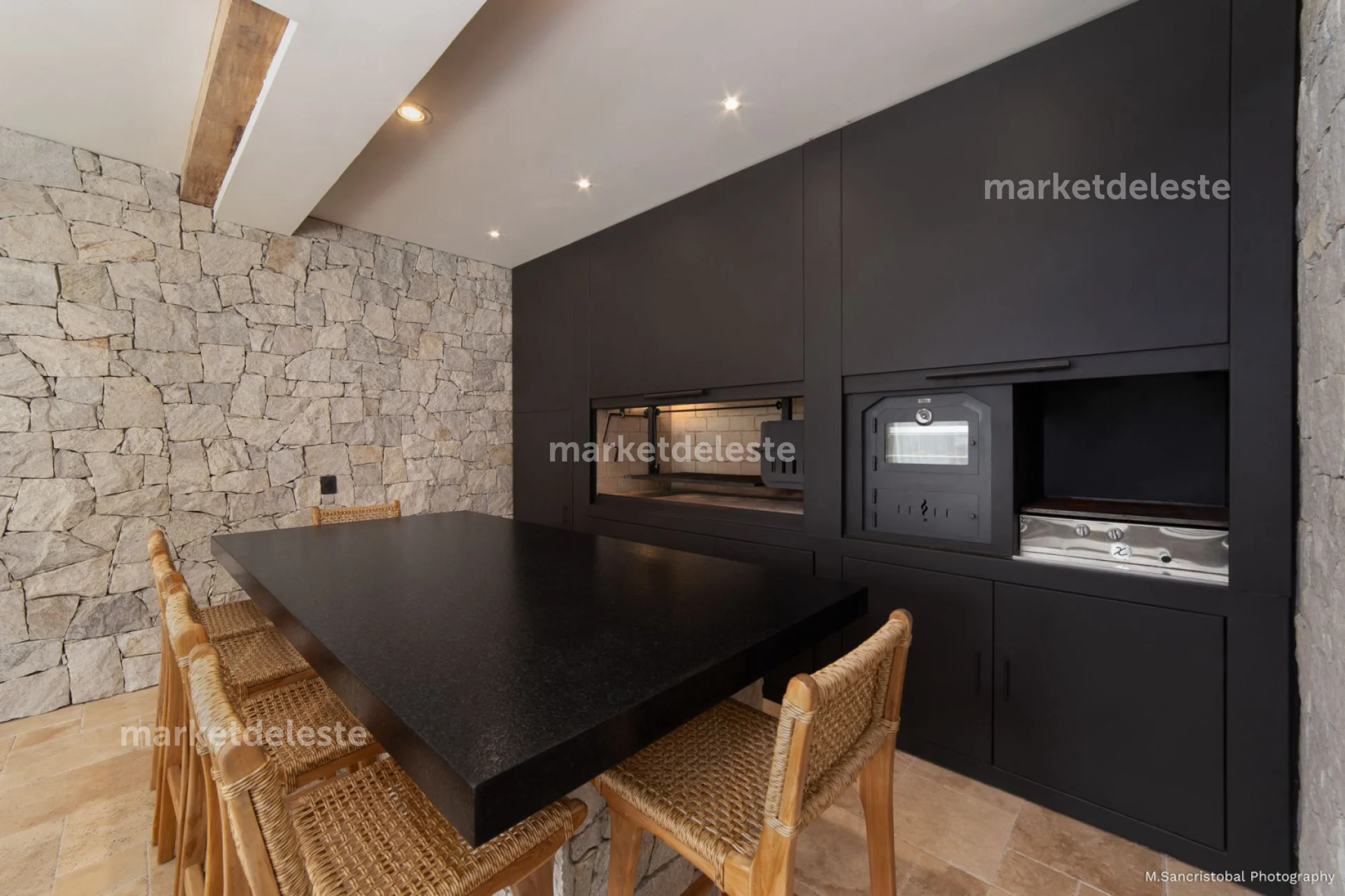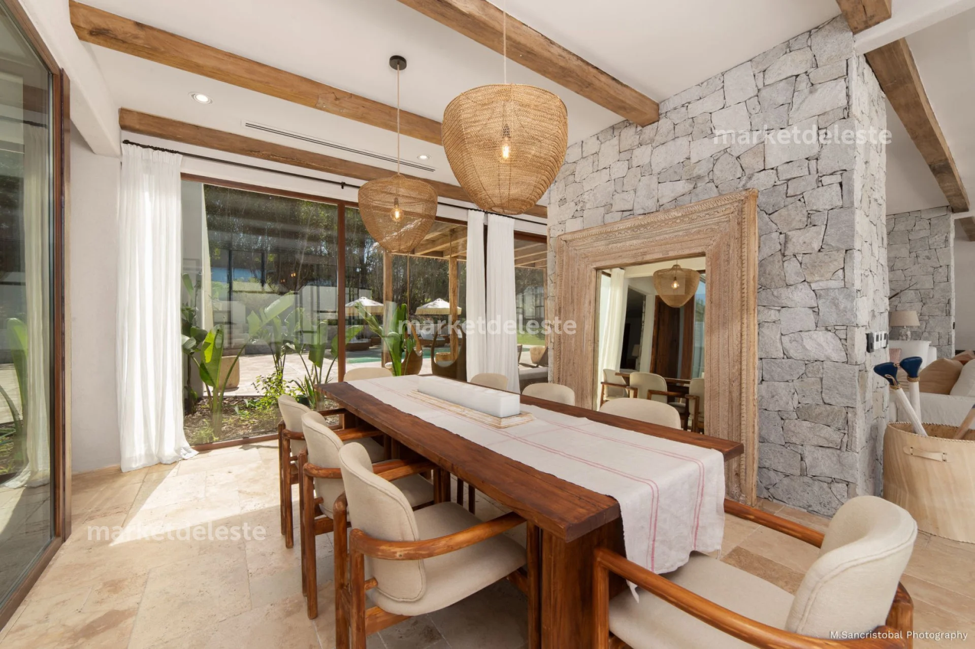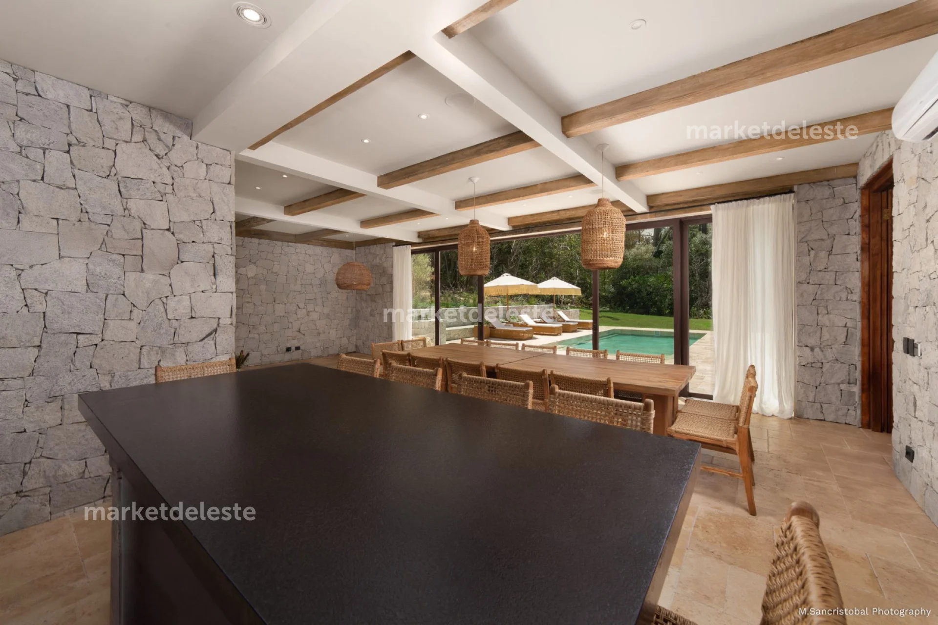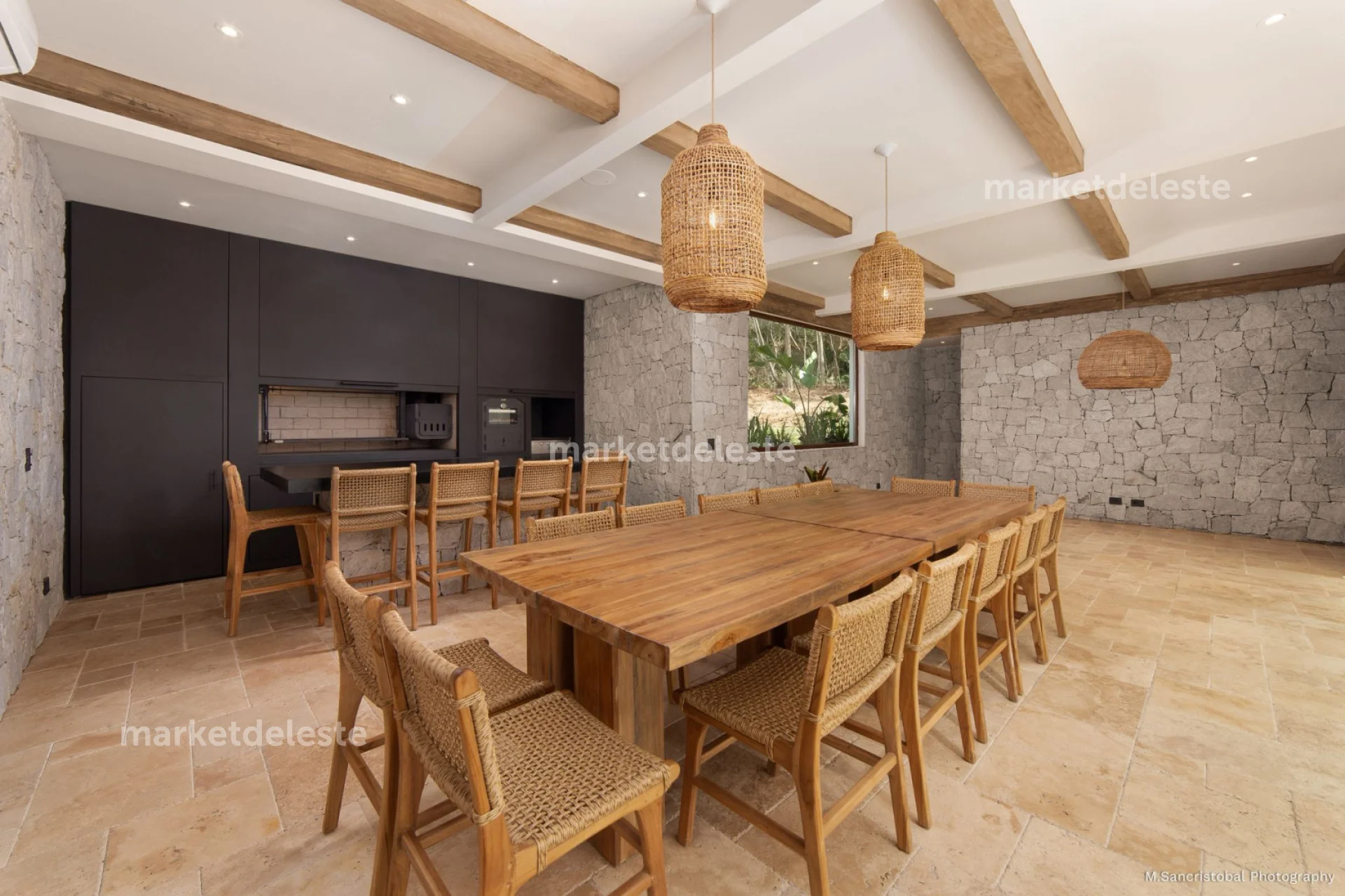 Calidad Constructiva y Detalles Únicos: Pisos interiores y exteriores en travertino, al igual que la piscina. Vigas de techo en teka, puertas talladas a mano con diseños únicos y a medida, bachas de piedra: Todo traído especialmente de Indonesia. Aproximadamente 15 macetas de piedra decorativas traídas especialmente. Grifería Robinett en cocina y toilette. Amplios placares y excelente capacidad de guardado en toda la propiedad. Sistema de musicalización integrado en área de piscina, parrillero y living. Sistema domótico: iluminación, aire acondicionado y música controlados mediante aplicación móvil.