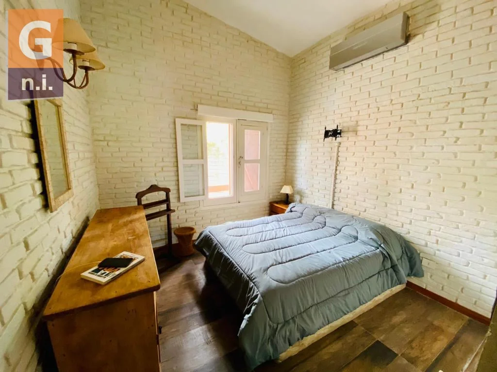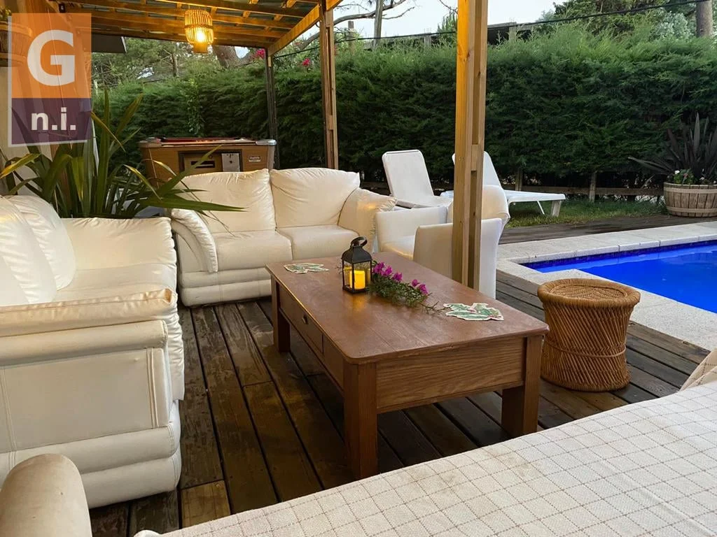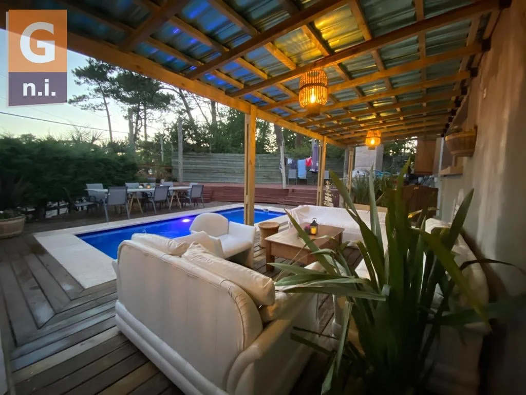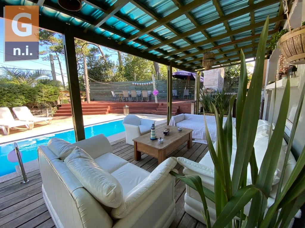 La casa cuenta con piscina exterior climatizada, Playroom, parrillero, horno de barro y jardín, y un deck de madera techado.