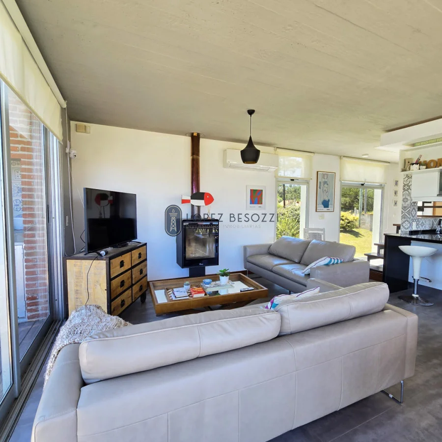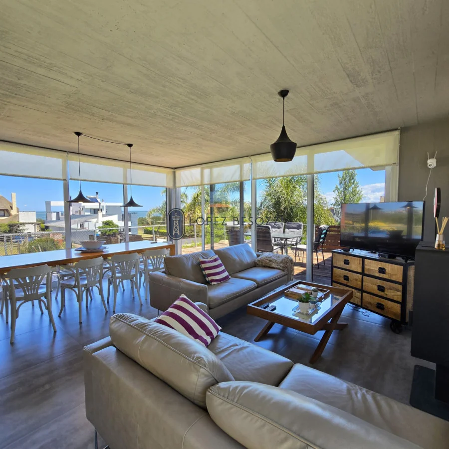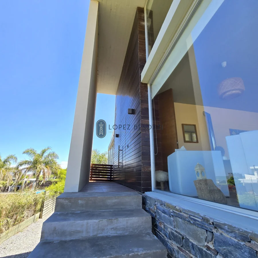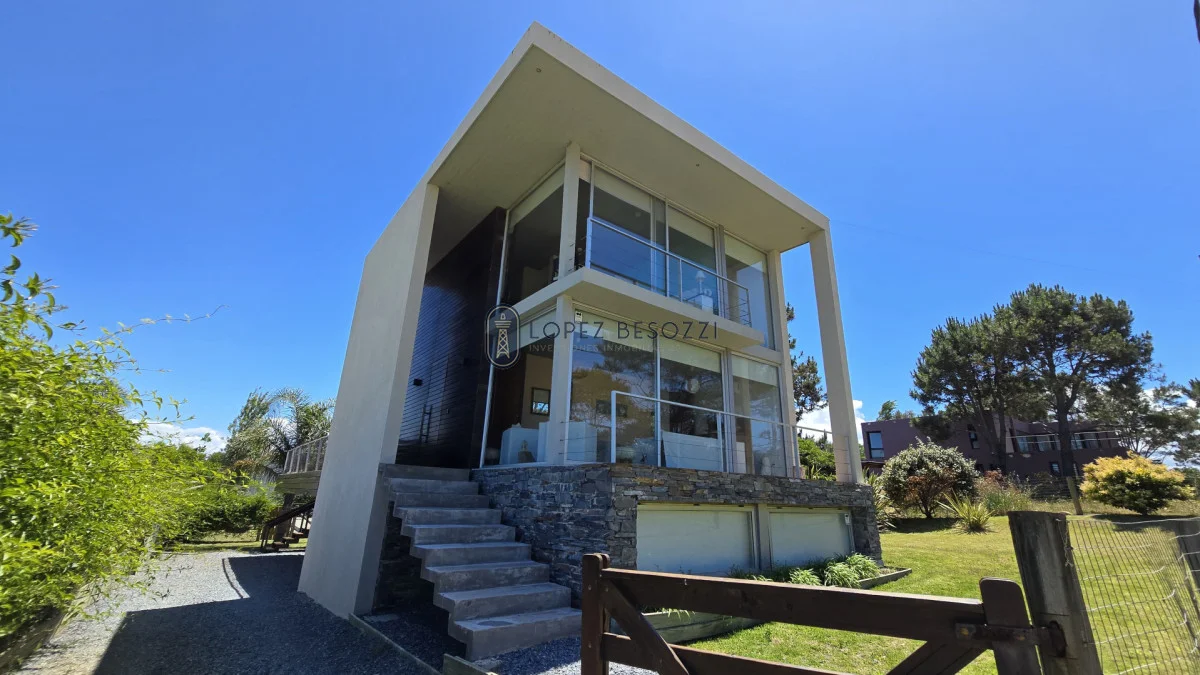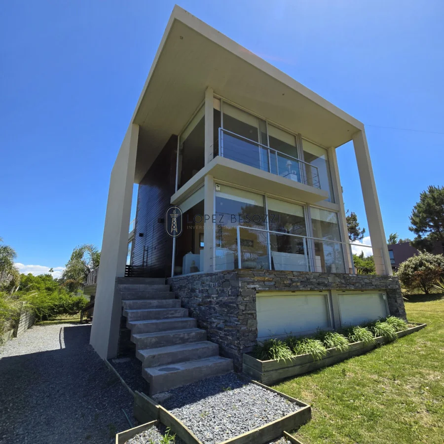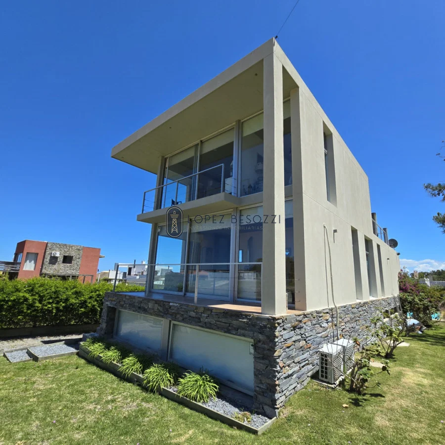 Sobre un amplio terreno de 900m² y frente de 20metros totalmente parquizado de amplia variedad de plantas con un mantenimiento excelente gracias al riego automático y cercado perimetralmente con malla electrosoldada. Propiedad de estilo minimalista de fachada impresionante contando con varios niveles; el principal de importante hall de ingreso revestido en madera dispone de living - comedor con estufa a leña de alto rendimiento enormes ventanales en aluminio con vistas al jardín de la casa, mar y a su vez dan acceso a terraza la cual cuenta con el parrillero. Cocina integrada con barra en granito negro y muebles empotrados a medida (aéreos y bajo mesada); al frente living o estar diario el cual también posee estufa de alto rendimiento y vista parcial al mar; baño completo con mampara de cristal.
