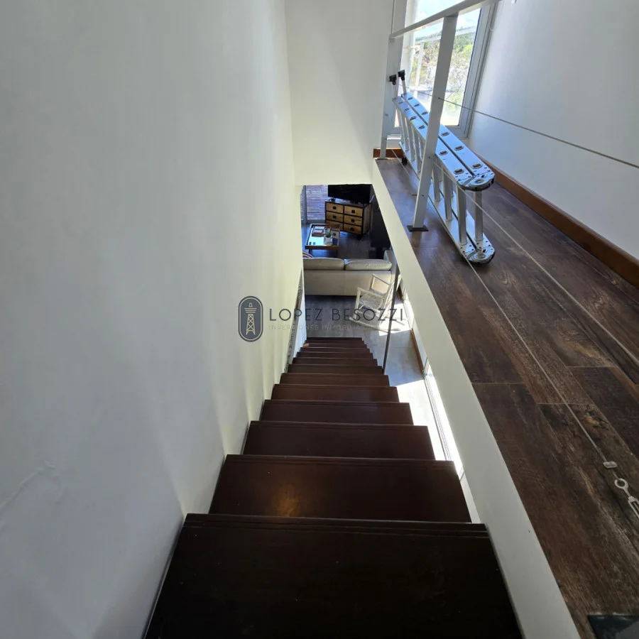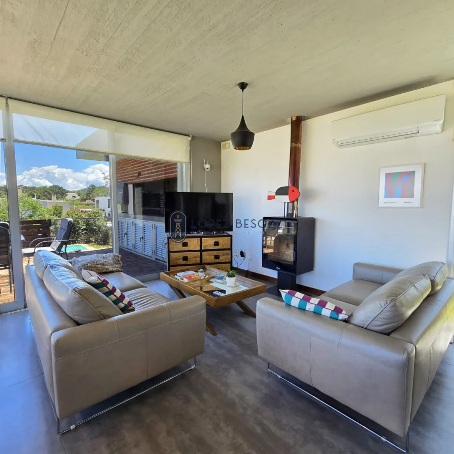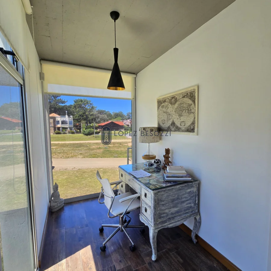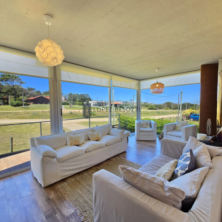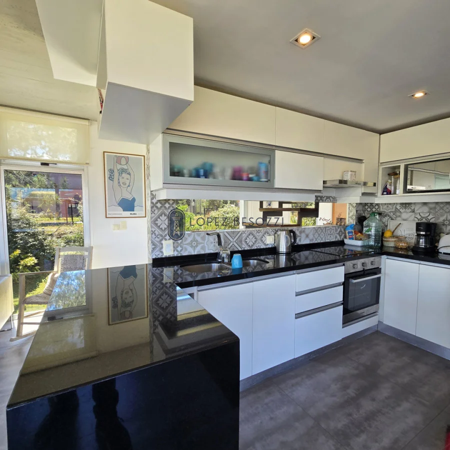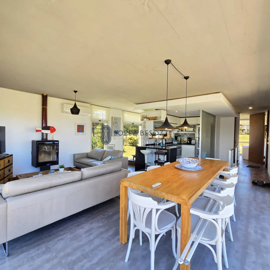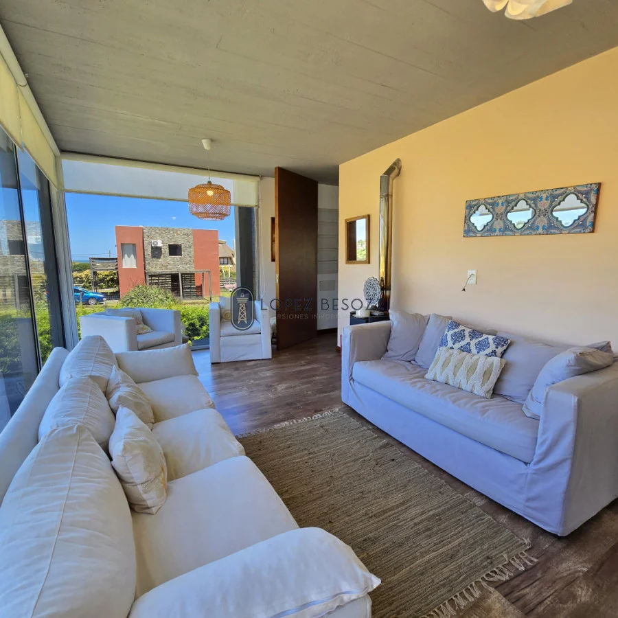 Sobre un amplio terreno de 900m² y frente de 20metros totalmente parquizado de amplia variedad de plantas con un mantenimiento excelente gracias al riego automático y cercado perimetralmente con malla electrosoldada. Propiedad de estilo minimalista de fachada impresionante contando con varios niveles; el principal de importante hall de ingreso revestido en madera dispone de living - comedor con estufa a leña de alto rendimiento enormes ventanales en aluminio con vistas al jardín de la casa, mar y a su vez dan acceso a terraza la cual cuenta con el parrillero. Cocina integrada con barra en granito negro y muebles empotrados a medida (aéreos y bajo mesada); al frente living o estar diario el cual también posee estufa de alto rendimiento y vista parcial al mar; baño completo con mampara de cristal.