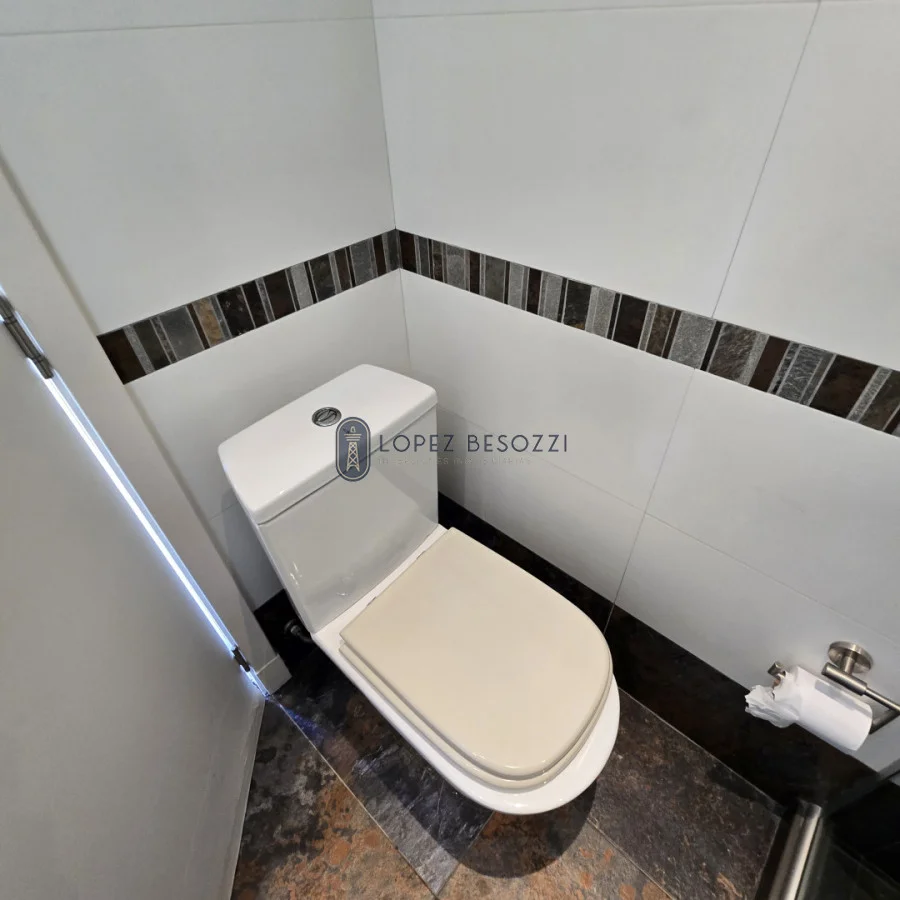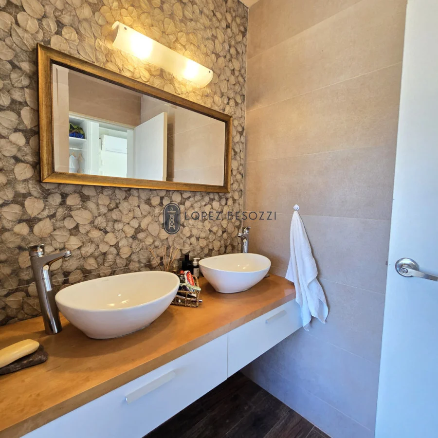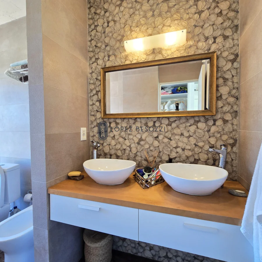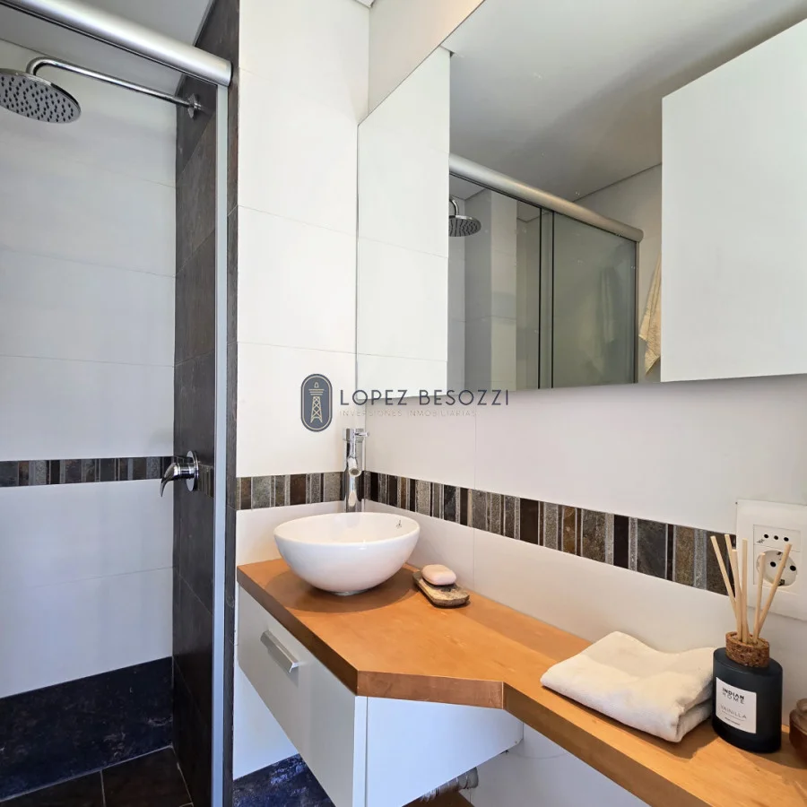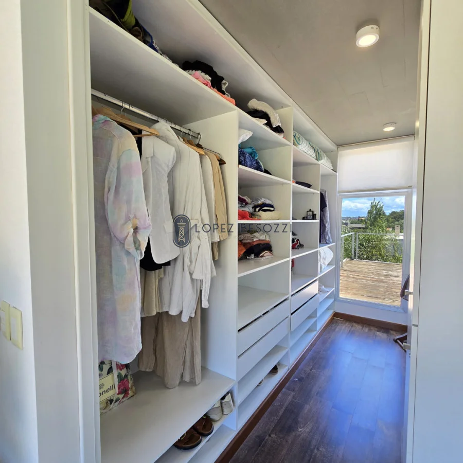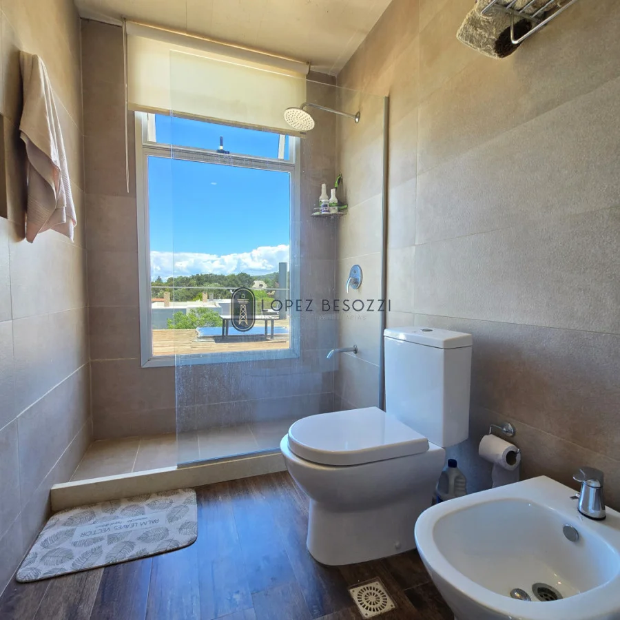 Sobre un amplio terreno de 900m² y frente de 20metros totalmente parquizado de amplia variedad de plantas con un mantenimiento excelente gracias al riego automático y cercado perimetralmente con malla electrosoldada. Propiedad de estilo minimalista de fachada impresionante contando con varios niveles; el principal de importante hall de ingreso revestido en madera dispone de living - comedor con estufa a leña de alto rendimiento enormes ventanales en aluminio con vistas al jardín de la casa, mar y a su vez dan acceso a terraza la cual cuenta con el parrillero. Cocina integrada con barra en granito negro y muebles empotrados a medida (aéreos y bajo mesada); al frente living o estar diario el cual también posee estufa de alto rendimiento y vista parcial al mar; baño completo con mampara de cristal.