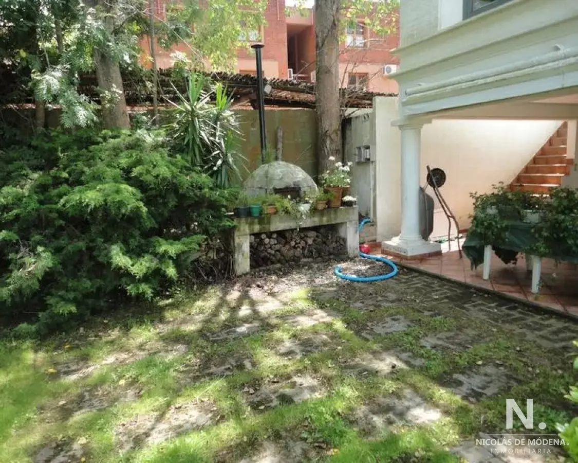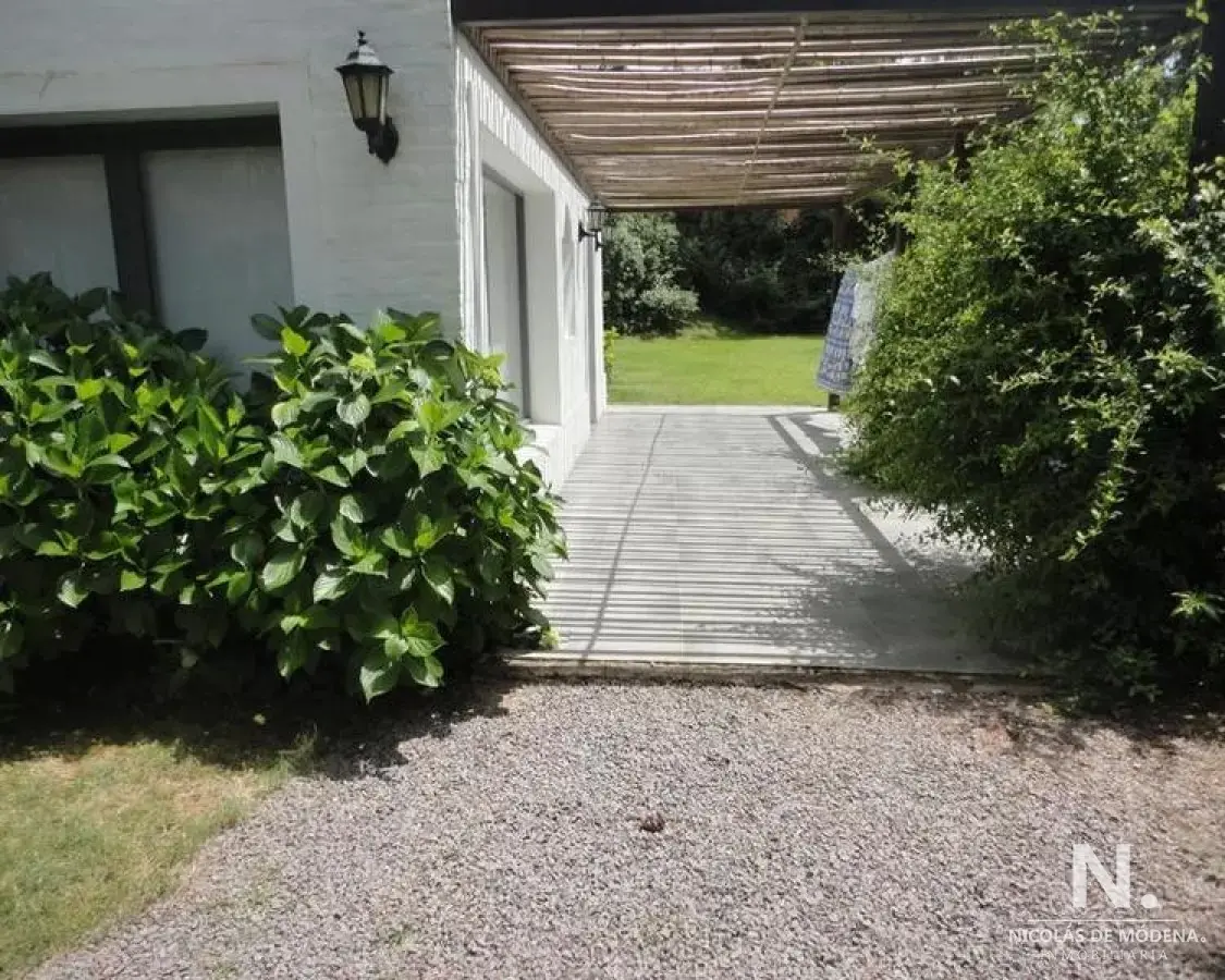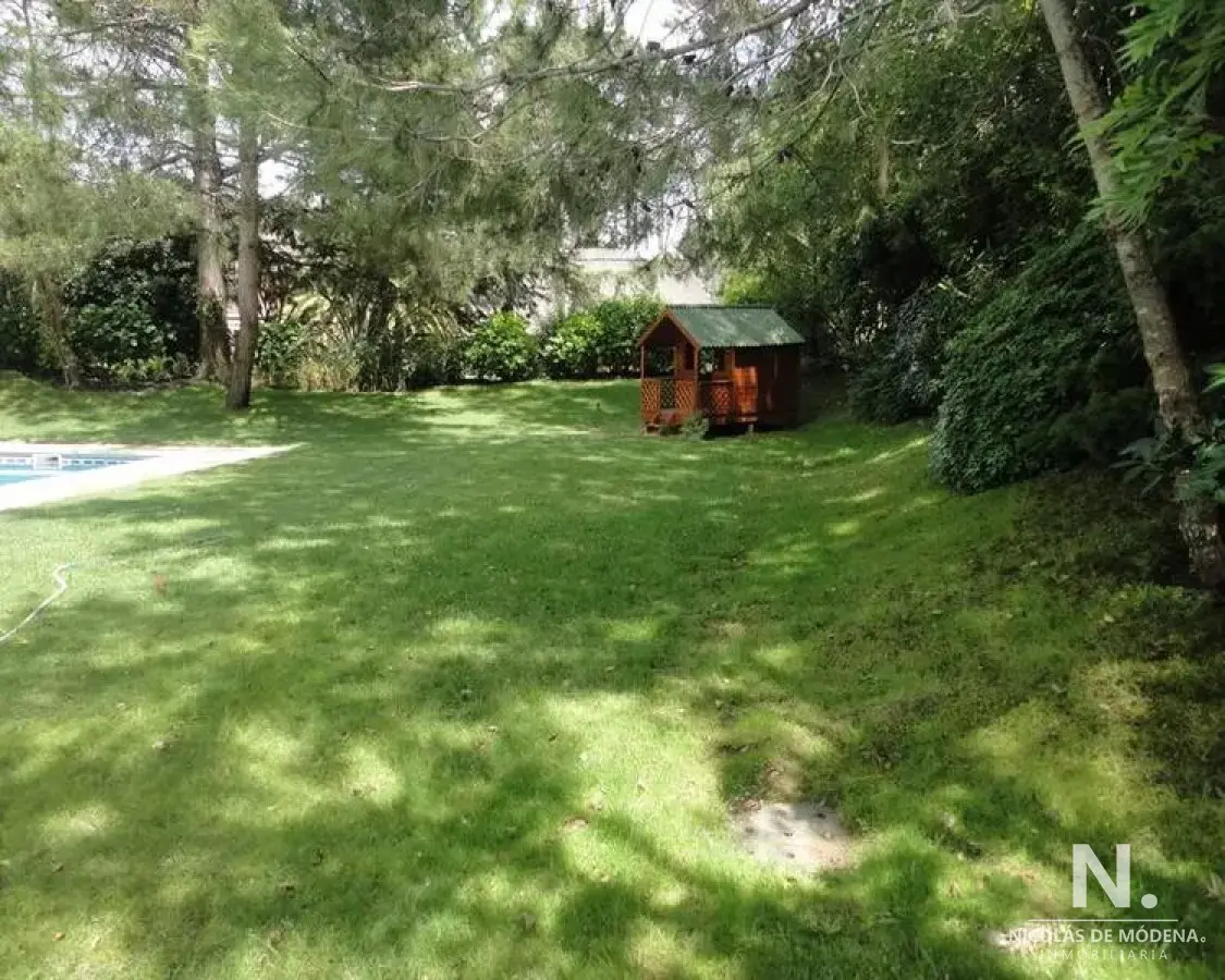 Jardín que rodea toda la casa, con cerramiento de cerco vivo, ofreciendo una vista despejada y verde desde cualquier rincón. Aquí se ubica el parrillero techado con living exterior y excepcional piscina climatizada.