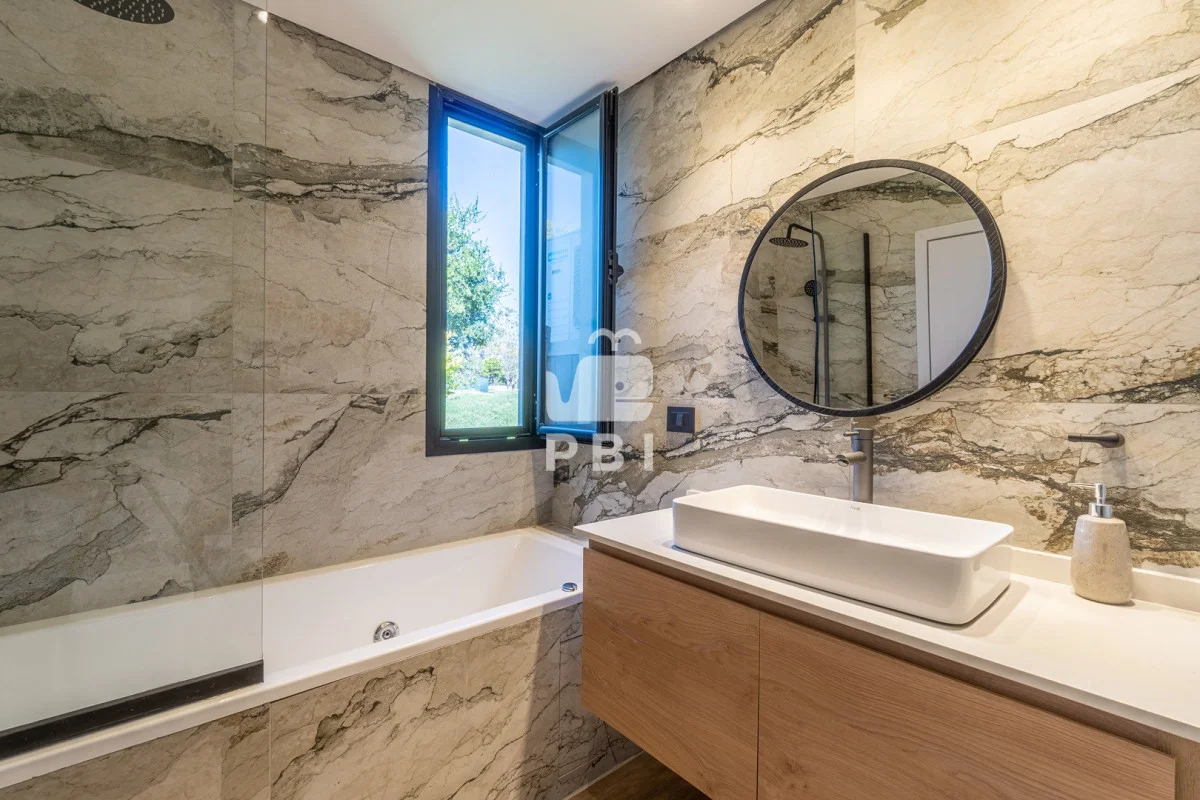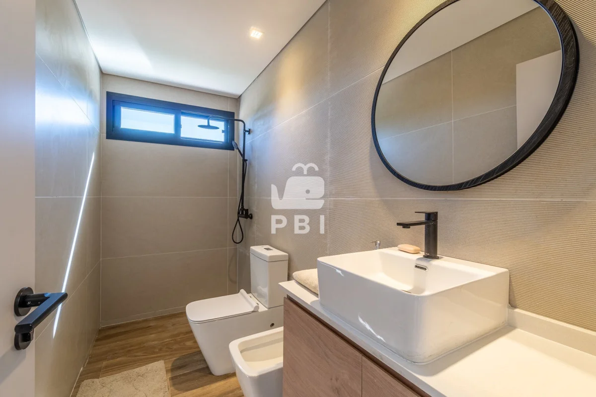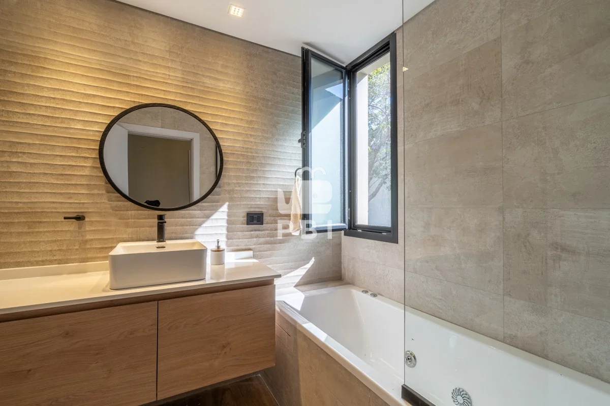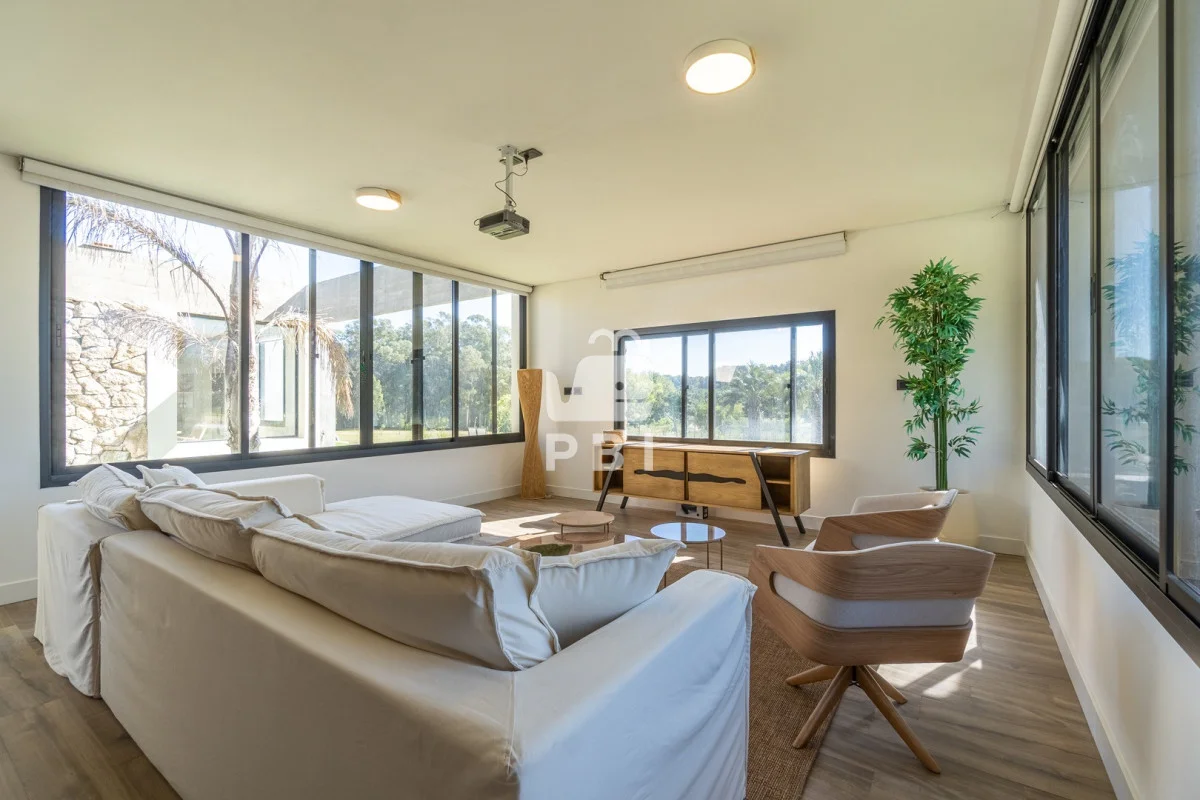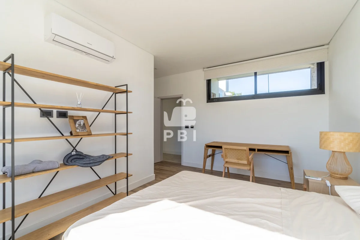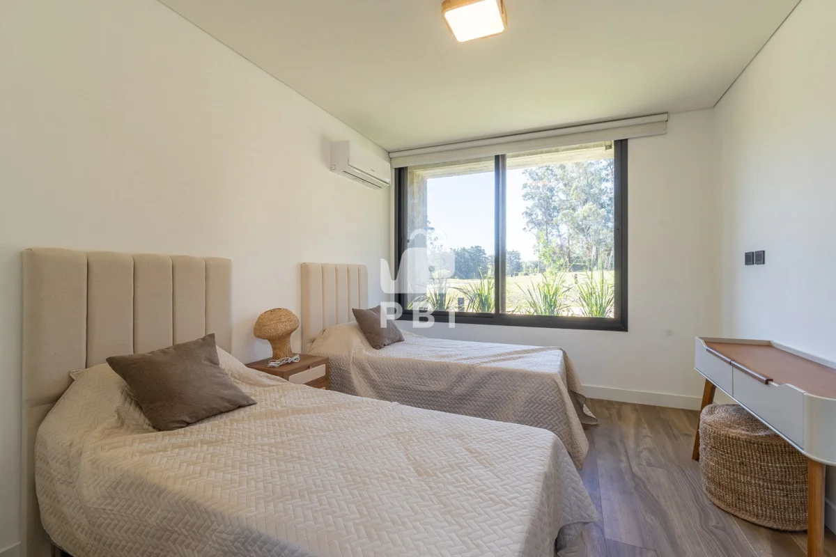 El área privada se compone de cuatro dormitorios: suite principal, suite de huéspedes y dos dormitorios adicionales que comparten baño. Además, cuenta con playroom, ideal como espacio de recreación o escritorio.