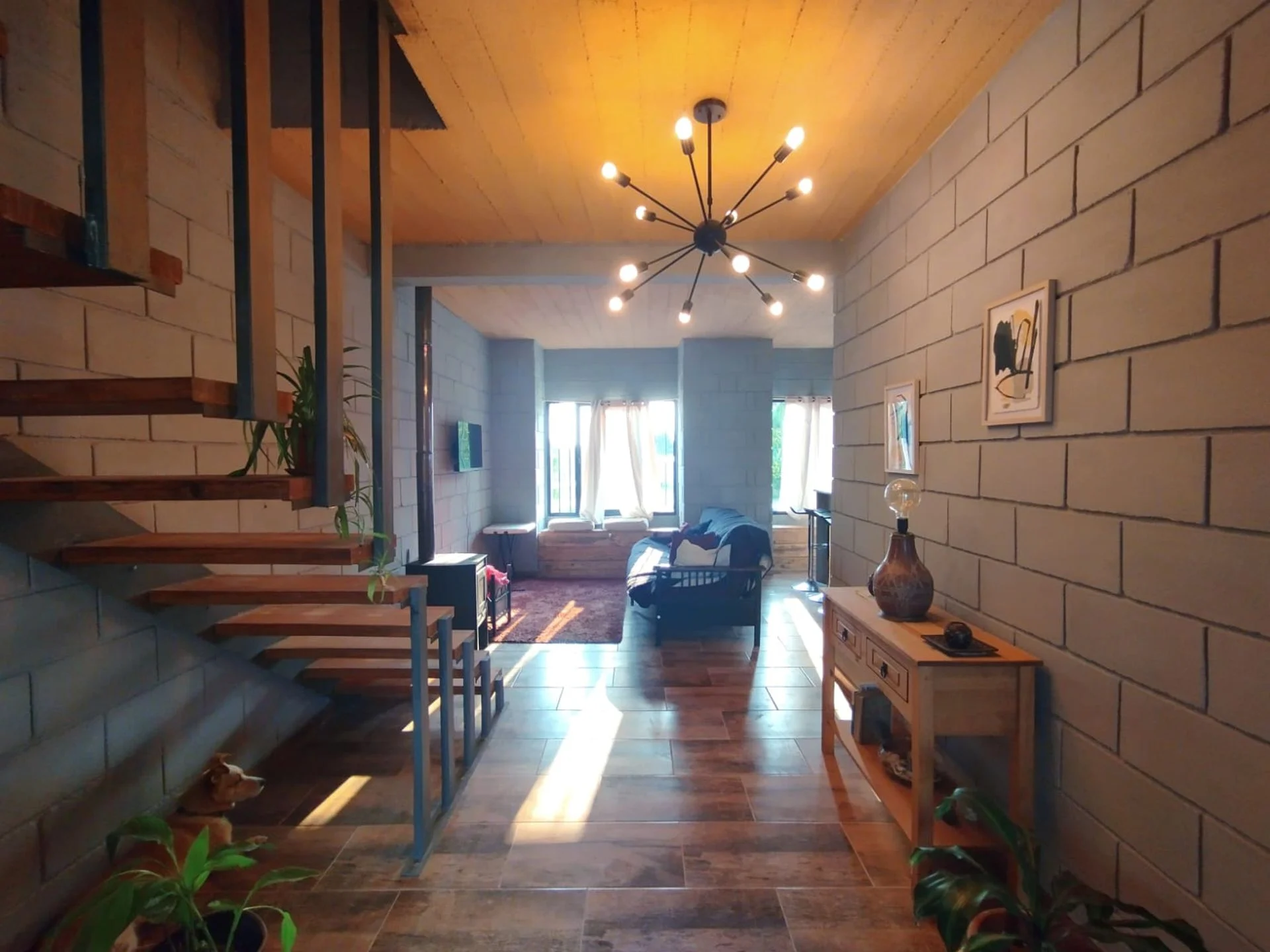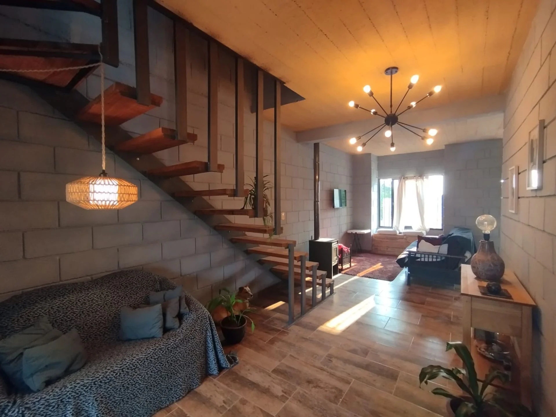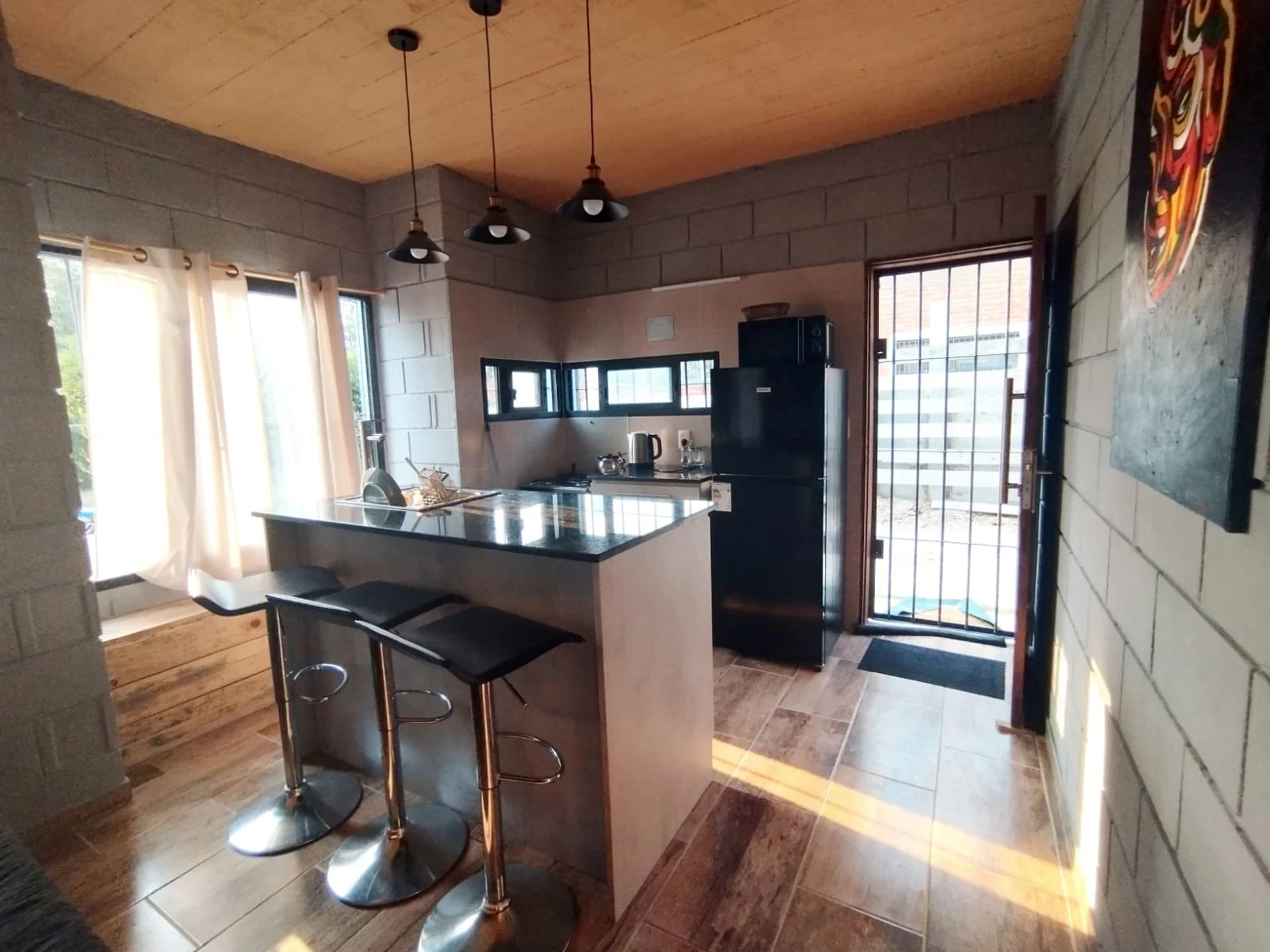 Mientras que la planta de abajo cuenta con otro dormitorio, un baño, cocina con isla integrada al living.