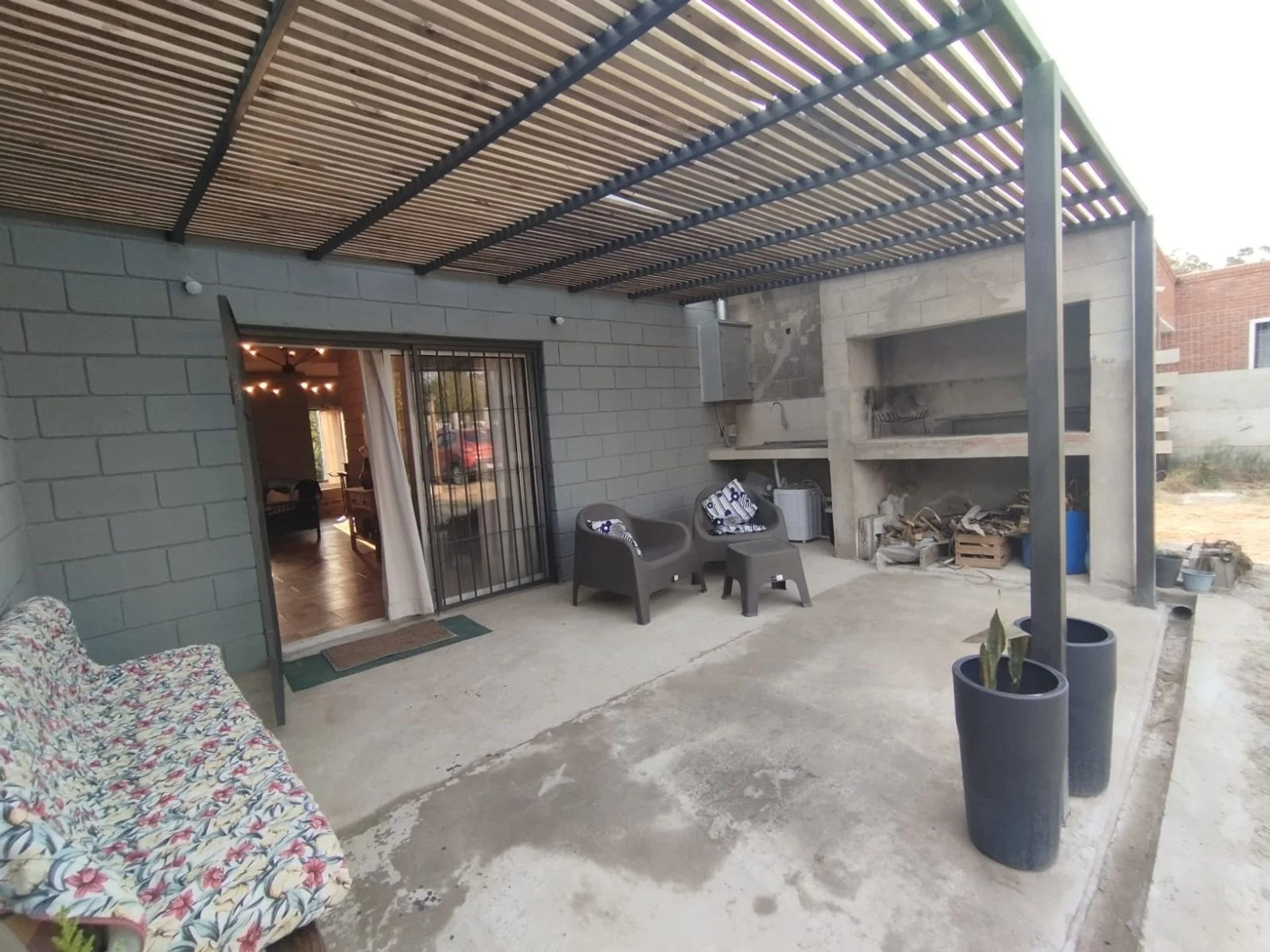 Parrillero Techado con patio verde y espacio para estacionar.