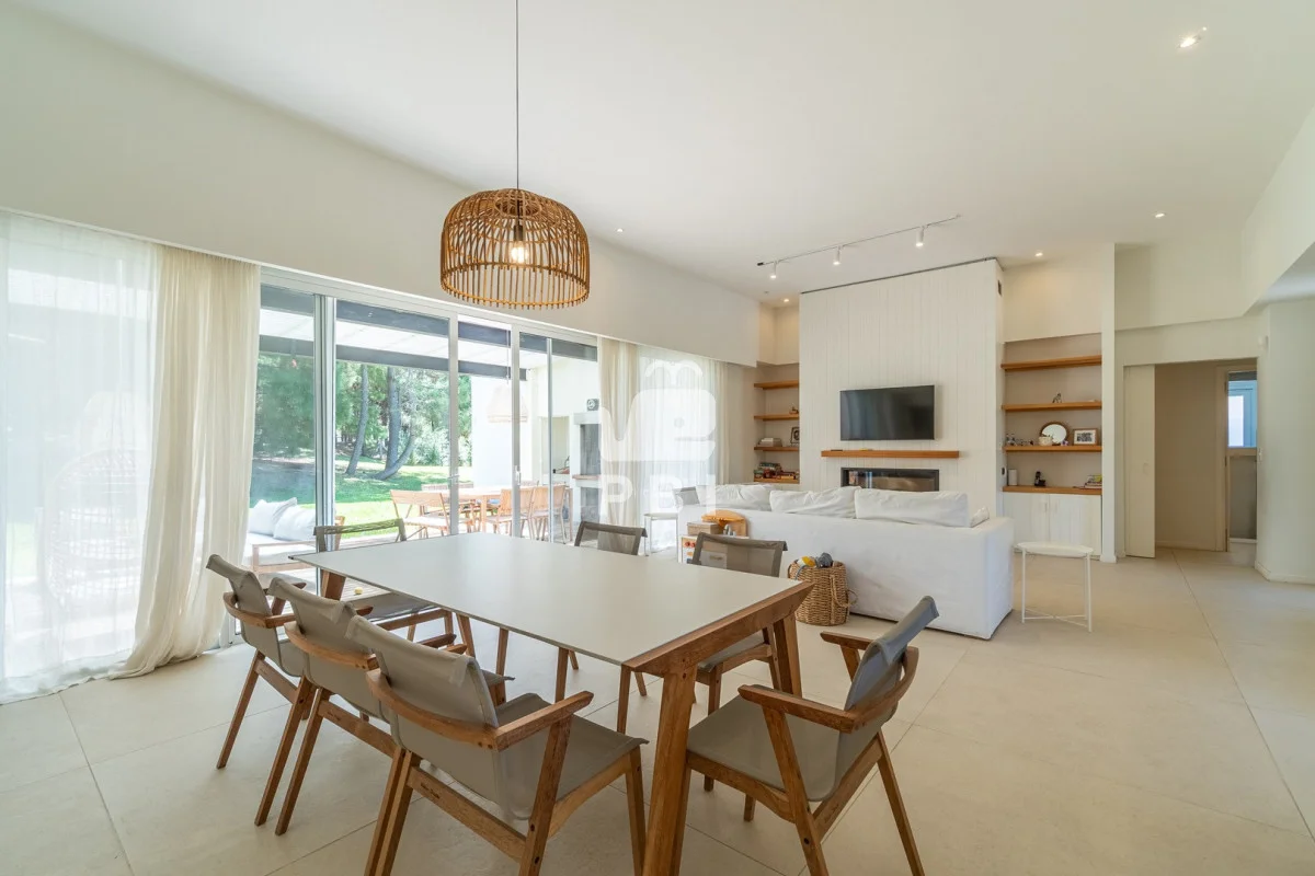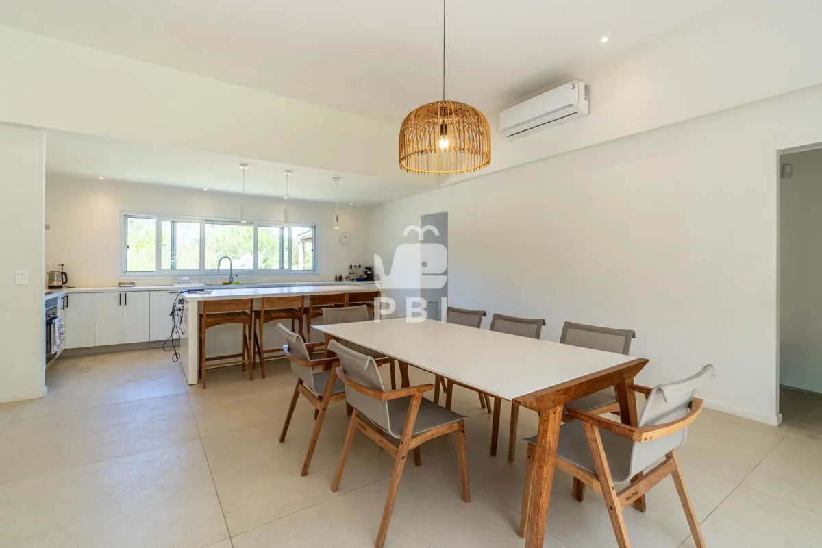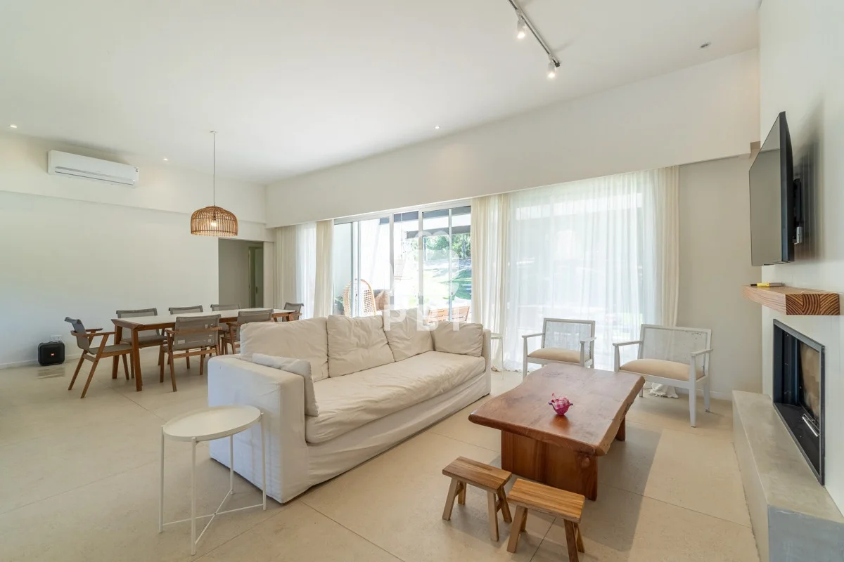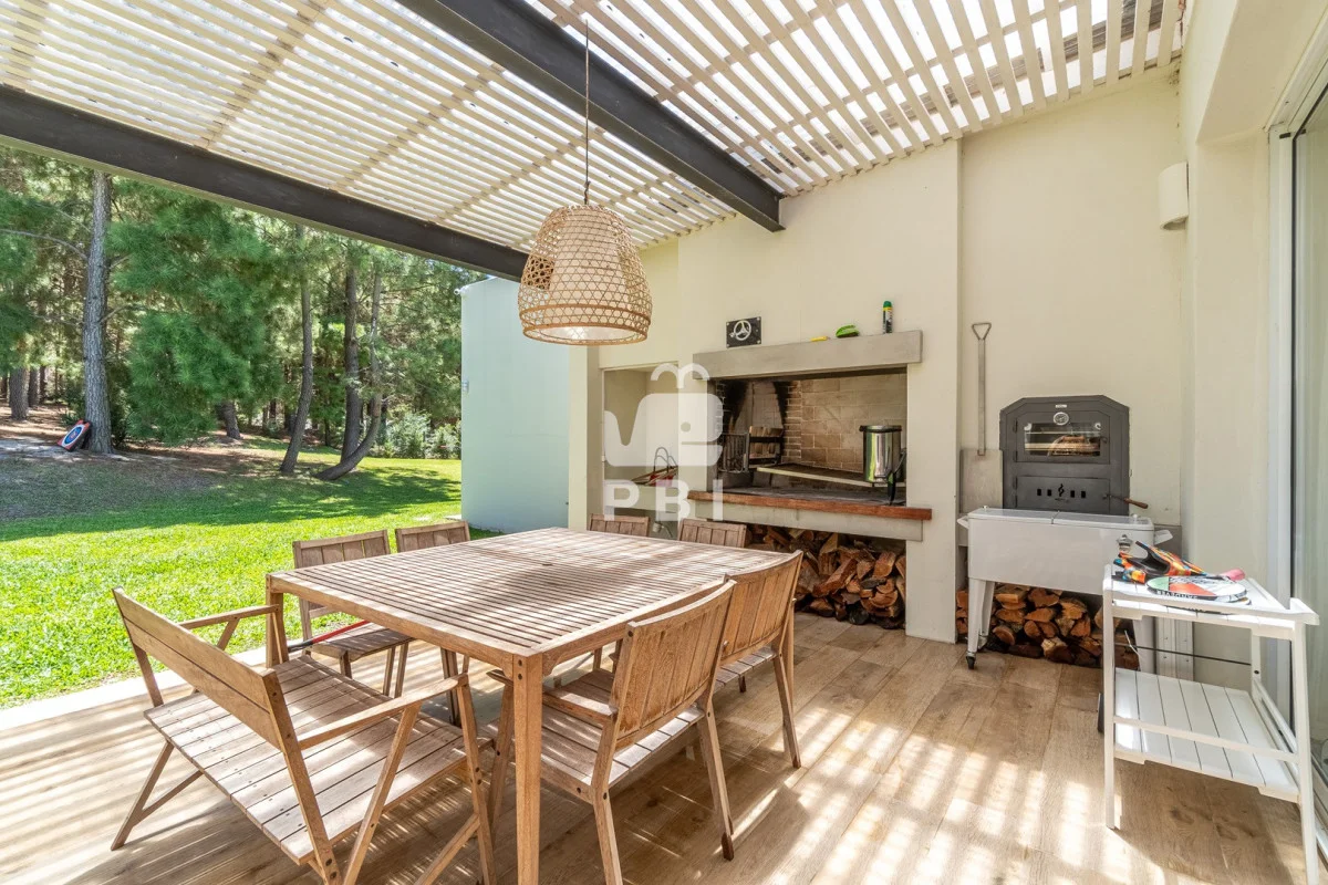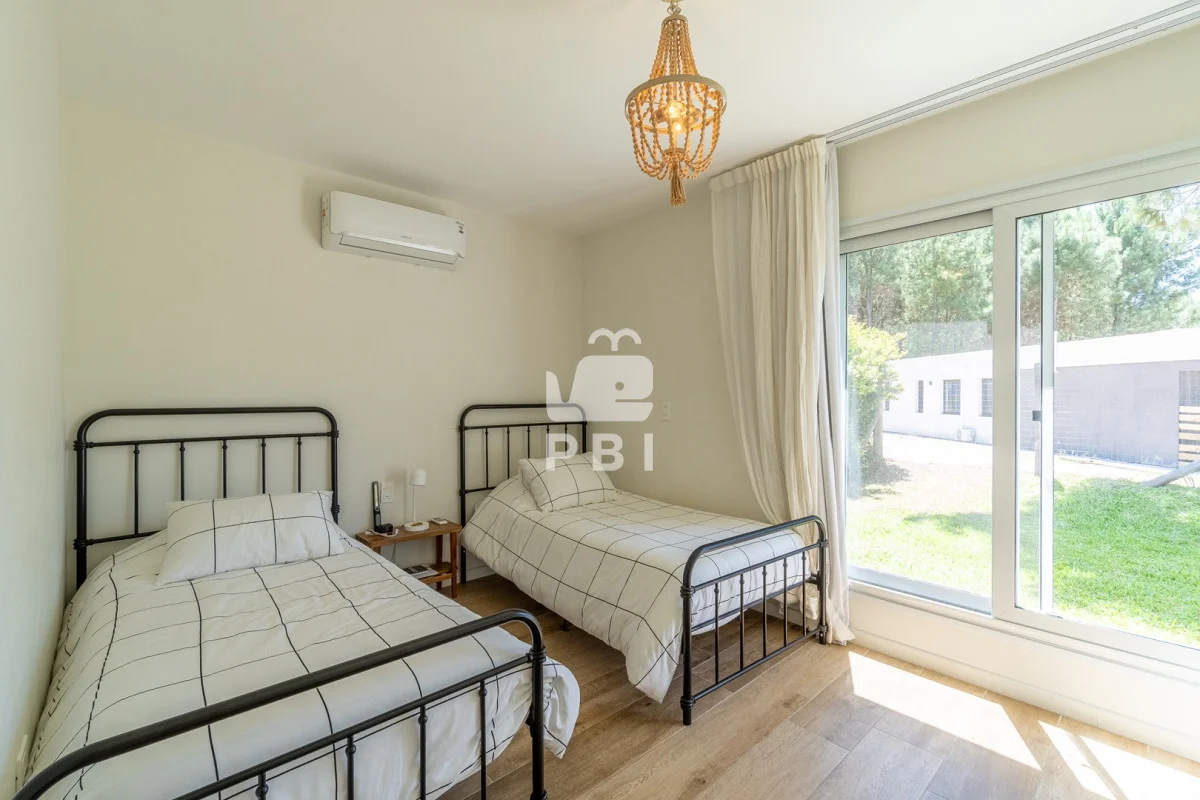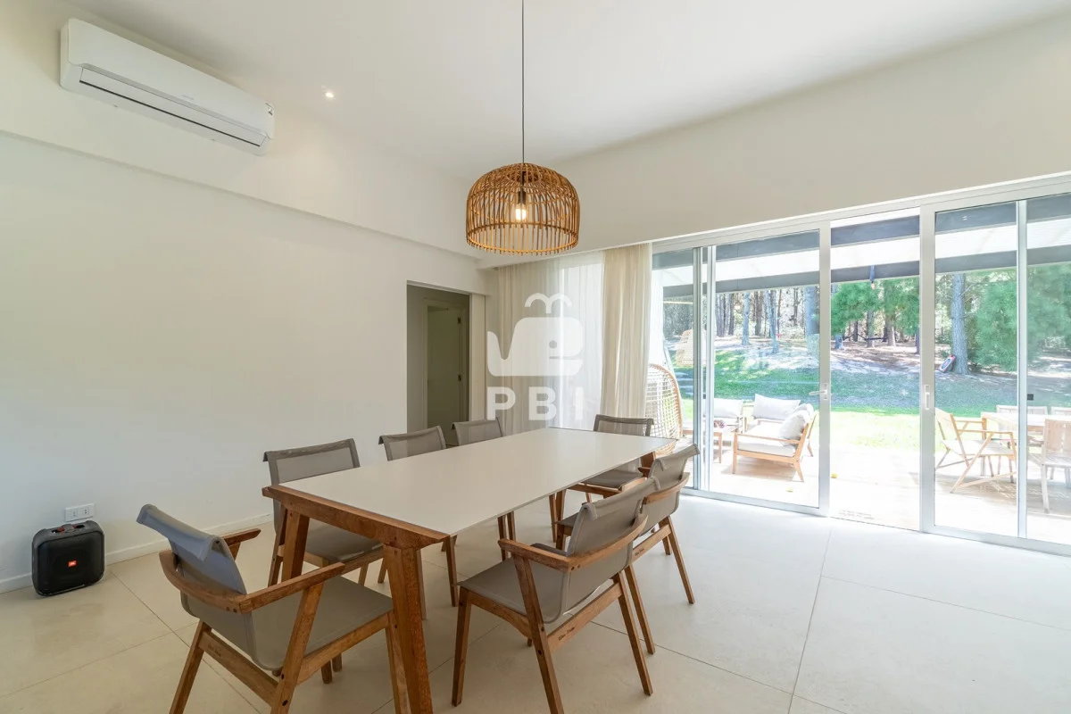 Posee 5 dormitorios (uno de ellos en suite, los demás dormitorios se resuelven en dos sectores, donde cada par de dormitorios comparte un baño), 3 baños, un toilette, living comedor con estufa a leña y cocina integrada. Todos los ambientes se encuentran climatizados mediante Aire Acondicionado.