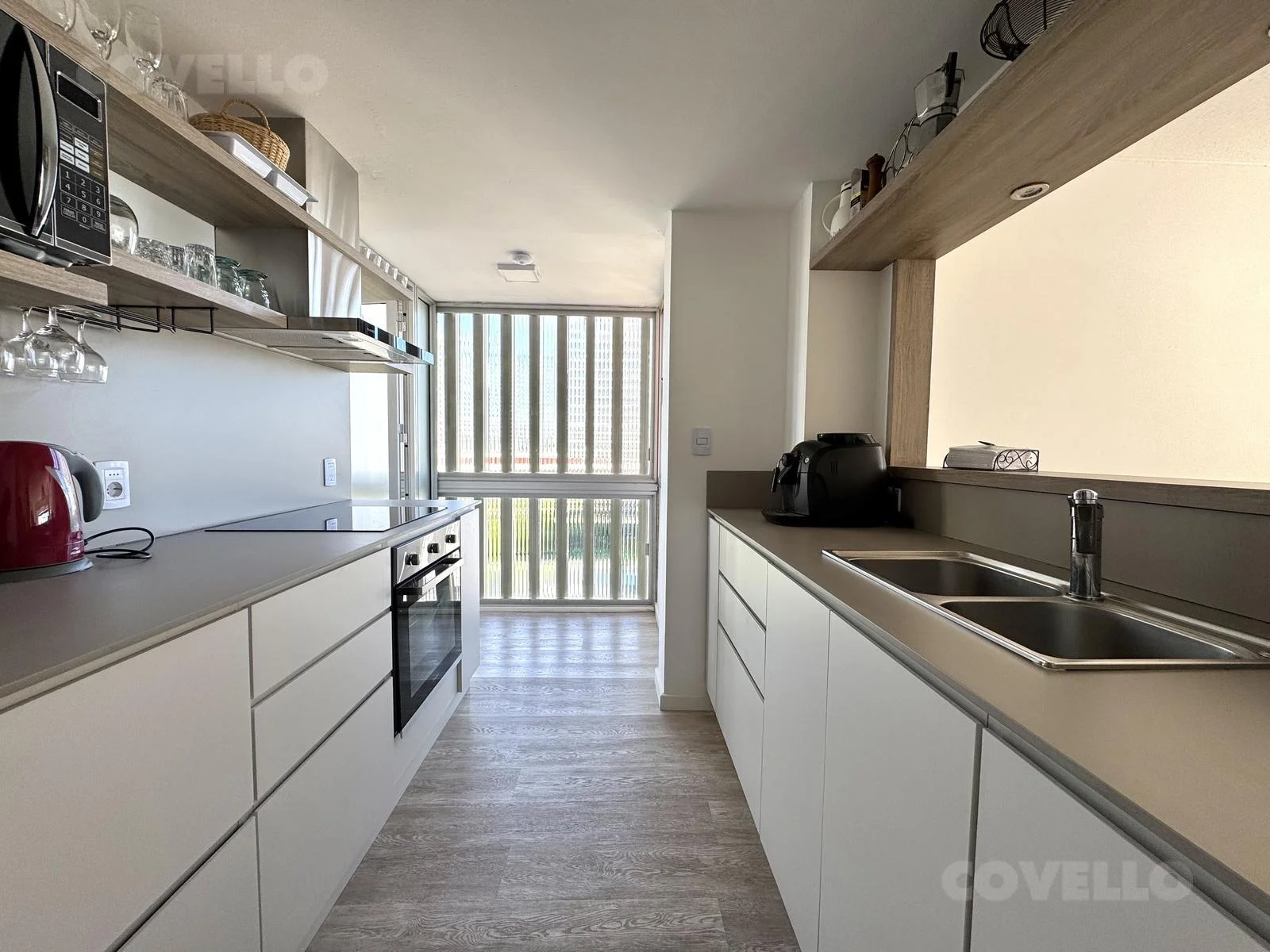 La cocina moderna se integra al living comedor, creando un espacio abierto y versátil.
