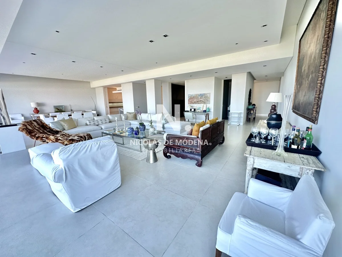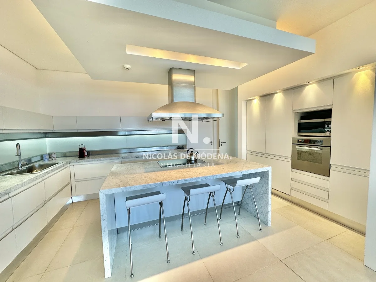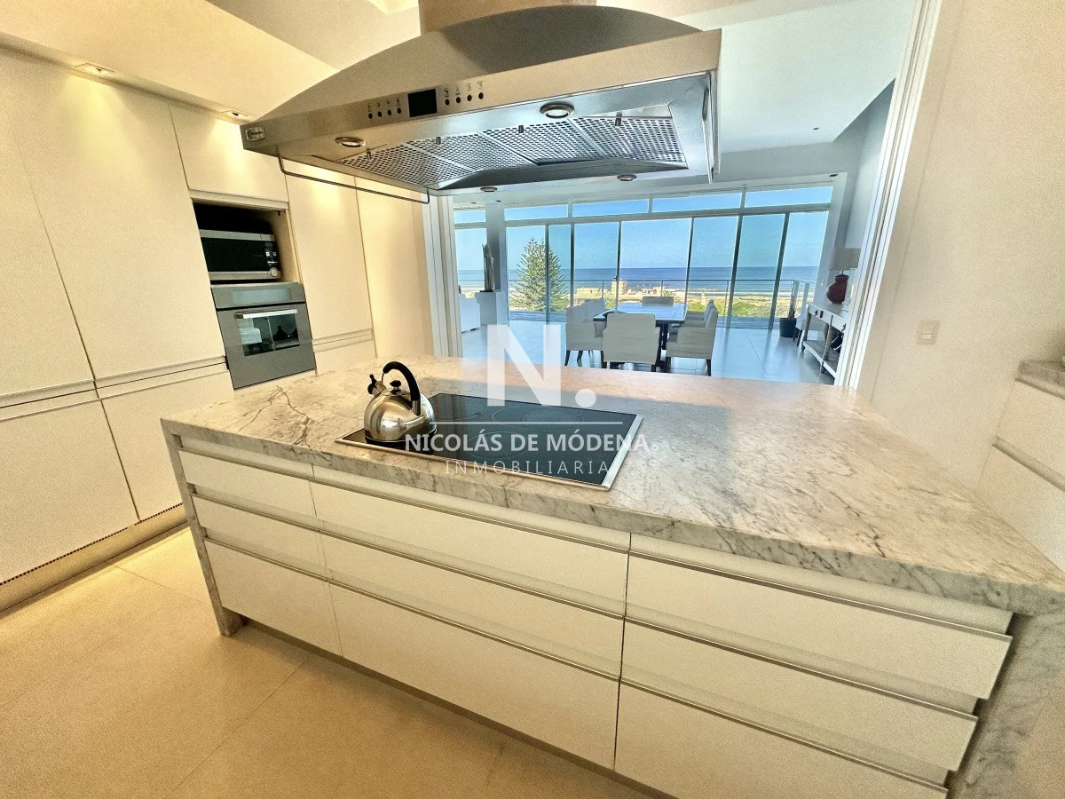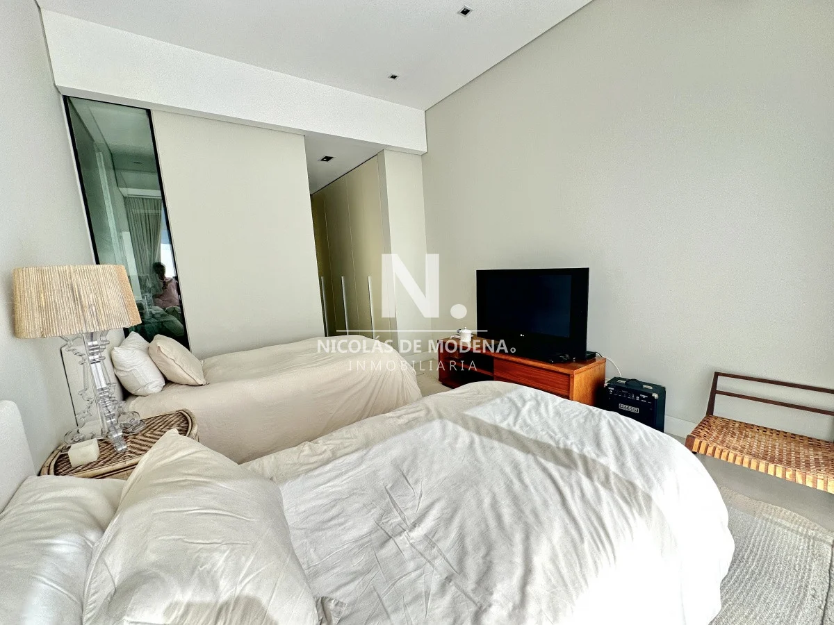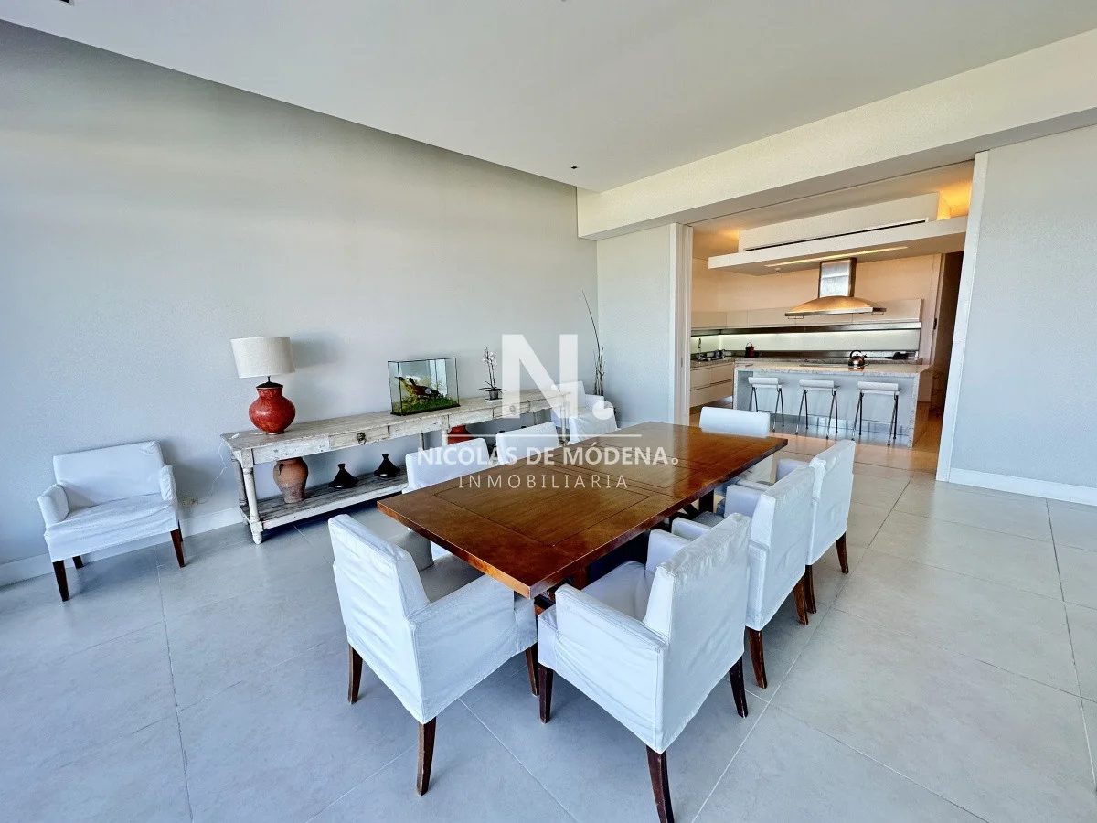 El departamento cuenta con 3 dormitorios en suite, luminoso living-comedor con salida a balcón y vista al mar, cocina integrada (que se puede independizar con puerta deslizante), toilette, área de lavadero con baño, estar con TV y dependencia de servicio exterior. Garaje para dos autos.