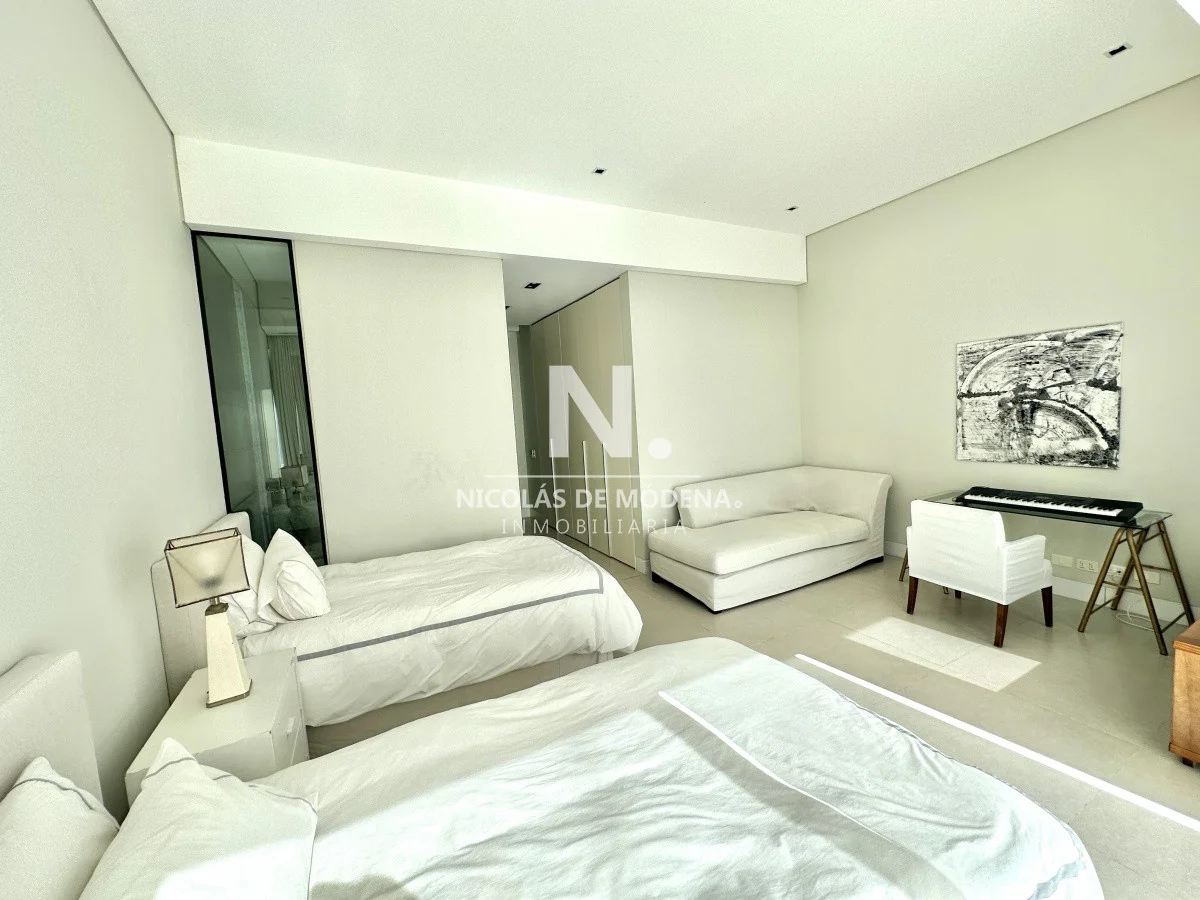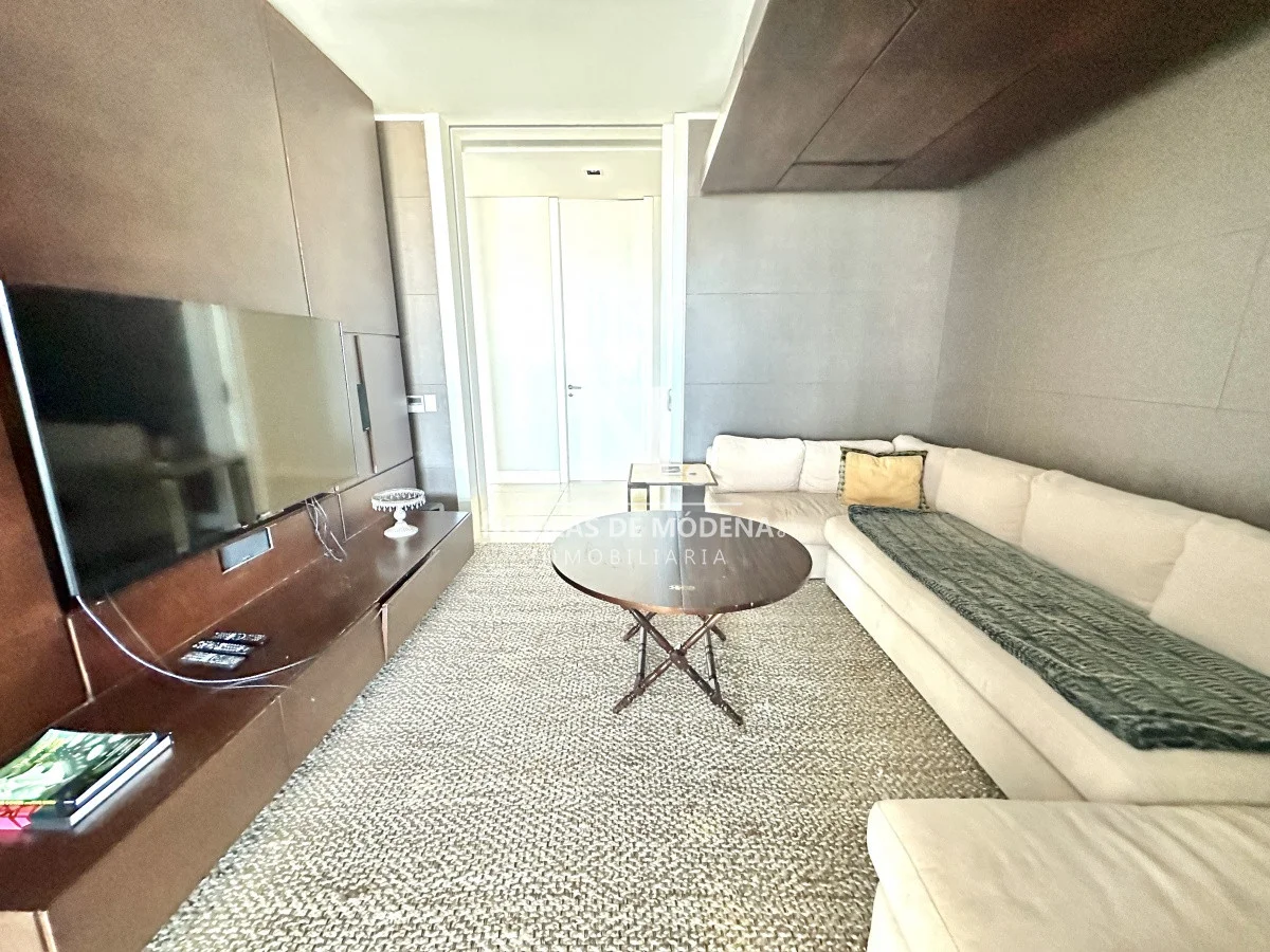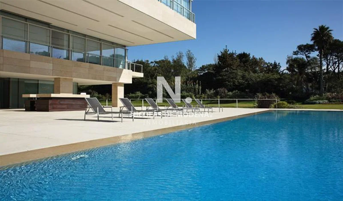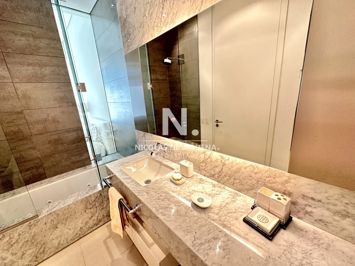 El departamento cuenta con 3 dormitorios en suite, luminoso living-comedor con salida a balcón y vista al mar, cocina integrada (que se puede independizar con puerta deslizante), toilette, área de lavadero con baño, estar con TV y dependencia de servicio exterior. Garaje para dos autos.