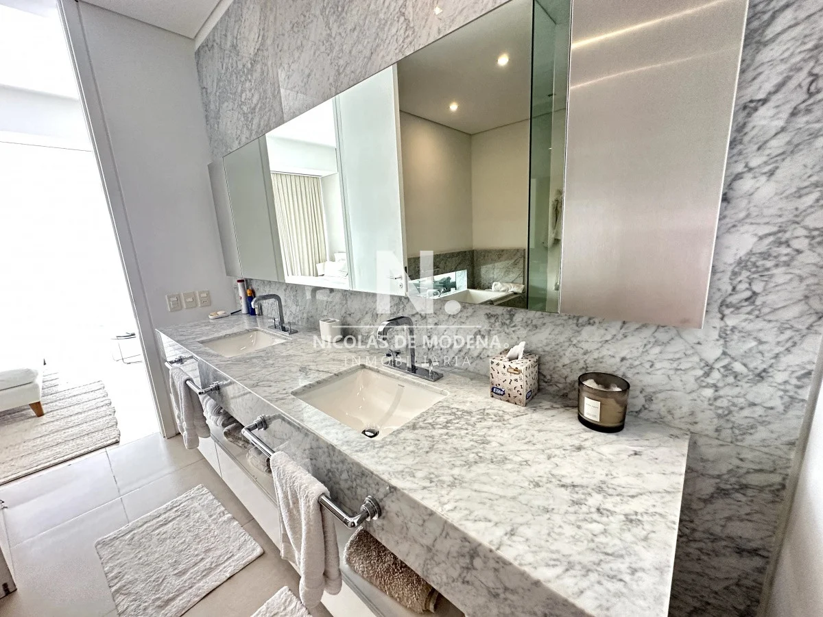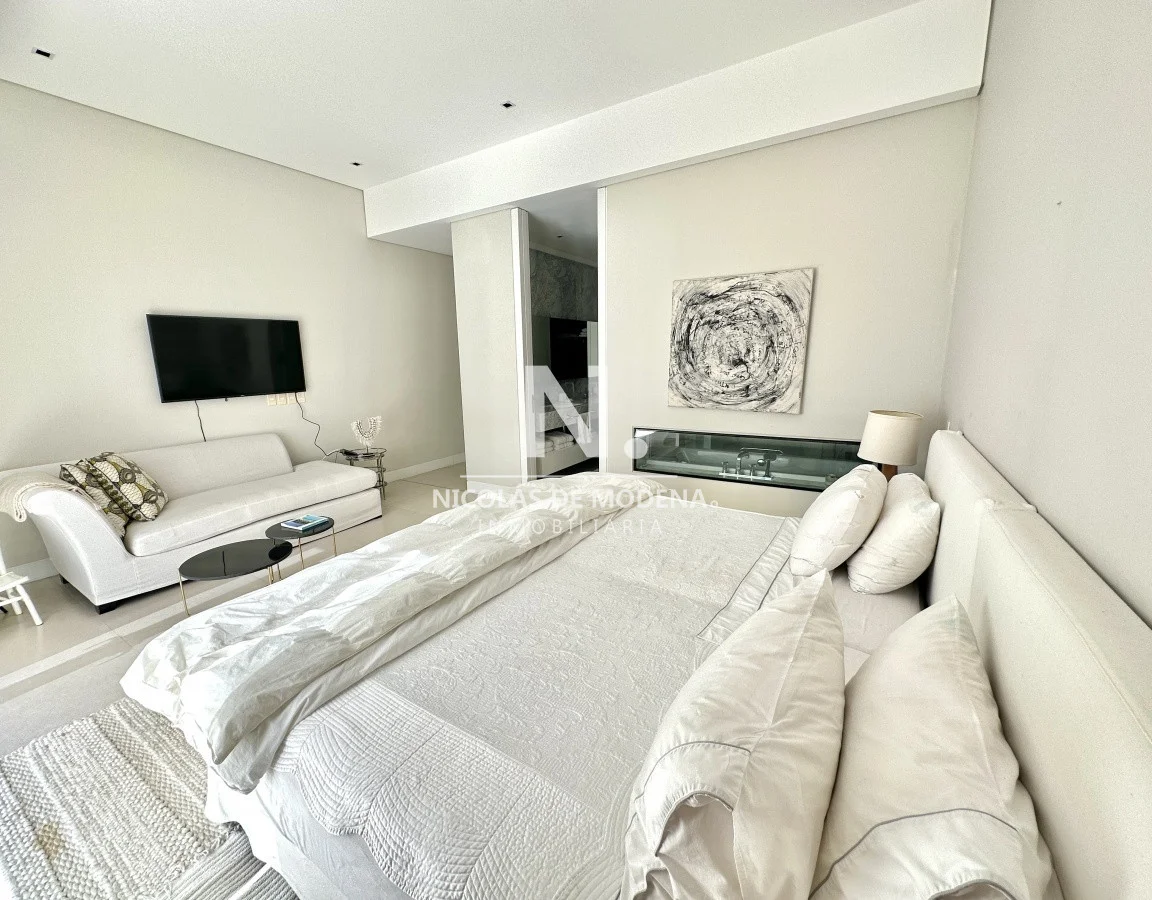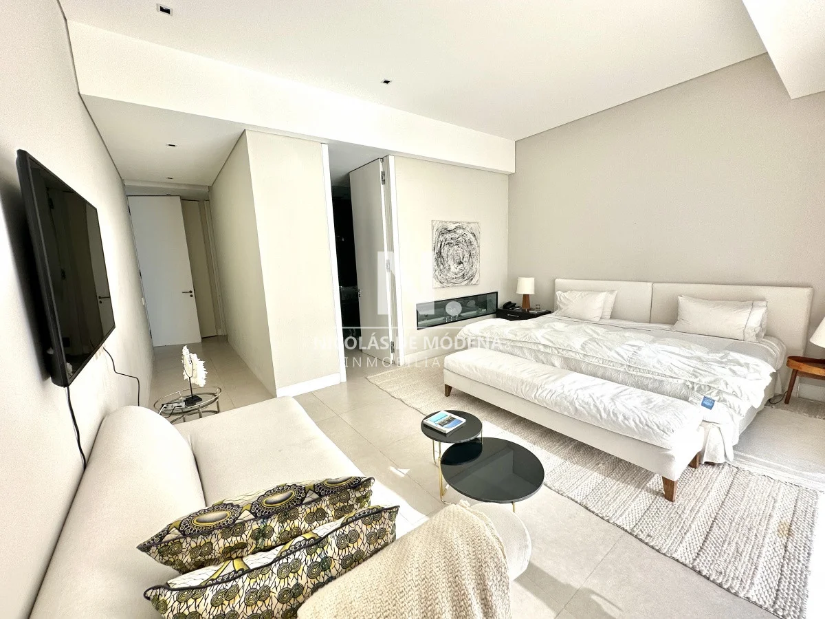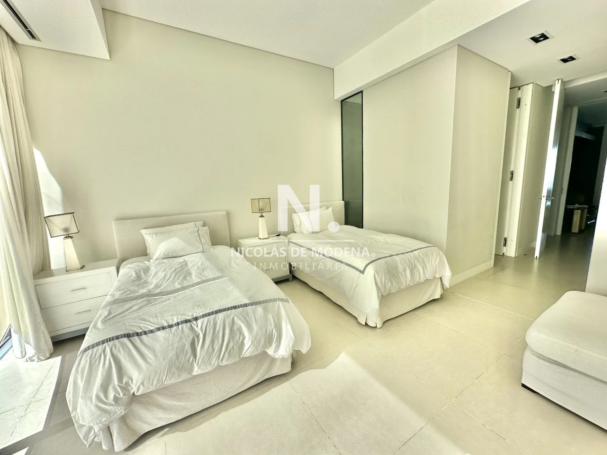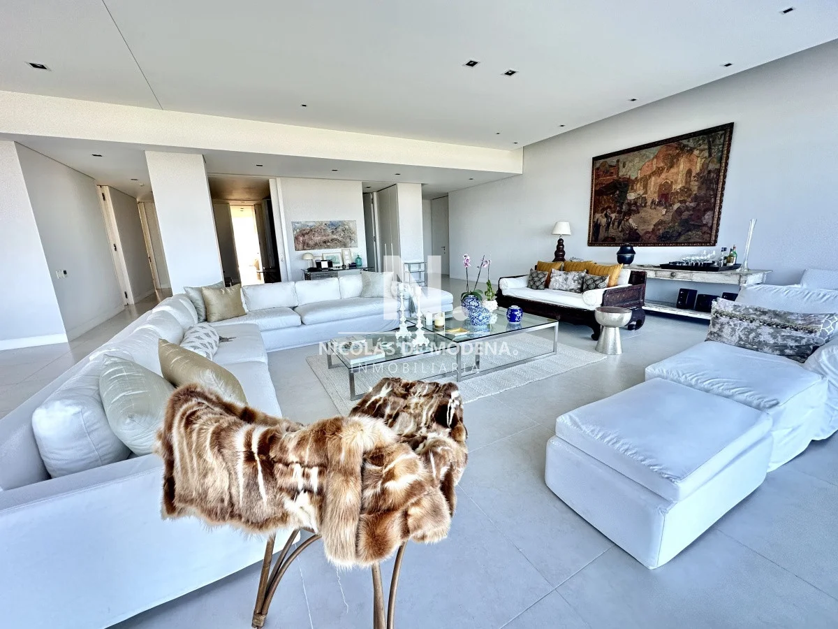 El departamento cuenta con 3 dormitorios en suite, luminoso living-comedor con salida a balcón y vista al mar, cocina integrada (que se puede independizar con puerta deslizante), toilette, área de lavadero con baño, estar con TV y dependencia de servicio exterior. Garaje para dos autos.