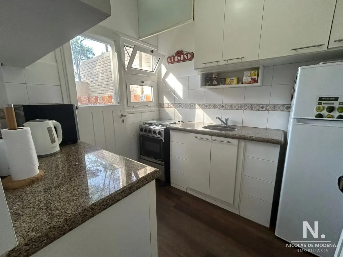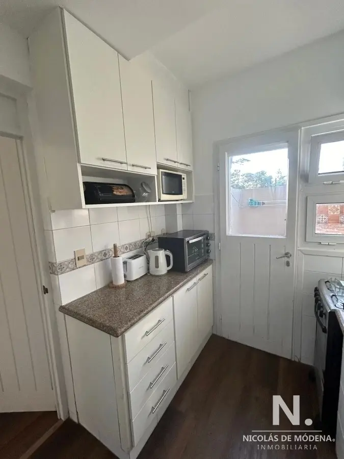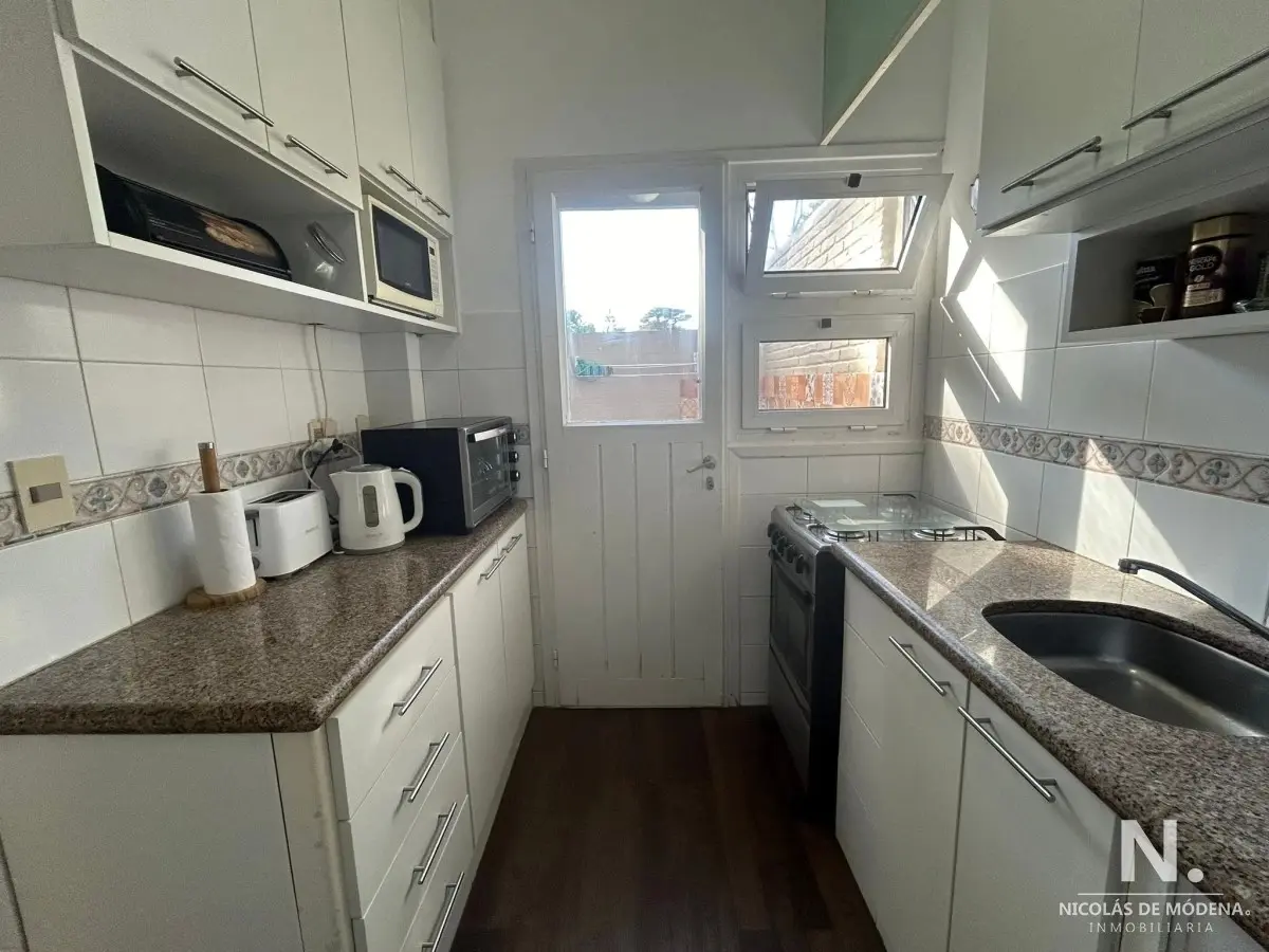 La cocina está definida y completamente equipada con un anafe, microondas, heladera con freezer y tostadora, lo que permite a los huéspedes preparar sus comidas favoritas con facilidad. El área de estar incluye un luminoso living comedor, creando un espacio perfecto para relajarse y socializar.
