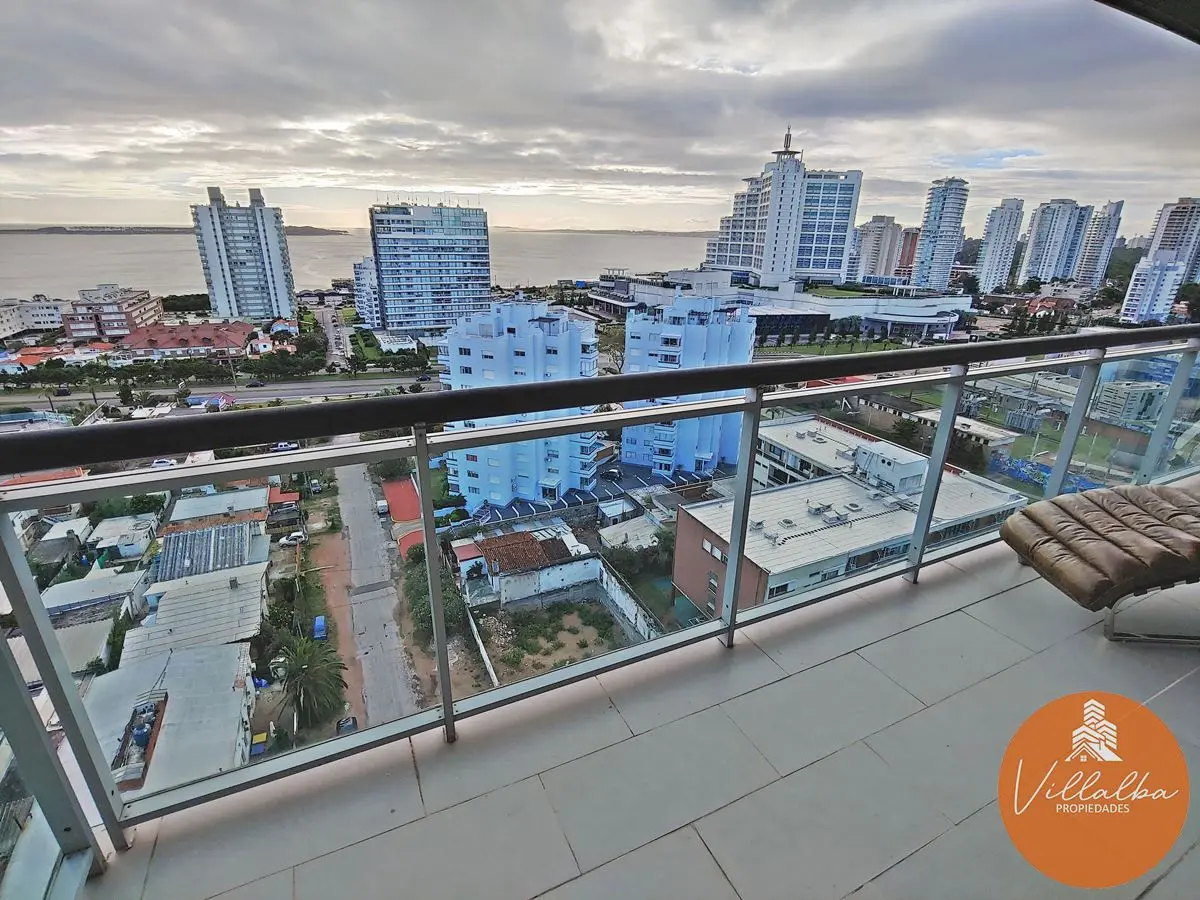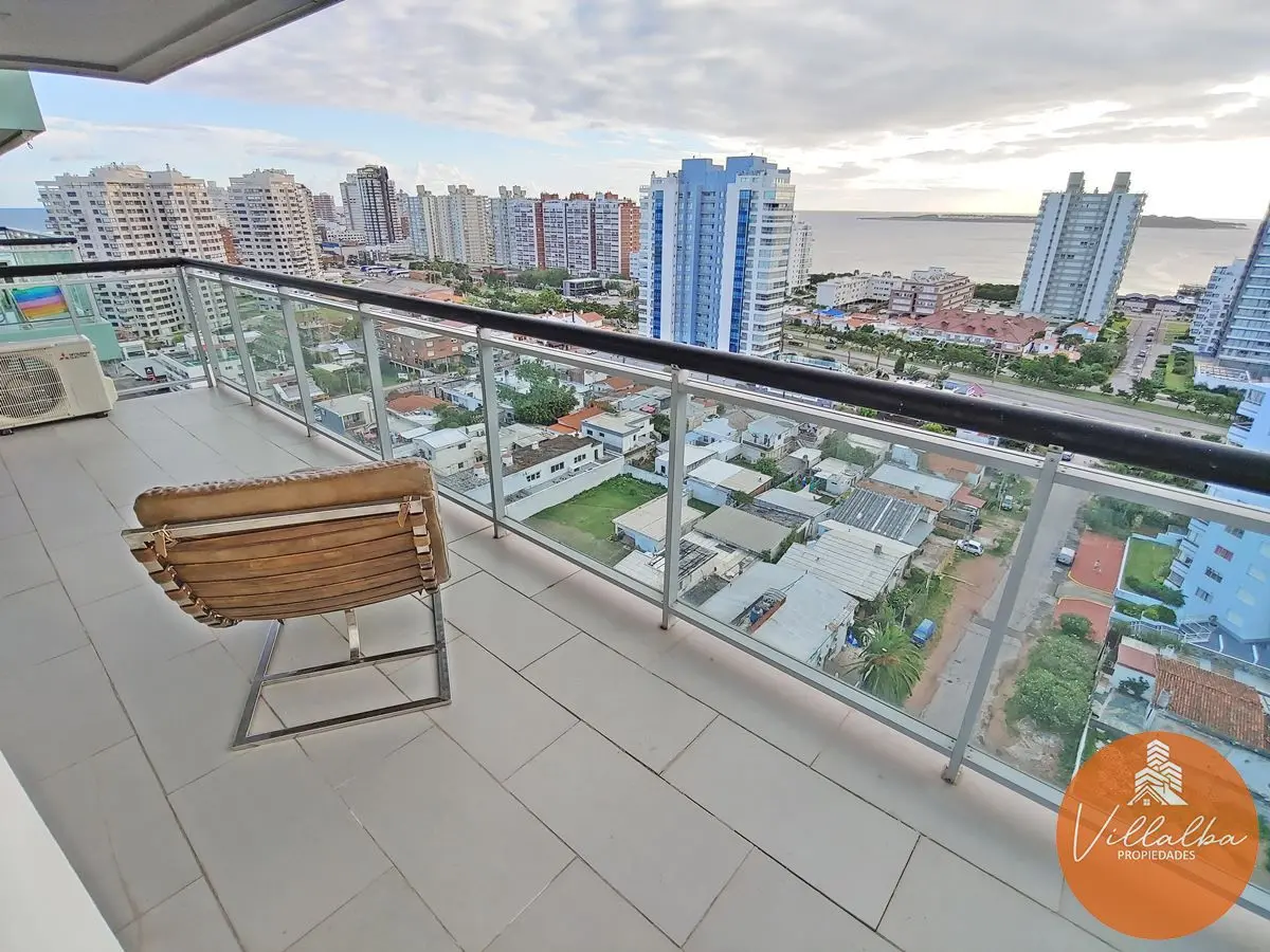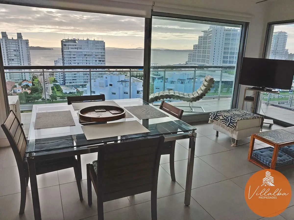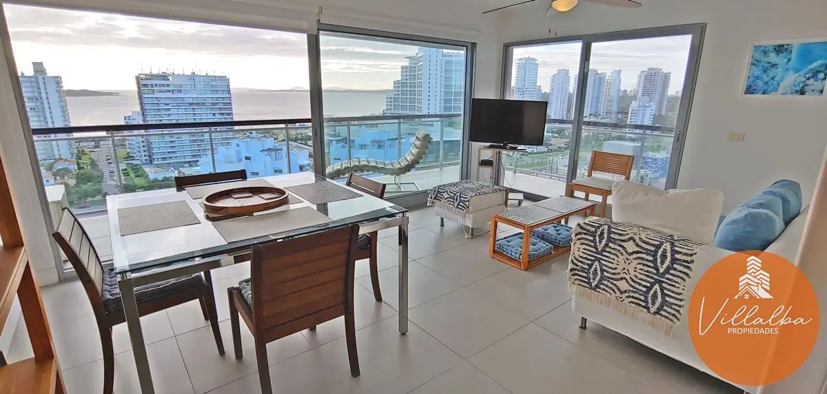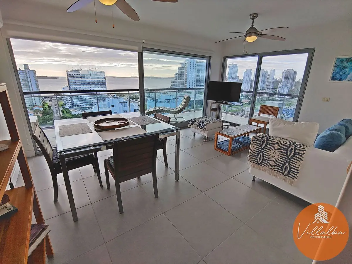Esquinero en piso alto con espectaculares vistas al mar. Apartamento de 2 dormitorios y 2 baños. Cocina independiente con terraza lavadero. Dos grandes balcones, uno de ellos con parrillero privado. Living comedor totalmente vidriado. Garage en subsuelo. Muy bien equipado.