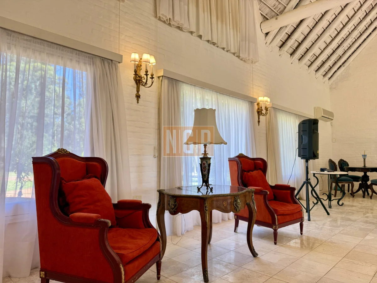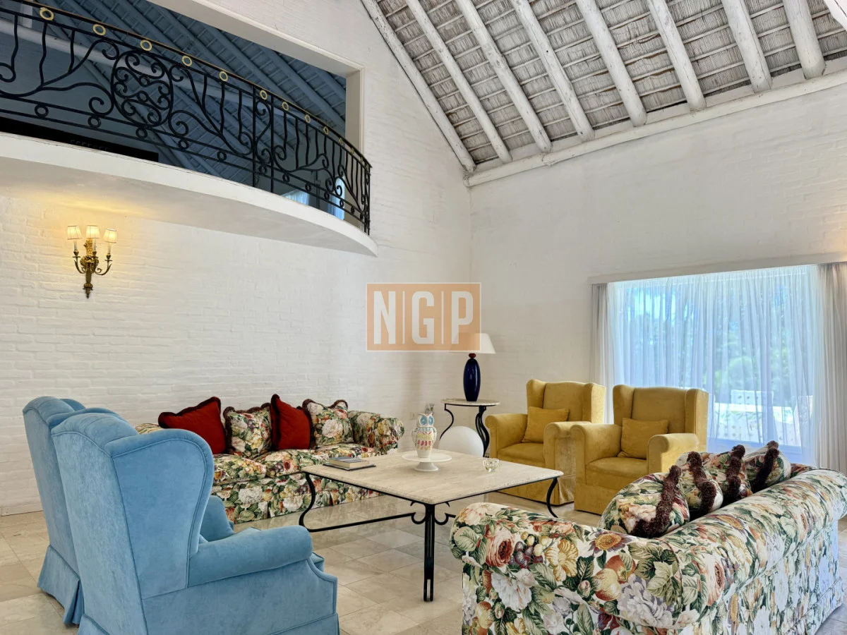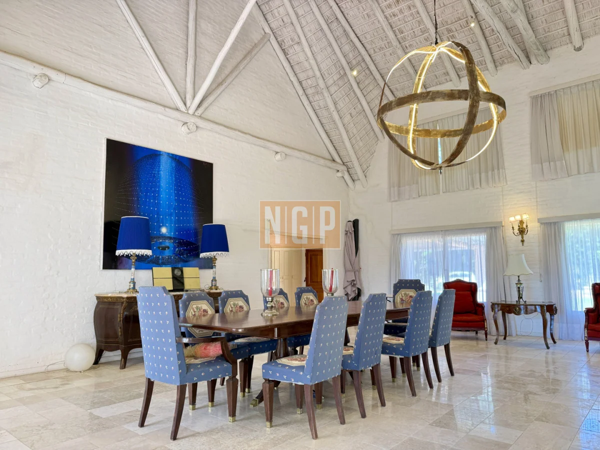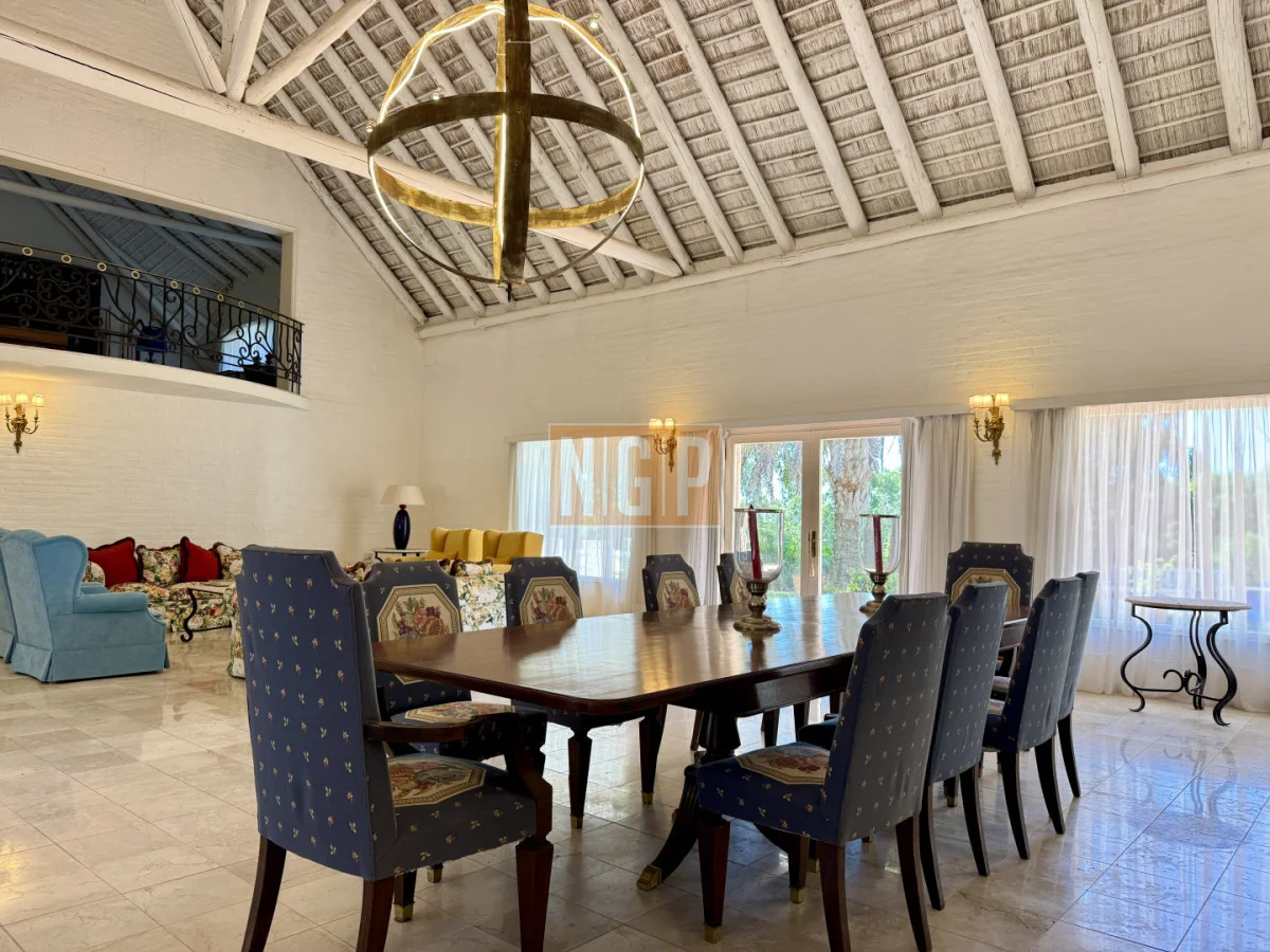 En la Planta Baja están el Living Principal de 100 mts con amplios ventanales y mobiliario de estilo francés. Contiguo esta el Comedor Principal para 10 personas . Además, en la Planta baja, hay 4 habitaciones en suite y la Sala de TV. Junto a esta última está el Comedor de Invierno (semicubierto) con una hermosa vista a los Tilos y los Rosales.