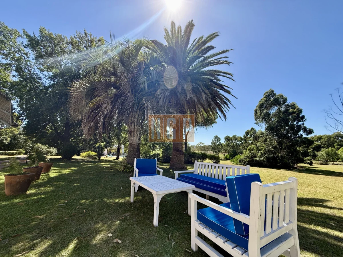 El jardín que rodea las construcciones esta cuidadosamente iluminado. Pudiendo apreciar la gran variedad de especies de árboles. El parque es poblado por dos añejos tilos, arboles indígenas, 4 ombúes de más de 150 años, al igual que un imponente gomero que parece llegar al cielo. A partir de la Casa Principal se dibujan distintos senderos que llevan a descubrir íntimos espacios como el sector de la Plaza que se ve en la foto. Conviven más de 20 variedad de árboles: Robles, Paraísos, Ceibos, Jacaranda, Palo Borracho, una enorme Acacia Negra, Pencas, Liquidámbar, Nogal, Coronilla, Palmeras, Limoneros, Ciruelos, Membrillos, Pomelos, Ciruelos etc.