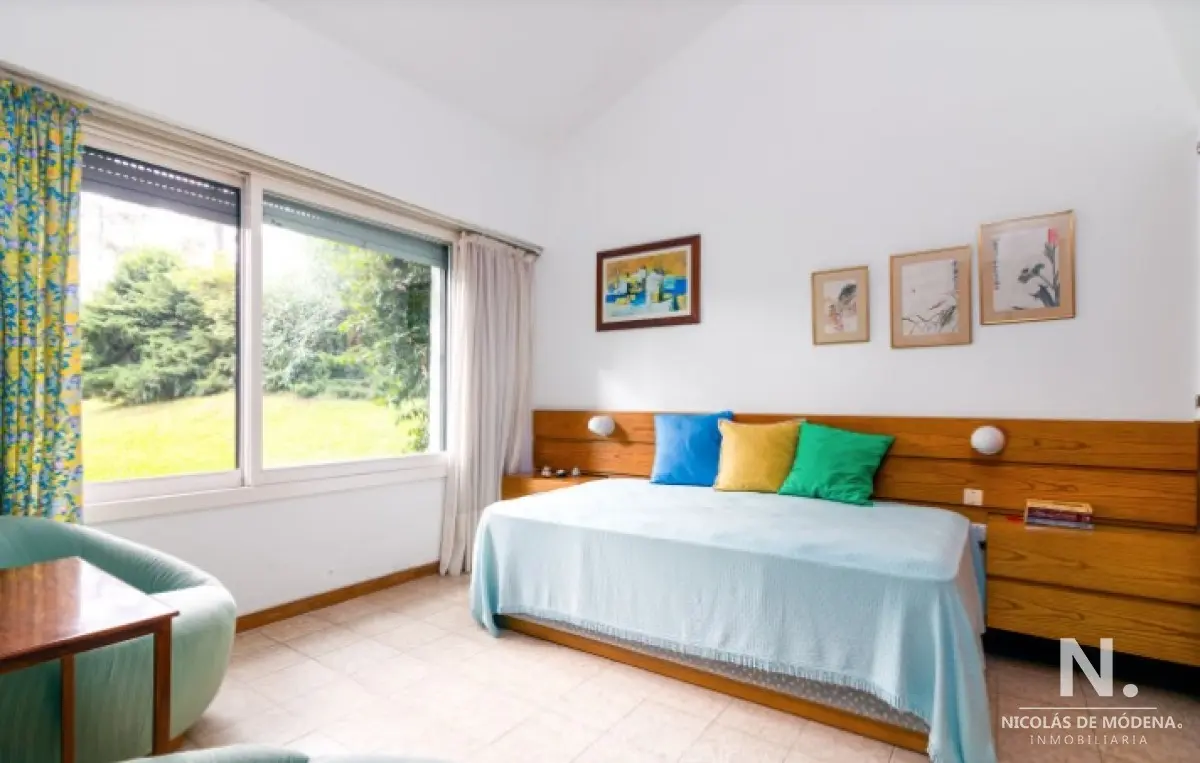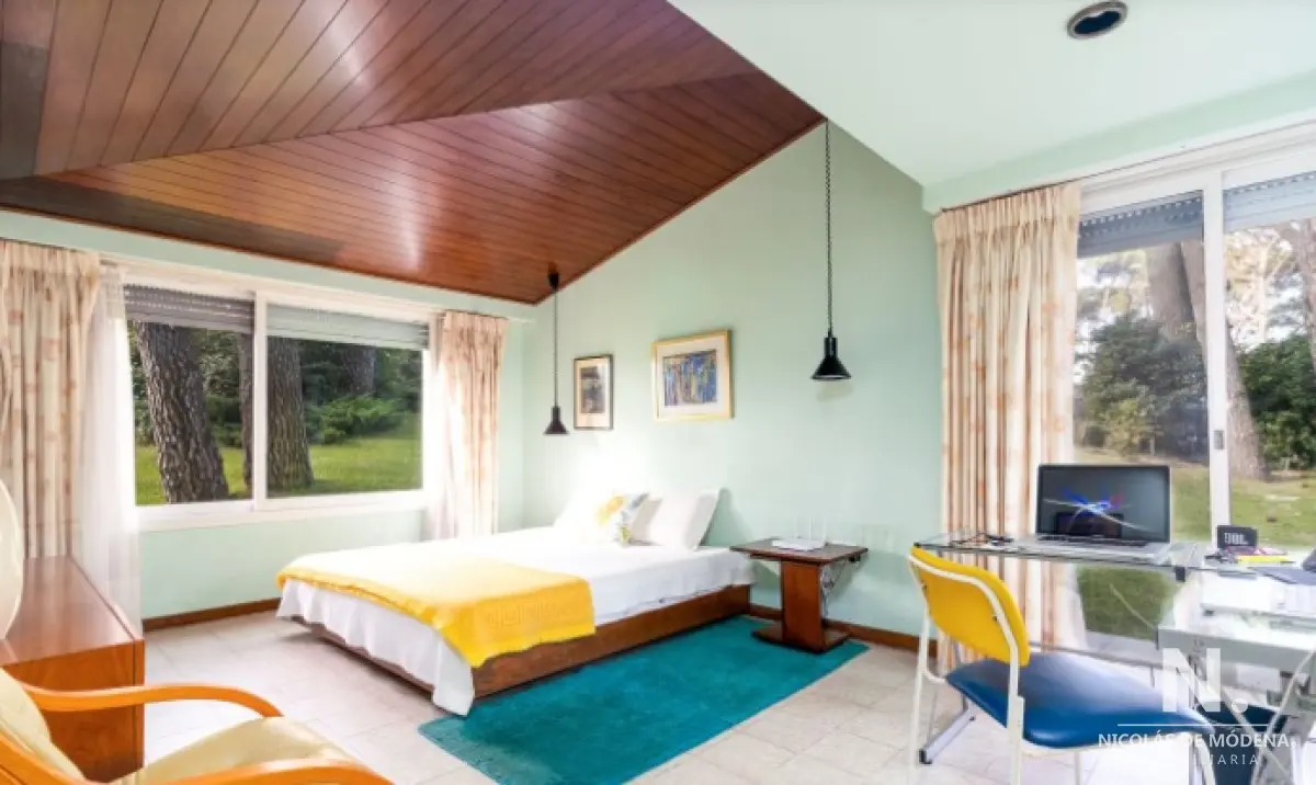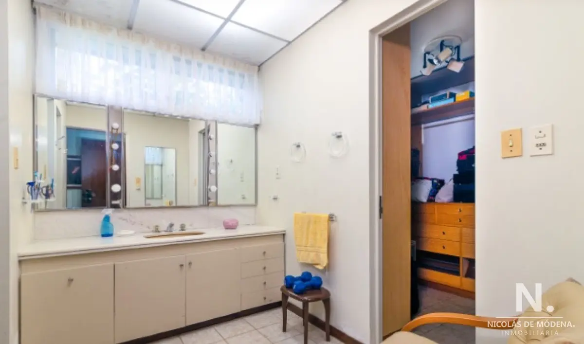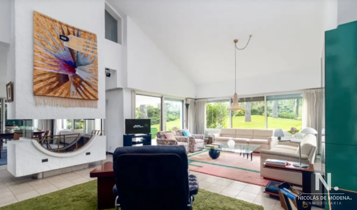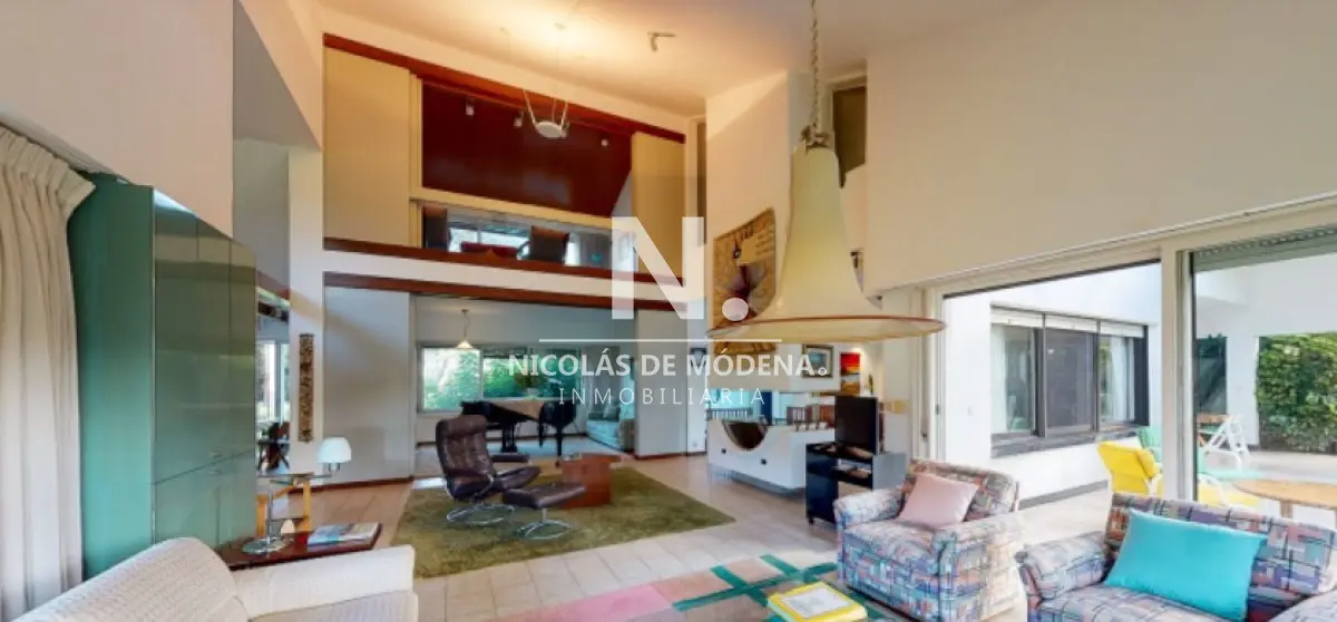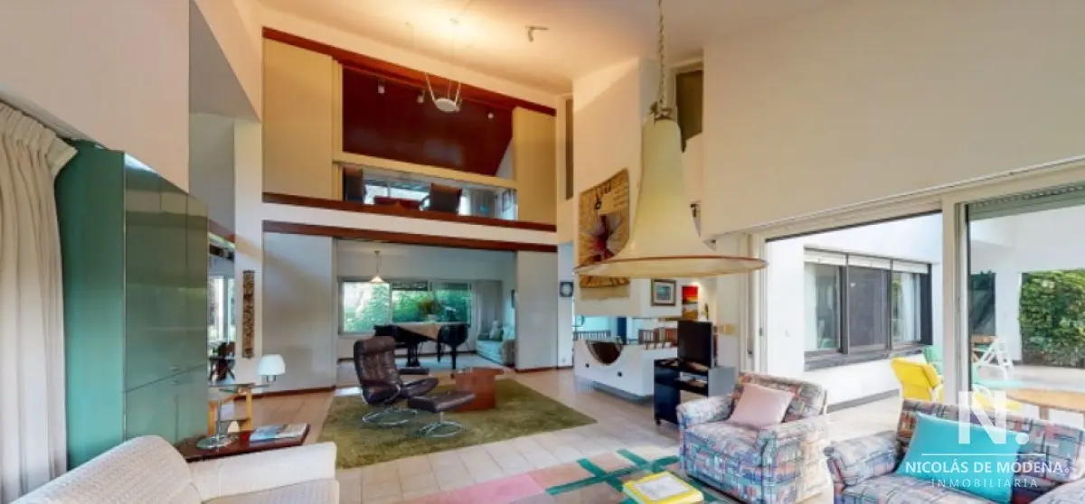 A la izquierda baño con vestidor social, generosa master suite con baño doble y vestidor. También se encuentra una segunda suite con vista al jardín en planta baja. A planta alta se accede por una escalera volada de hierro y madera la cual está a la altura del notable estilo que tiene la suite principal del segundo piso. Esta suite se puede integrar al living comedor con su doble altura mediante un cerramiento movible o bien separar por el mismo método. Por lo tanto, por un lado se ve el living comedor, y por el otro lado tiene un gran ventanal al jardín. Esto es un gran atributo ya que, con versatilidad, le da estilo y funcionalidad.