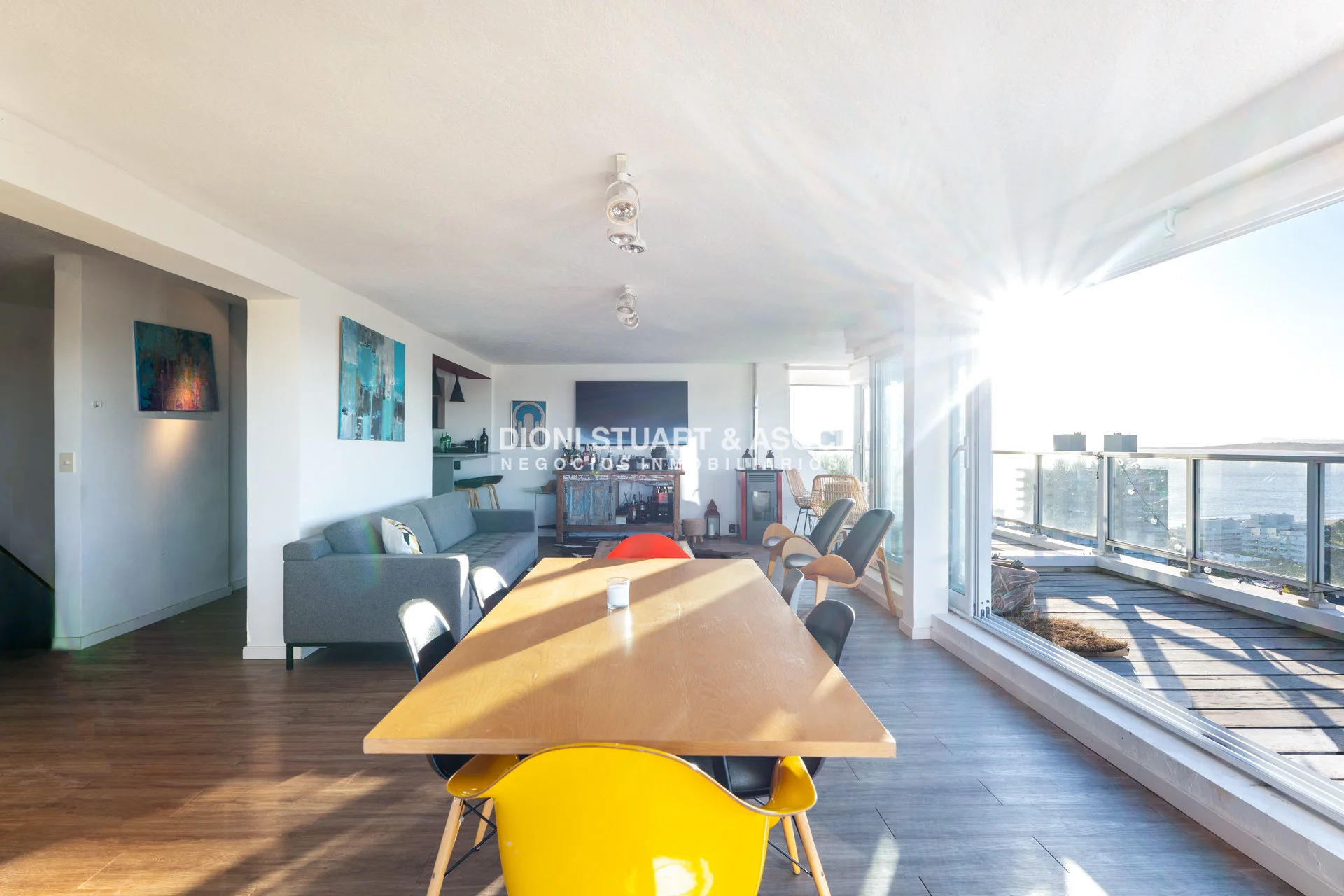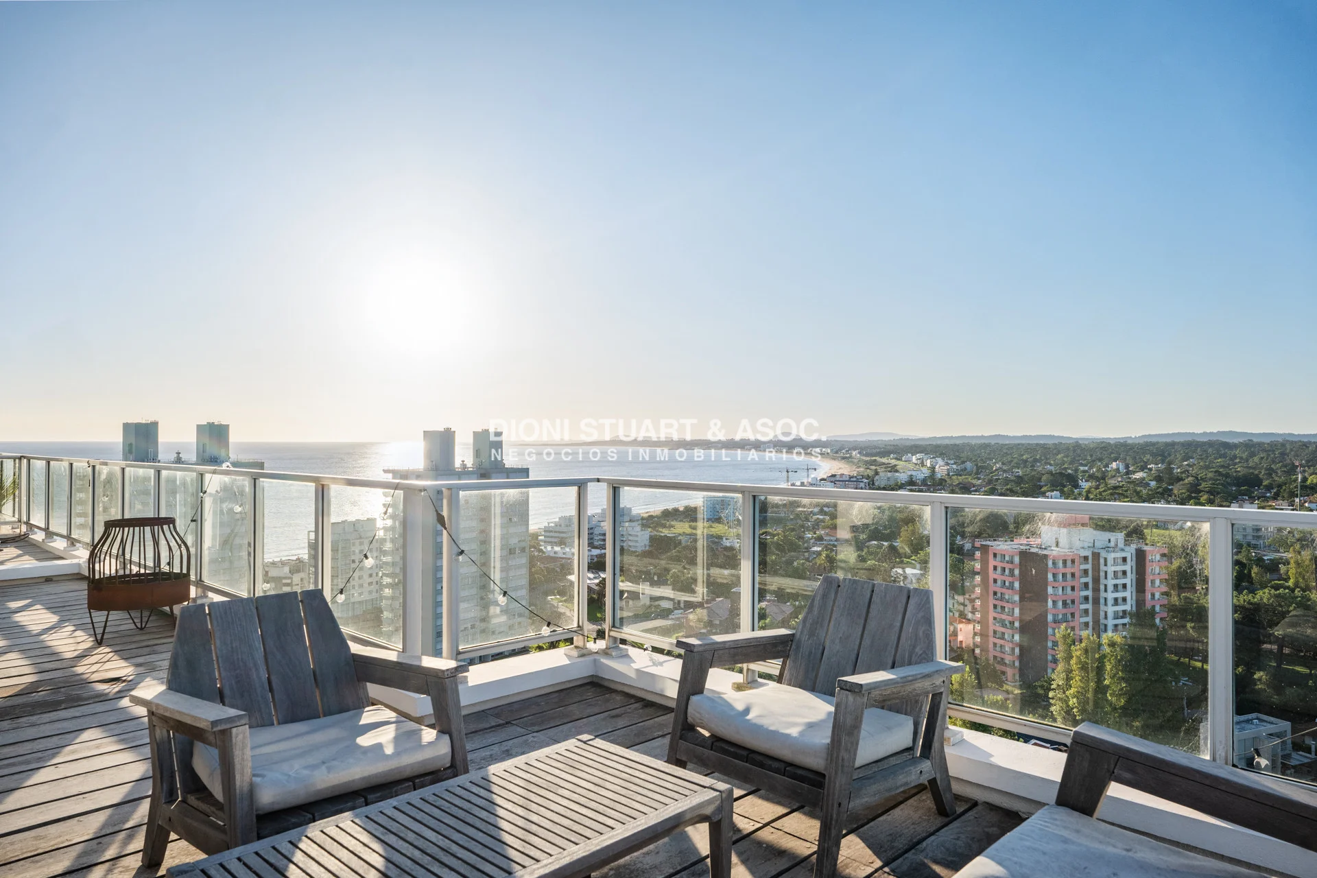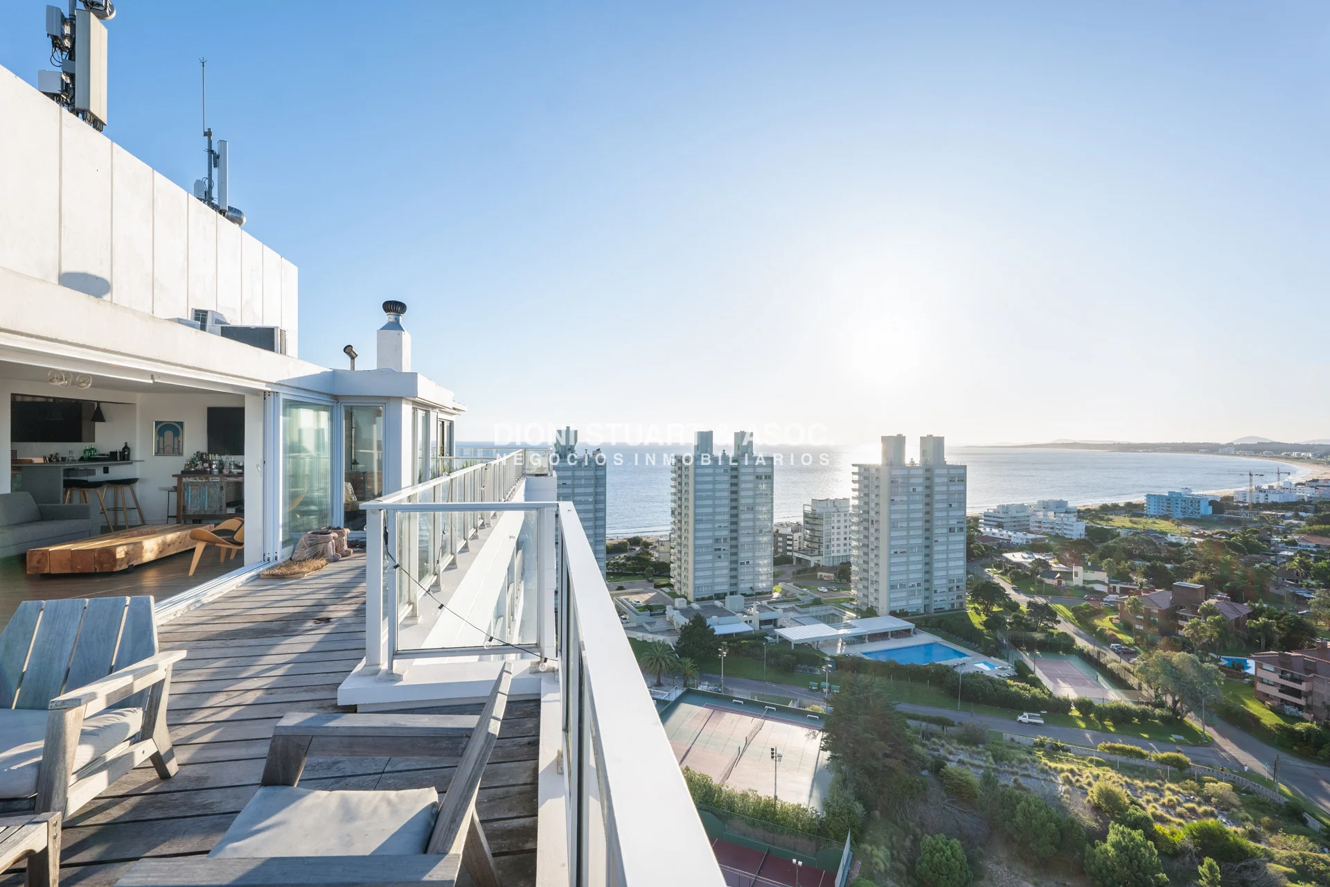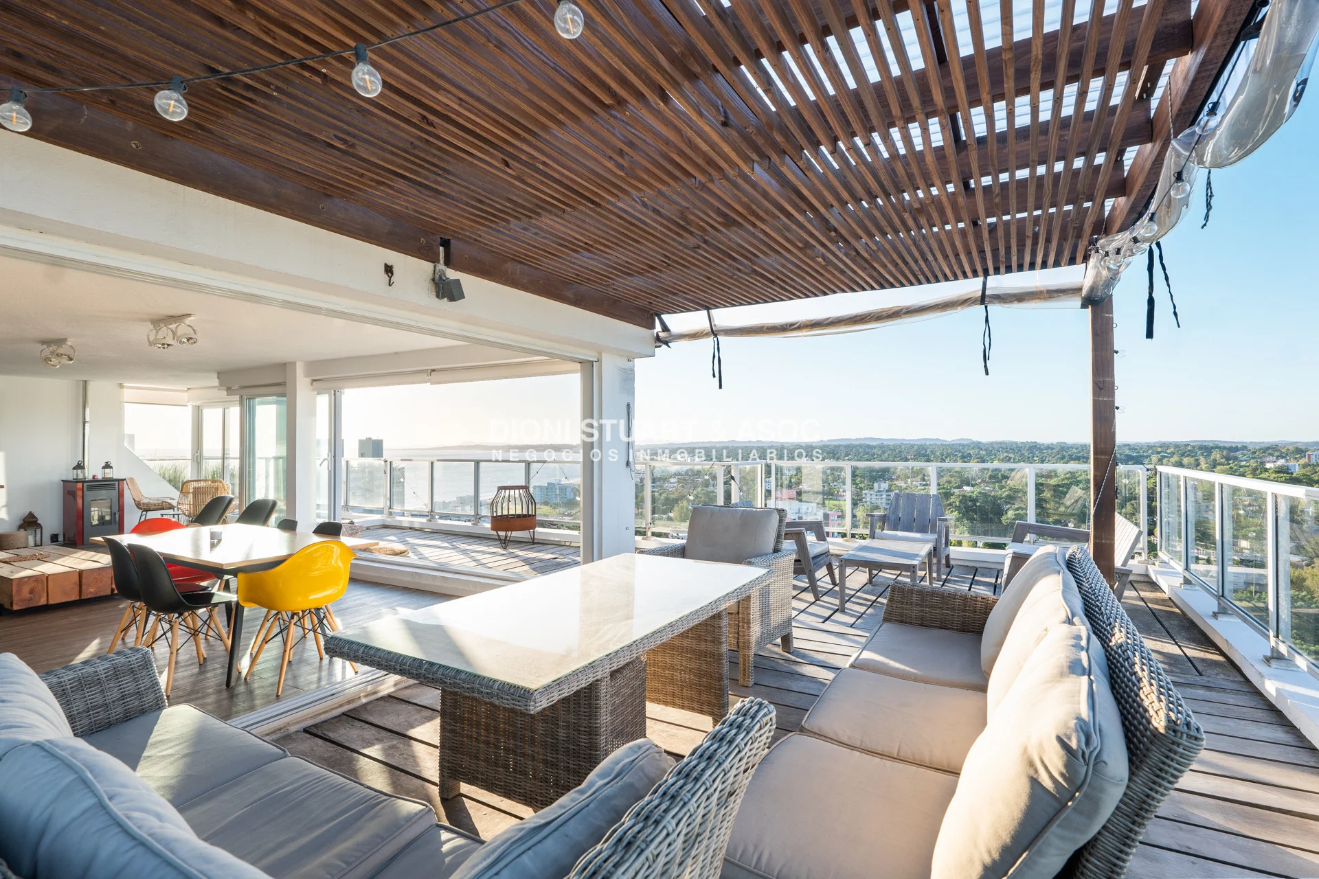 Presentamos este magnifico departamento ubicado en la Torre Wilson del Complejo Lincoln Center, unidad de 220 m2 totales y 174 m2 internos, distribuidos en dos pisos orientado hacia el NorOeste con una vista única a la mansa y Punta Ballena. En planta baja nos encontramos con un amplio living-comedor con una cocina con barra, dos dormitorios, dos baños, y dependencia de servicio con baño. La planta alta es otro departamento más, muy bien distribuido y equipado, con un amplio living comedor una estufa a leña instalada, parrillero, toilette, dos dormitorios (uno en suite), y una amplia terraza en forma de L con grandes sillones desde donde podemos disfrutar de una hermosa vista al mar y al bosque. El departamento cuenta con mejoras realizadas como vidrios DVH, aires acondicionados, rollers automatizados, luminaria nueva, estufa en el segundo nivel, piso vinilico, deck y una pérgola con toldos en la terraza. La unidad cuenta con dos cocheras, una techada y un garage en subsuelo.
