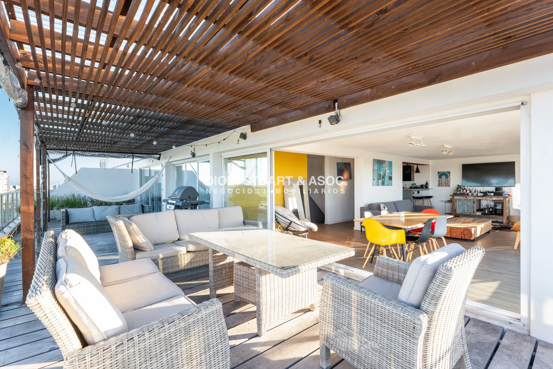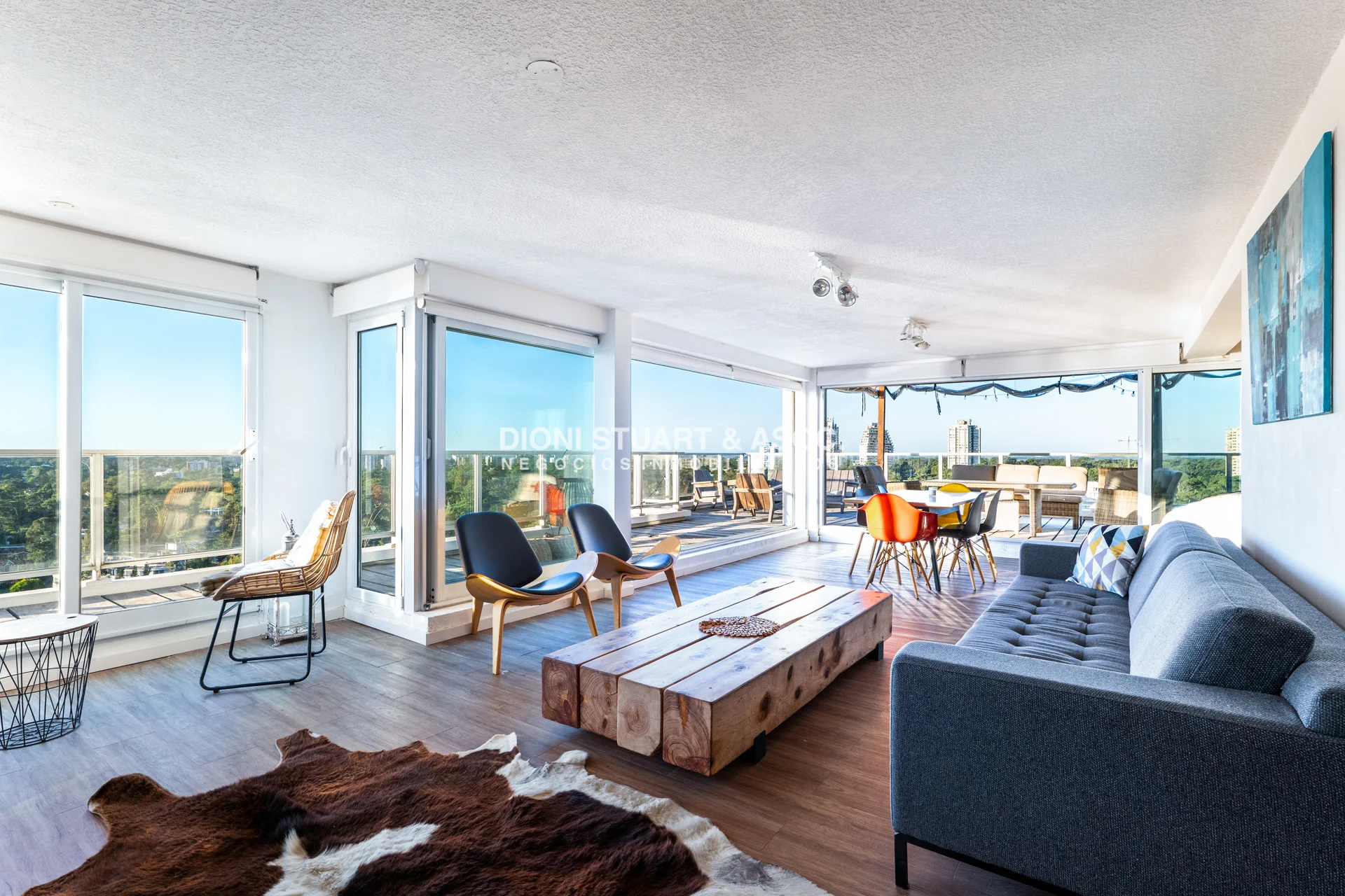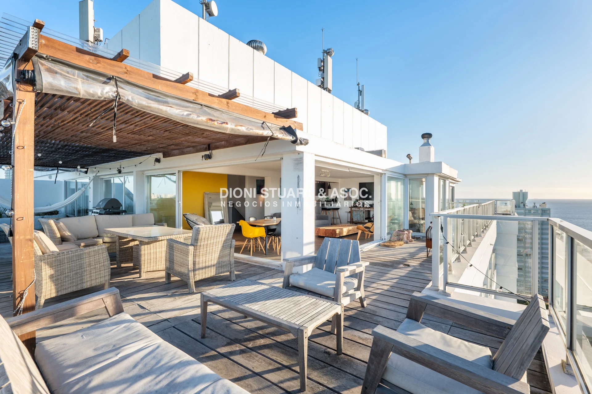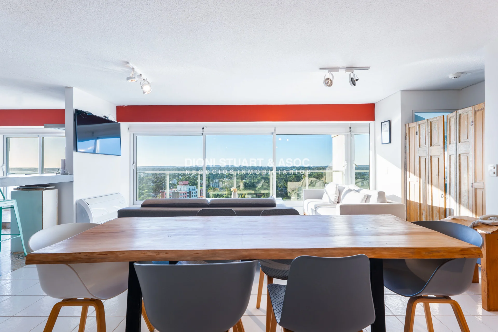 Presentamos este magnifico departamento ubicado en la Torre Wilson del Complejo Lincoln Center, unidad de 220 m2 totales y 174 m2 internos, distribuidos en dos pisos orientado hacia el NorOeste con una vista única a la mansa y Punta Ballena. En planta baja nos encontramos con un amplio living-comedor con una cocina con barra, dos dormitorios, dos baños, y dependencia de servicio con baño. La planta alta es otro departamento más, muy bien distribuido y equipado, con un amplio living comedor una estufa a leña instalada, parrillero, toilette, dos dormitorios (uno en suite), y una amplia terraza en forma de L con grandes sillones desde donde podemos disfrutar de una hermosa vista al mar y al bosque. El departamento cuenta con mejoras realizadas como vidrios DVH, aires acondicionados, rollers automatizados, luminaria nueva, estufa en el segundo nivel, piso vinilico, deck y una pérgola con toldos en la terraza. La unidad cuenta con dos cocheras, una techada y un garage en subsuelo.