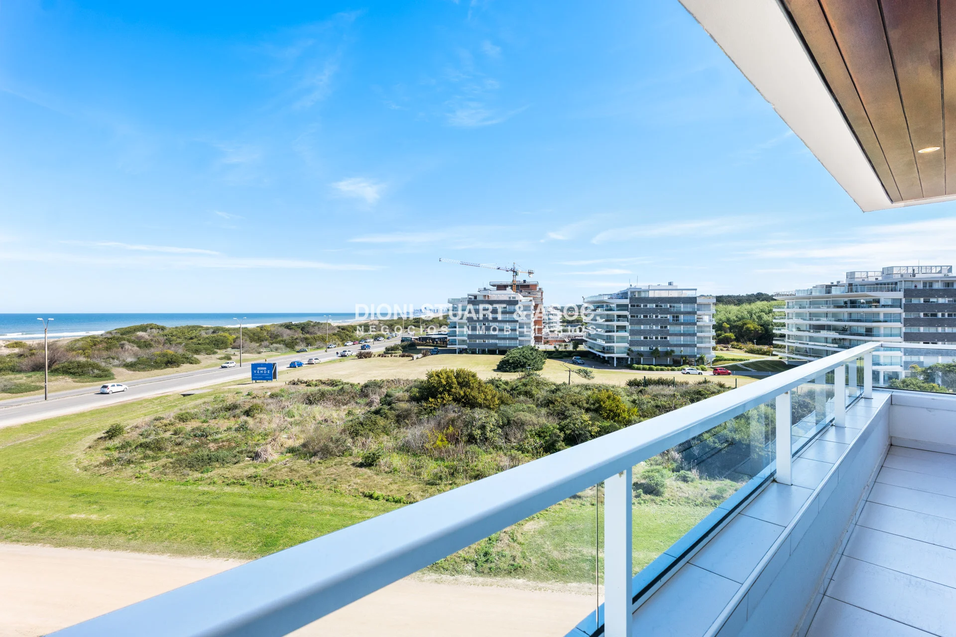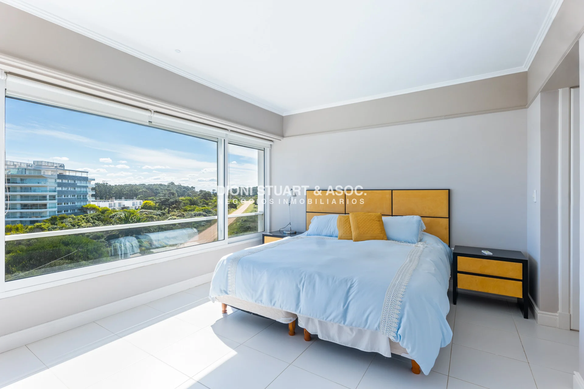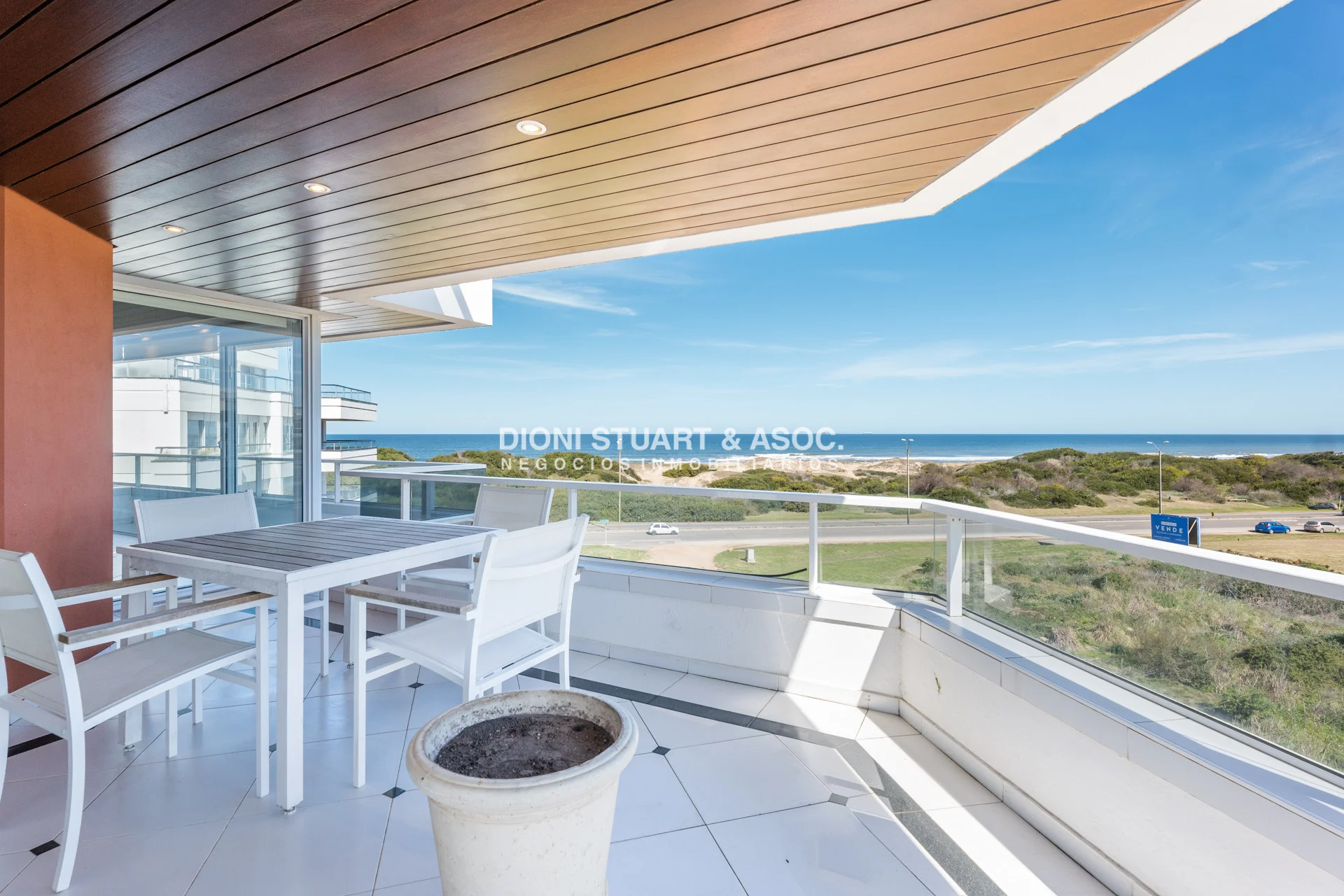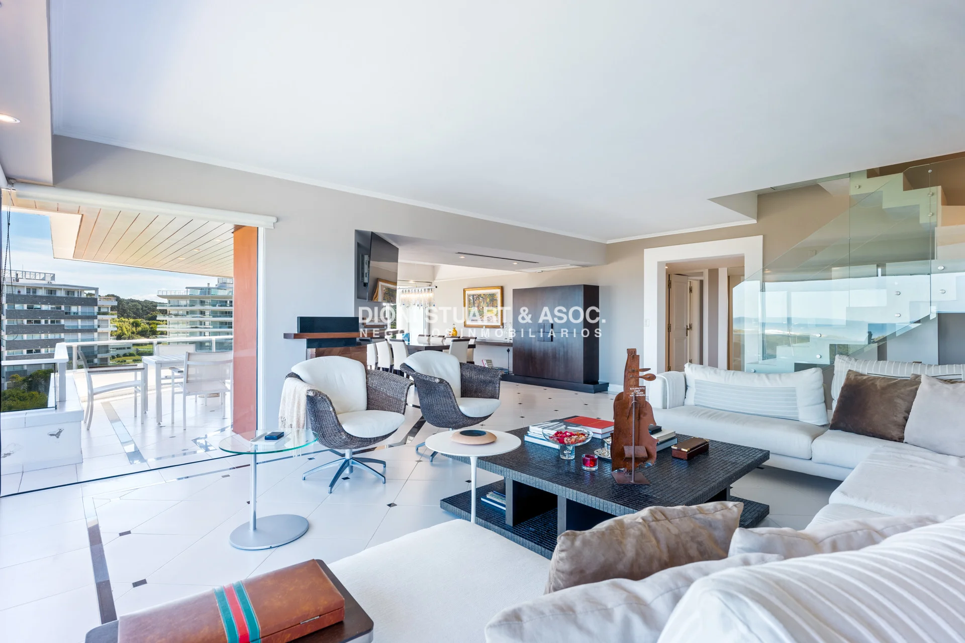 Departamento pent house duplex ubicado en el edificio Aguas Azules en primera linea Playa Brava. La unidad cuenta con un amplio living-comedor con estufa a leña con vistas al océano, cuatro dormitorios (tres en suite), toilette y cocina definida con entrada independiente. En su segundo nivel dispone de una gran barbacoa, amplias terrazas con vista al mar y jacuzzi y un dormitorio con office, vestidor walk-in y doble baño. Como si fuera poco, en planta baja cuenta con un loft completo con baño y cocina para huéspedes.