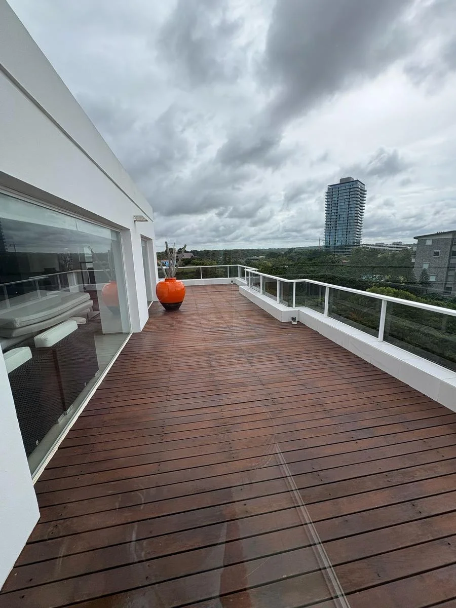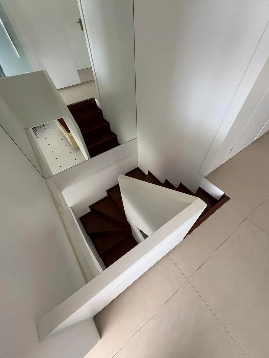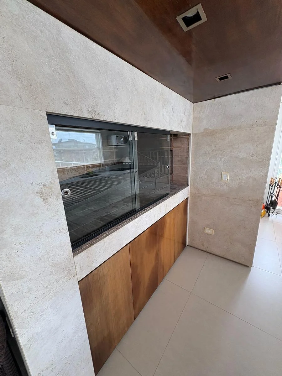 Escalera interna que conecta con la planta alta donde encontramos un living, una barbacoa de grandes dimensiones, cocina, terraza perimetral con vistas.