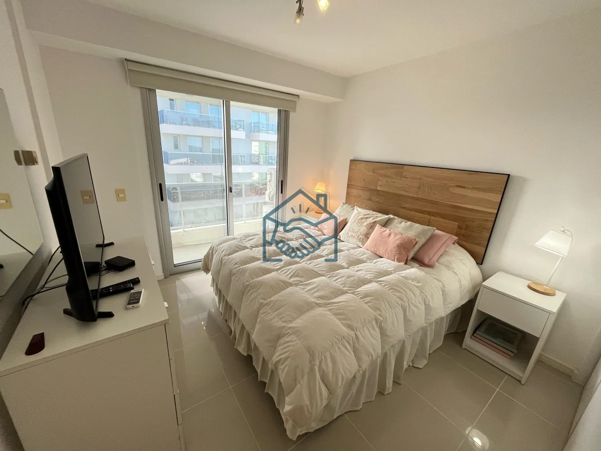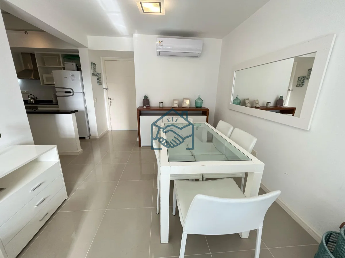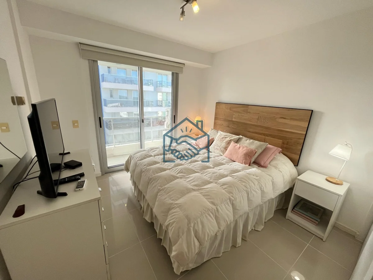 Apartamento de 2 dormitorios y 1 baño , cocina integrada, living comedor, balcón, garaje para un auto, servicio de mucamas, servicio de playa, sauna, gimnasio, sum y piscina exterior.