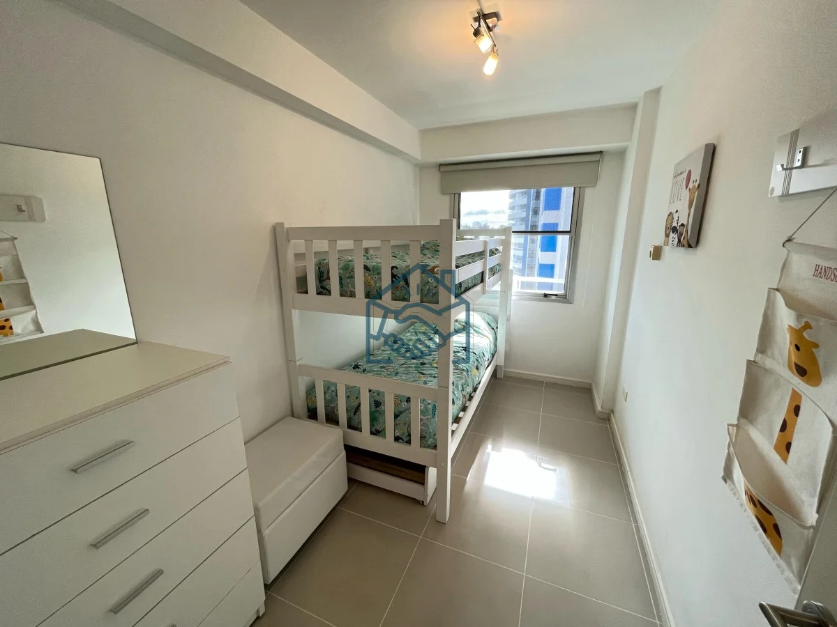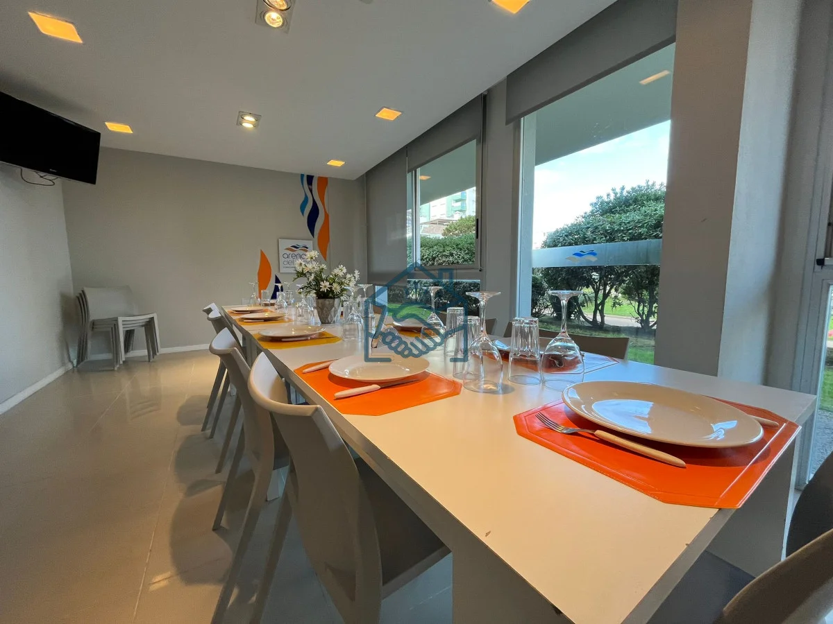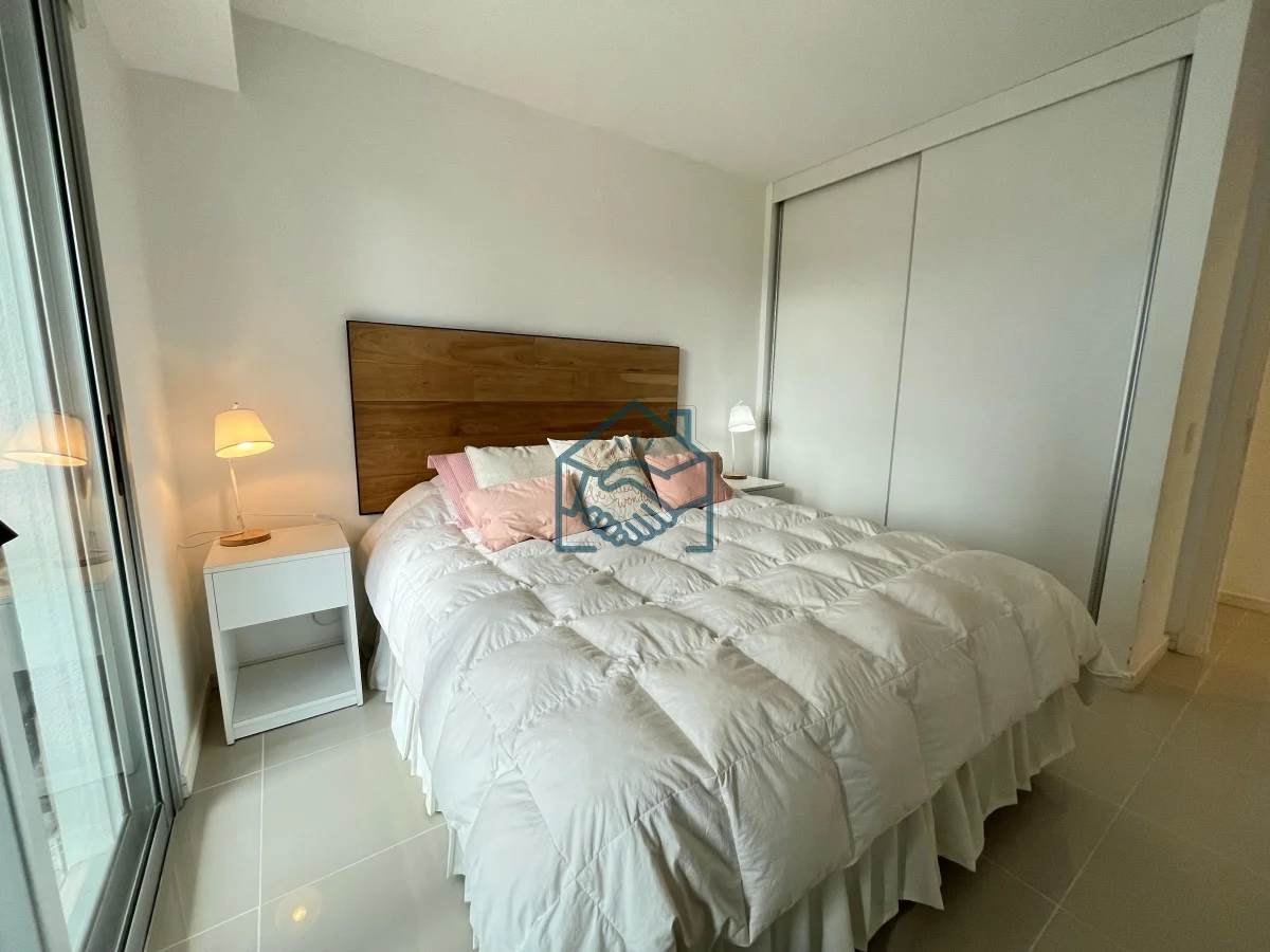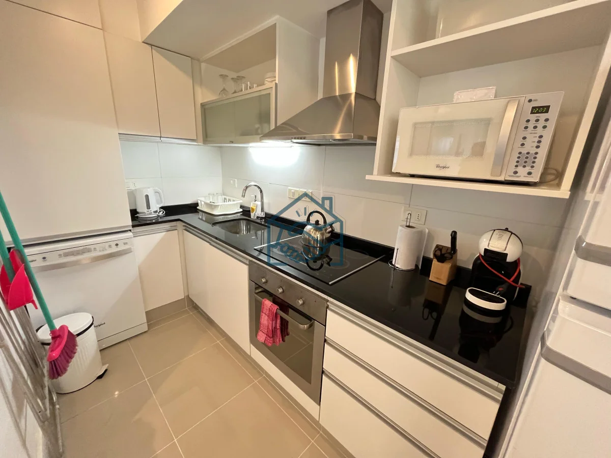 Apartamento de 2 dormitorios y 1 baño , cocina integrada, living comedor, balcón, garaje para un auto, servicio de mucamas, servicio de playa, sauna, gimnasio, sum y piscina exterior.