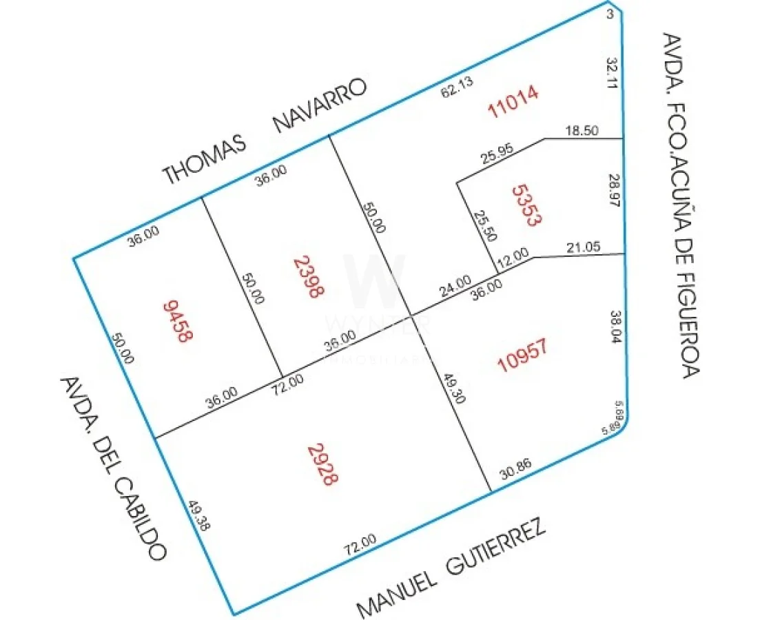 Terreno de 3.550 m2 que actualmente cuenta con una casa de 623 m2 edificados. El mismo tiene 49,38 metros de frente con 72 metros de profundidad y 49,30 metros de fondo. Apto para edificar 2 bloques de apartamentos.