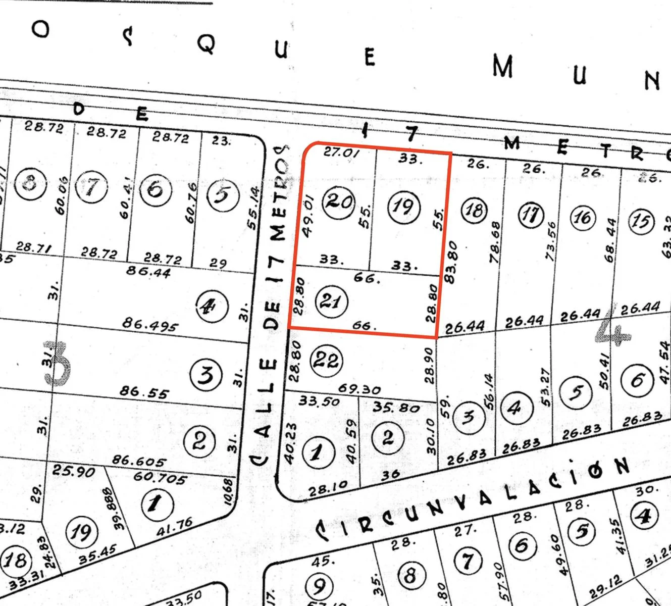 Cuenta con 5.523 m² totales, conformados por tres padrones de 1.901 m², 1.815 m² y 1.807 m².