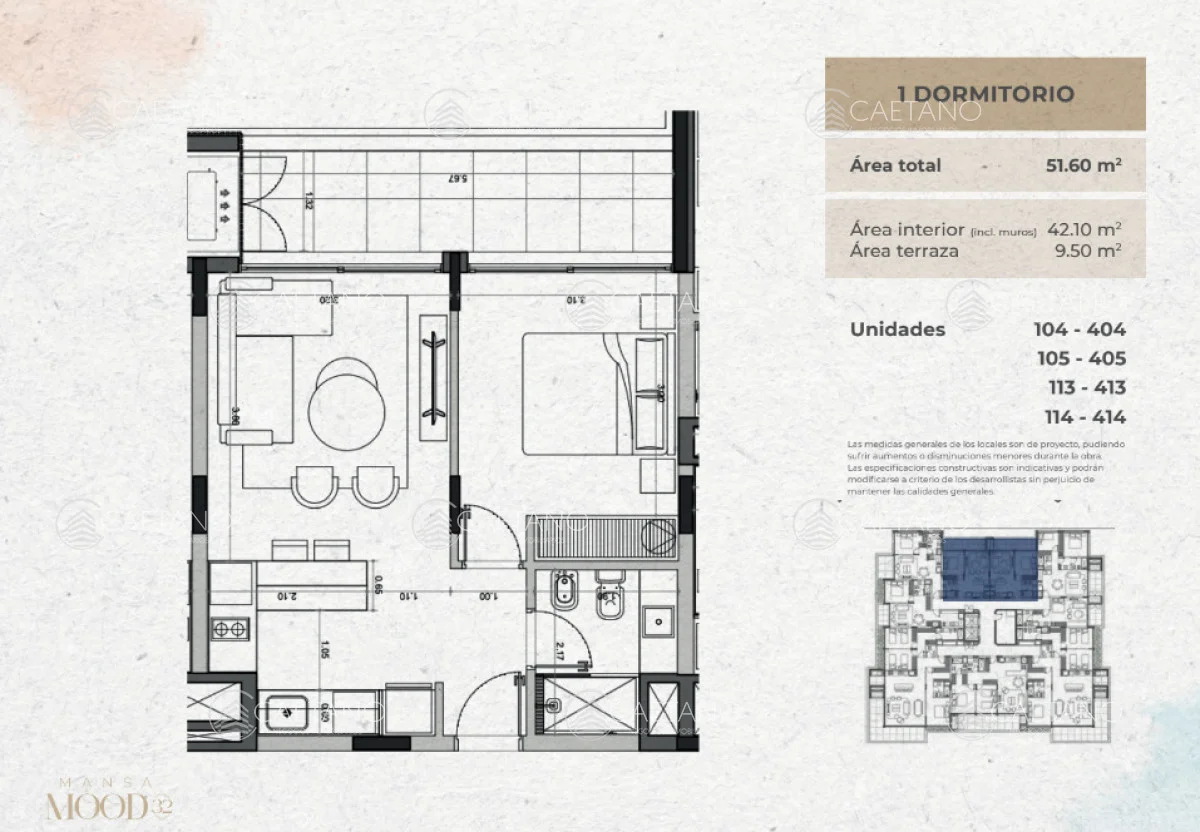 Dos módulos de 4 pisos. Ambas torres tienen la misma orientación y la torre 1 está más sobre la rambla que la torre 2. Unidades monoambientes, 1 dormitorio, 2 dormitorios y 3 dormitorios.