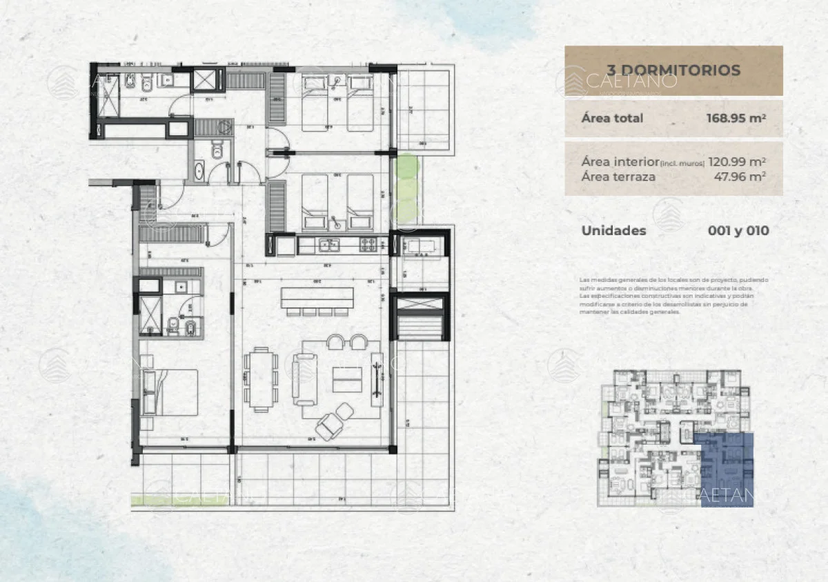 Dos módulos de 4 pisos. Ambas torres tienen la misma orientación y la torre 1 está más sobre la rambla que la torre 2. Unidades monoambientes, 1 dormitorio, 2 dormitorios y 3 dormitorios.