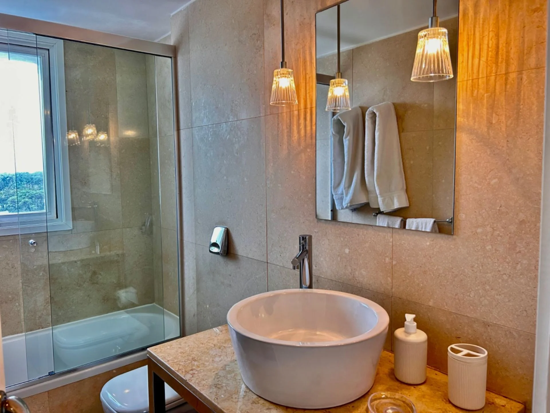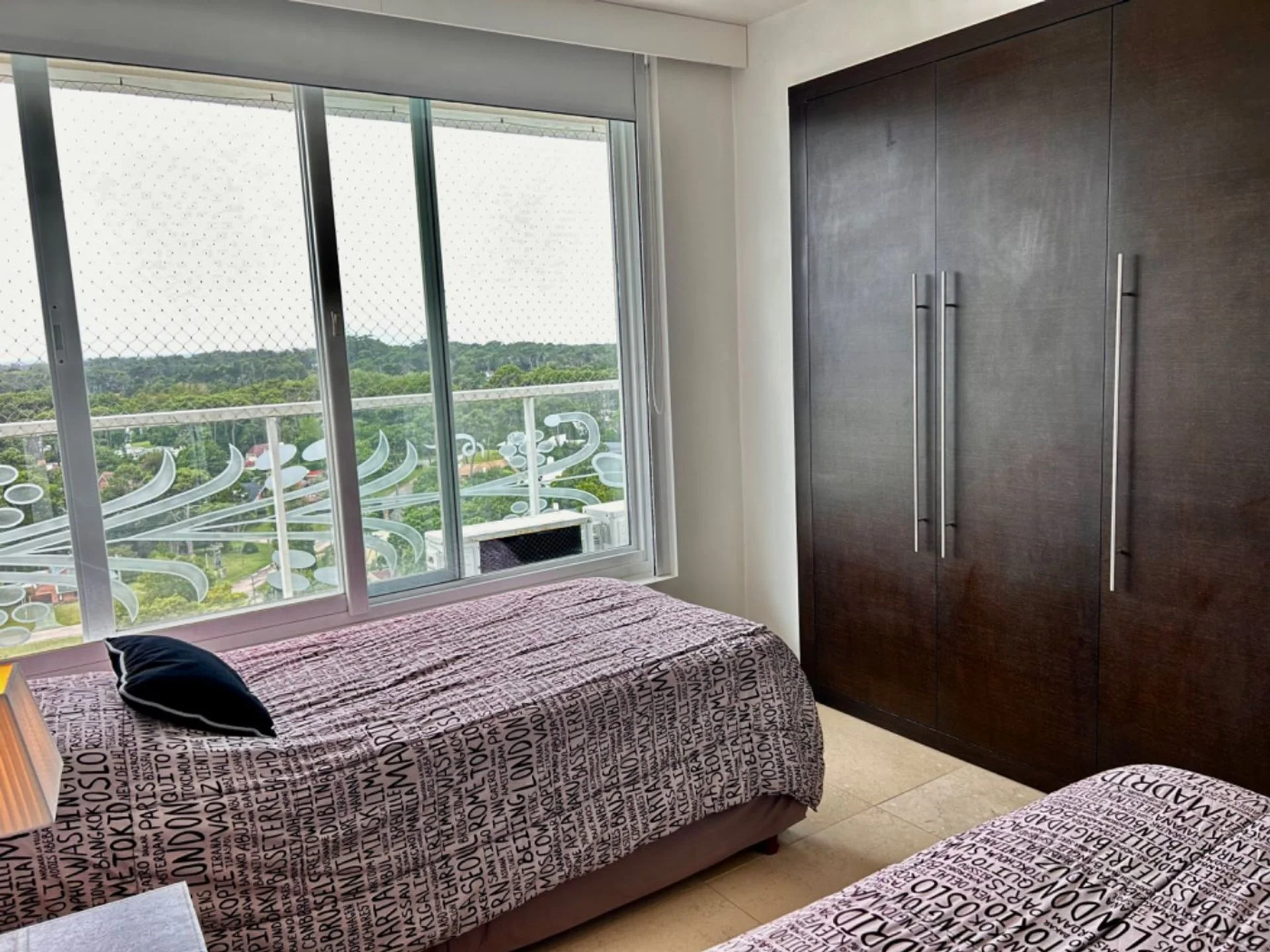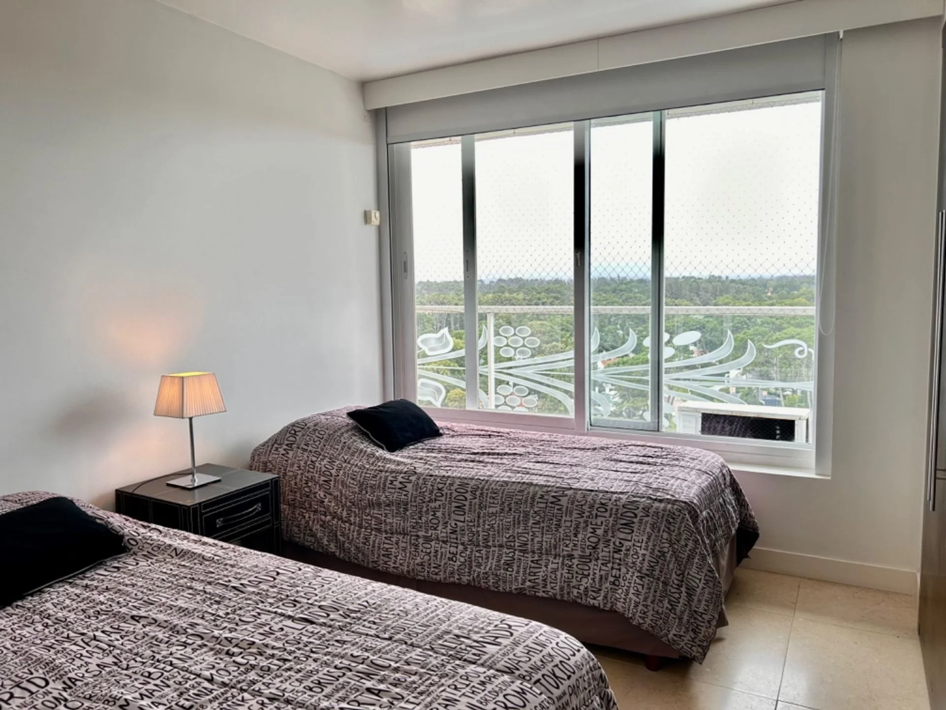 2 dormitorios y 2 baños completos, uno en suite. Posee living comedor con aire acondicionado, con salida a terraza, con vista al bosque y Playa Brava. Primer baño con mampara de vidrio. Primer dormitorio con vista al bosque y Brava, con aire acondicionado. Suite con aire acondicionado, con vista al bosque, Brava y Puerto. Baño de la suite con bañera y mampara.