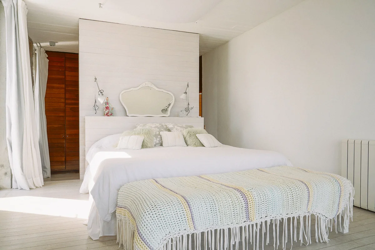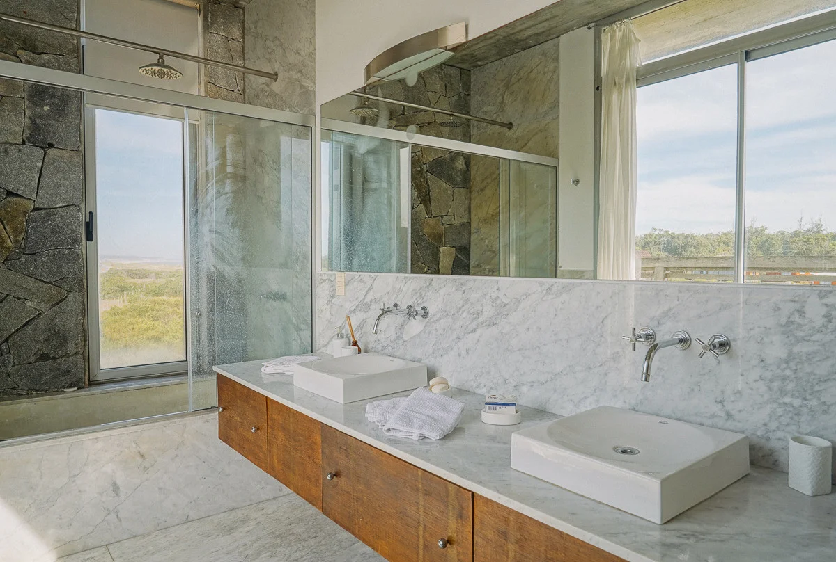 La master suite es de gran tamaño, con vestidor, baño completo y terraza privada con vista al mar. En el segundo piso se encuentran la master suite y otra suite amplia; en el primer piso, dos dormitorios comparten un baño; y en planta baja se ubican dos suites con cocina y comedor propio. El séptimo dormitorio en suite tiene acceso independiente y suele utilizarse como dependencia de servicio.