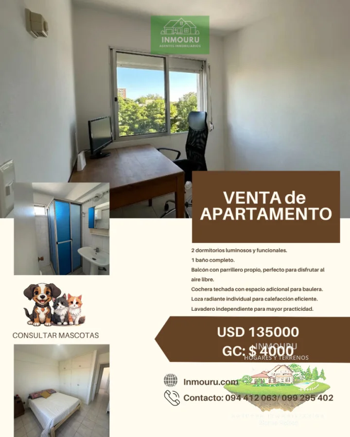 Apartamento en Ipora - Maldonado (Av Joaquín de Viana esquina Ventura Alegre) Apartamento en la intersección de Ventura Alegre y Joaquín de Viana, cerca de todo: comercios, transporte, servicios y zonas verdes. Características principales: 2 dormitorios luminosos y funcionales. 1 baño completo. Balcón con parrillero propio. Cochera techada con espacio adicional para baulera. Loza radiante individual para calefacción eficiente. Lavadero independiente para mayor practicidad. Gastos y contribuciones: Gastos comunes: $4.000 (incluye mantenimiento general y seguridad). Contribución Inmobiliaria: $15.500 anuales. Primaria: $5.000 anuales. VENTA: USD135000 Fotos brindadas por el propietario Honorarios profesionales 3% + IVA Agente Natalia Consulte con nuestros asesores. Referencia Interna : Tera-2099