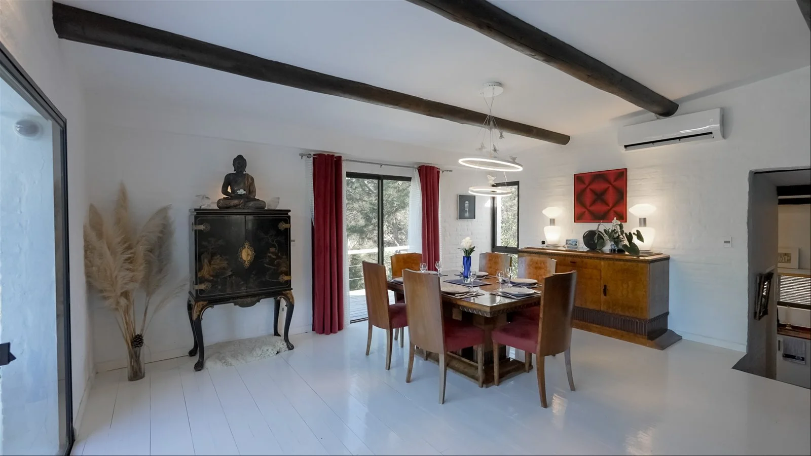 The home offers three spacious en-suite bedrooms, each with poolside access and generous closet space. The open-plan living and dining area is bright and airy, featuring air conditioning and art deco desig