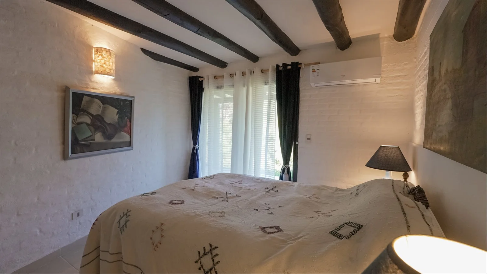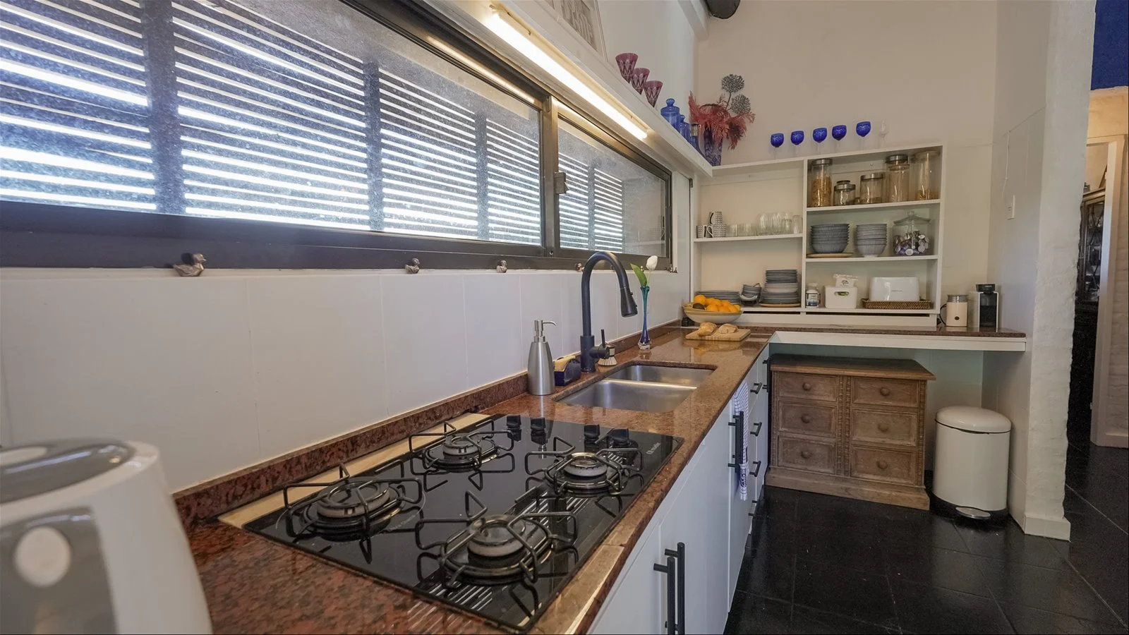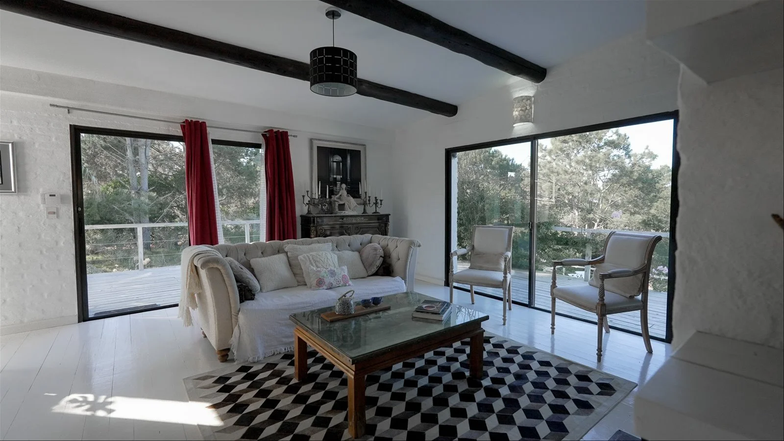 Cuenta con tres amplios dormitorios en suite, todos con acceso a la piscina y placares grandes. El living-comedor es abierto y luminoso, con aire acondicionado, muebles art déco y detalles antiguos. La cocina renovada incluye horno nuevo y una despensa con heladera americana doble.
