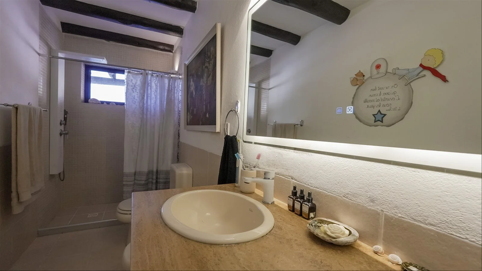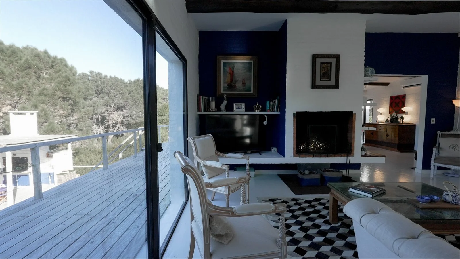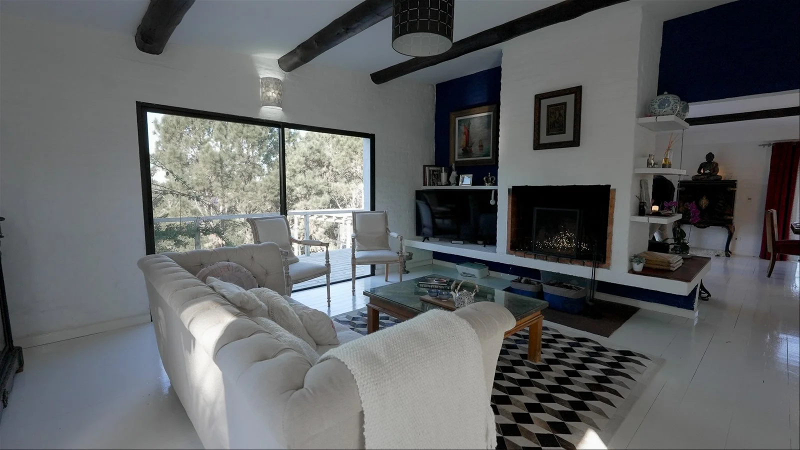 Cuenta con tres amplios dormitorios en suite, todos con acceso a la piscina y placares grandes. El living-comedor es abierto y luminoso, con aire acondicionado, muebles art déco y detalles antiguos. La cocina renovada incluye horno nuevo y una despensa con heladera americana doble.