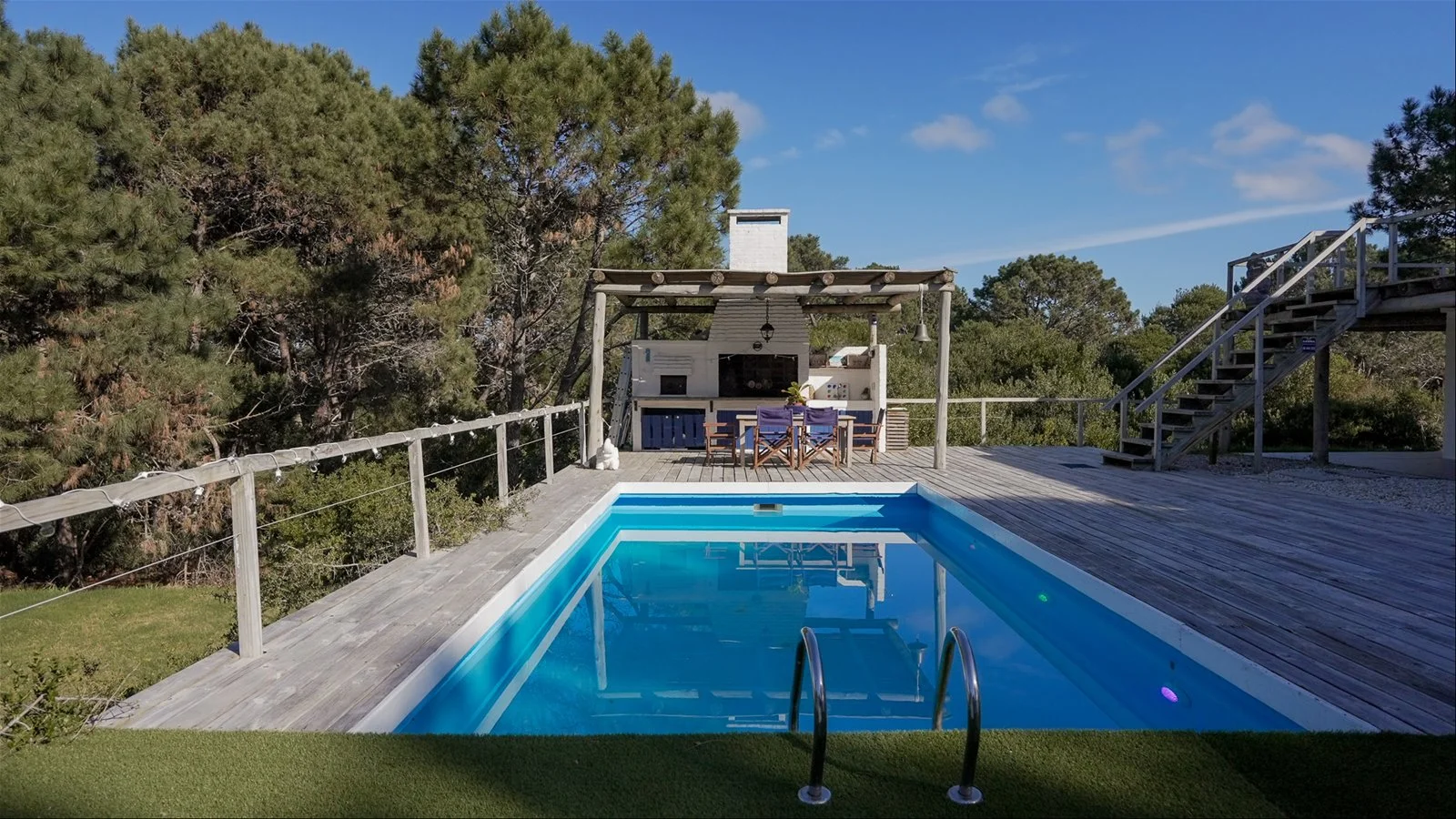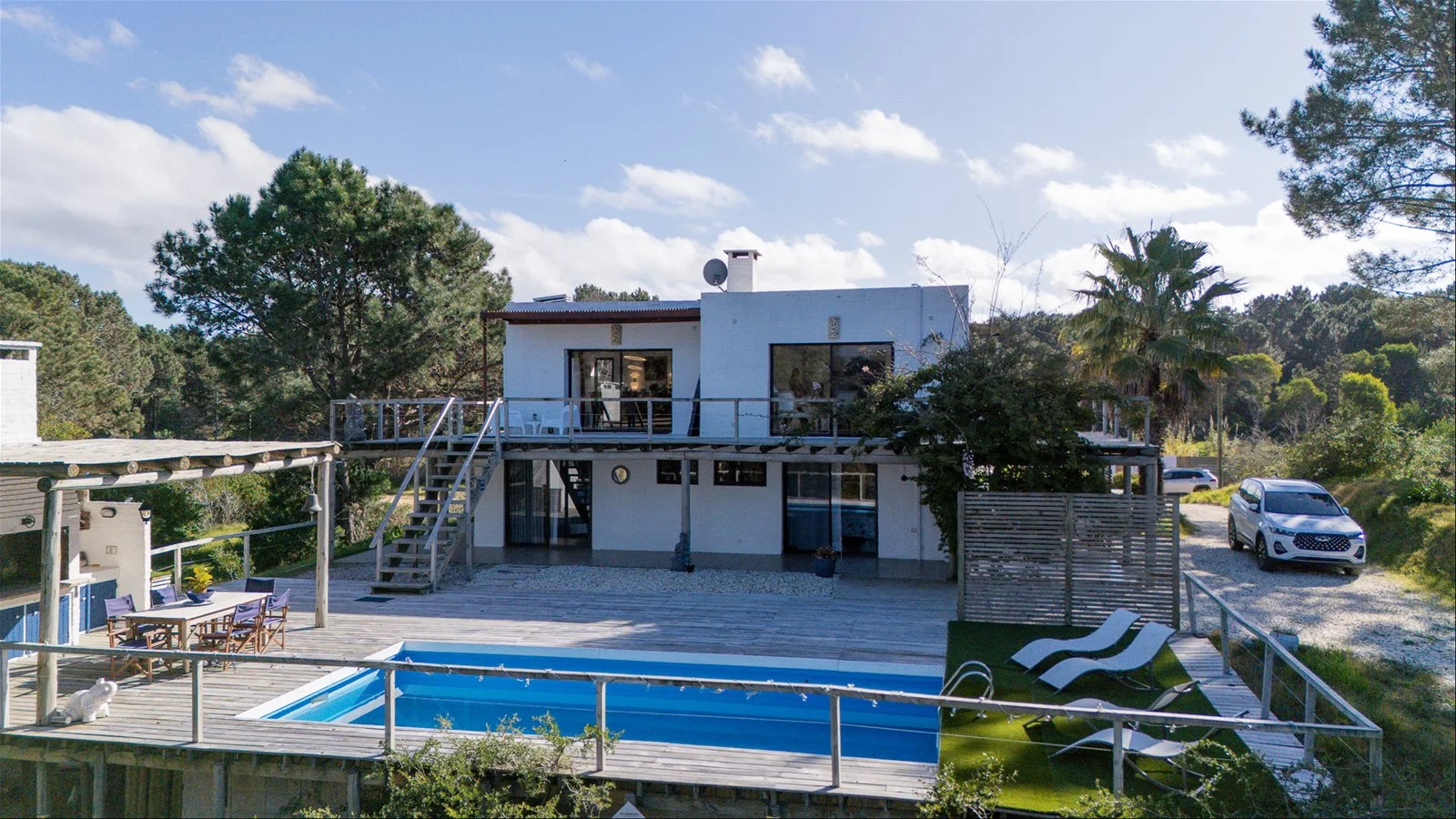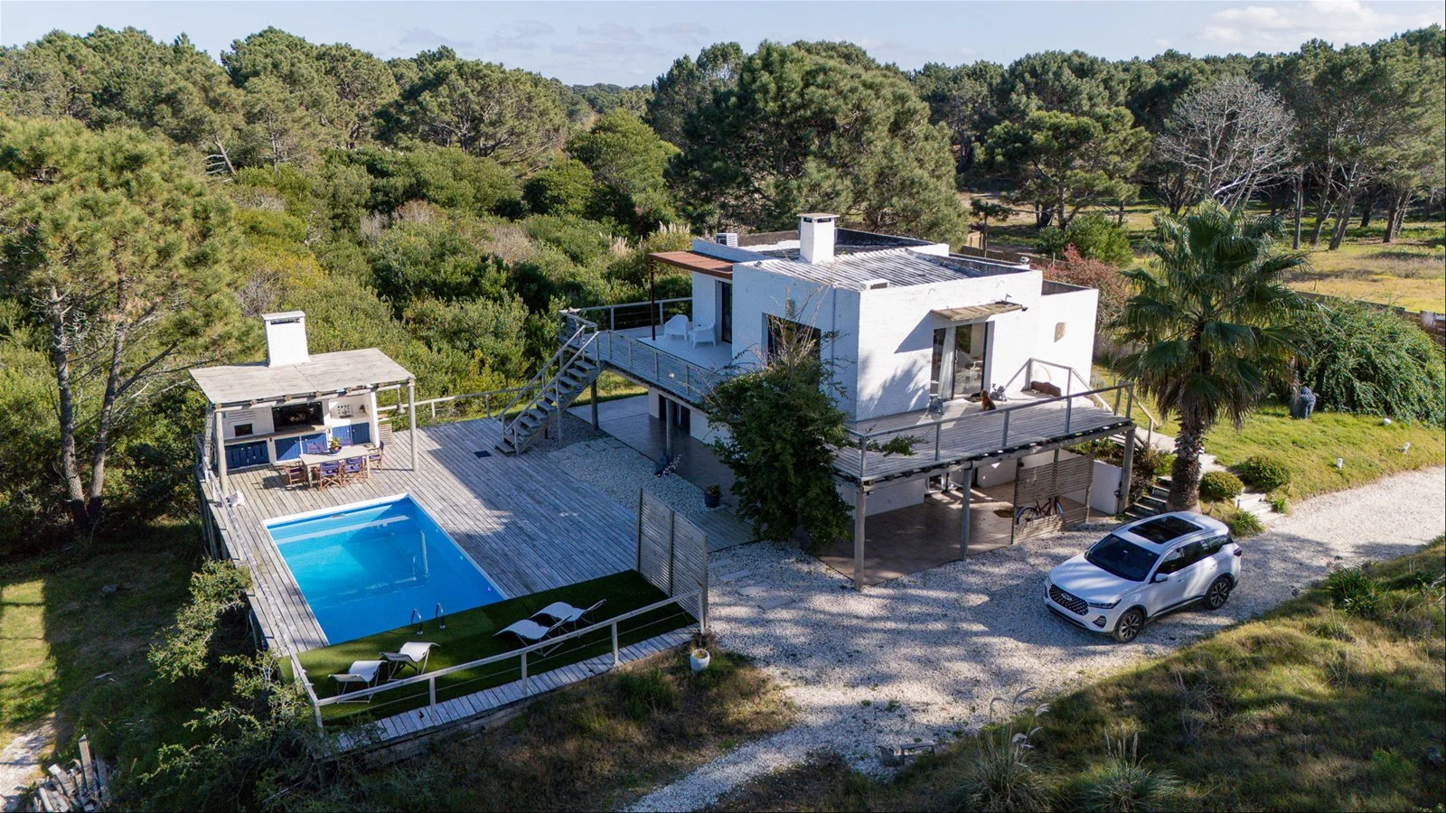 Faro de Luz is a stunning three-level home in the peaceful woods of Faro de José Ignacio. Set on a 1,250 m² private lot, it features a two-level terrace with a covered BBQ area, brick pizza oven, and a pool—perfect for outdoor living.