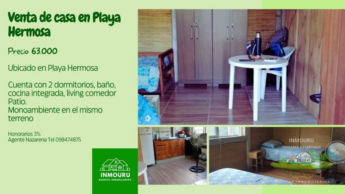 Venta de terrenos en Playa Hermosa Cuenta con una casa de 2 dormitorios baño, cocina definida en 70 metros cuadrados Aparte un monoambiente con baño y cocina integrada en 35 metros cuadrados Derechos posesorios Ambas casas actualmente alquiladas Ideal para inversionista Precio USD 63000 Honorarios 3 % Agente Nazarena Referencia Interna : Tera-2165