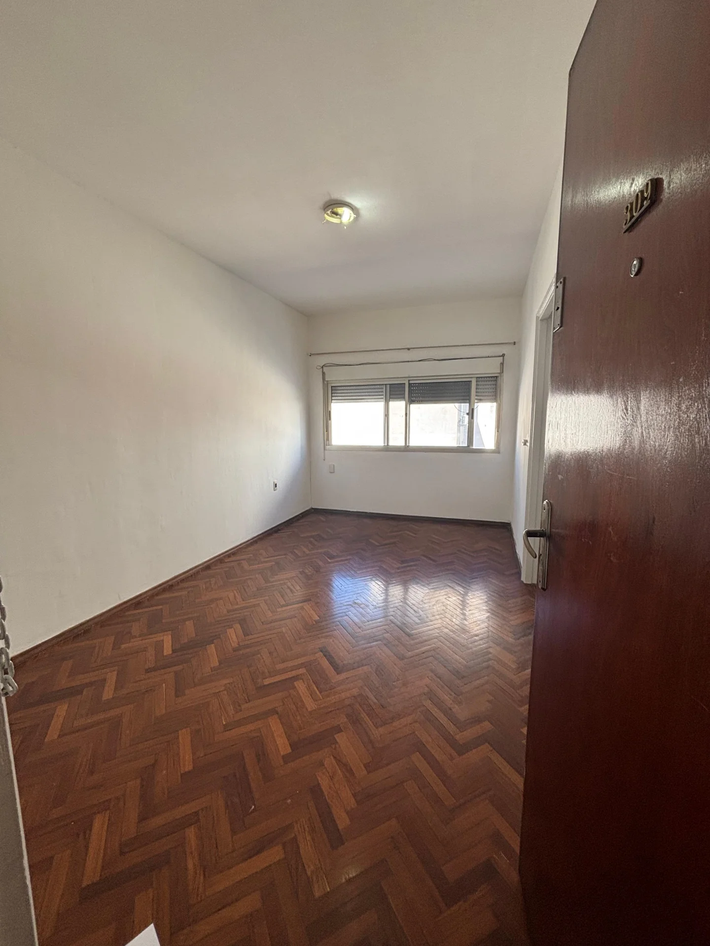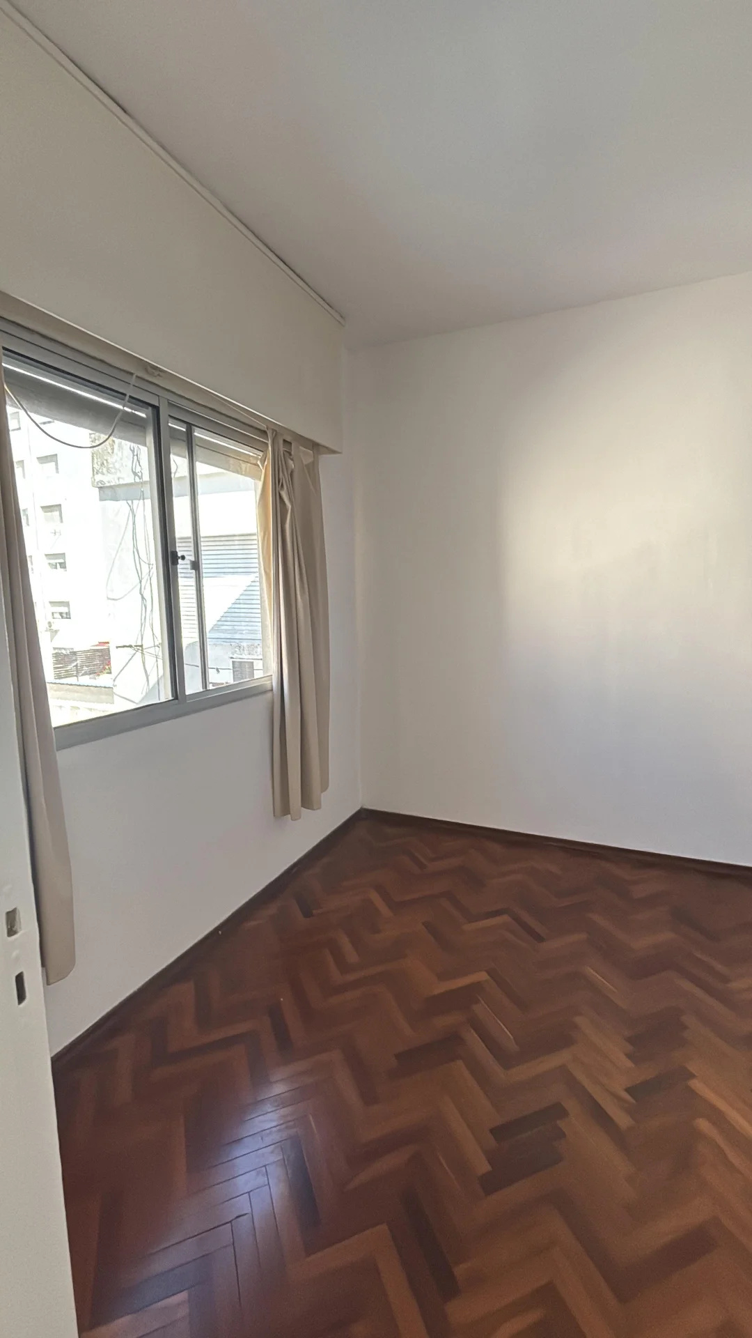 Un dormitorio con vista al contra frente que da al estacionamiento del edificio y el corazon de la manzana muy limenso con placeres de pared a pared super amplios y profundos