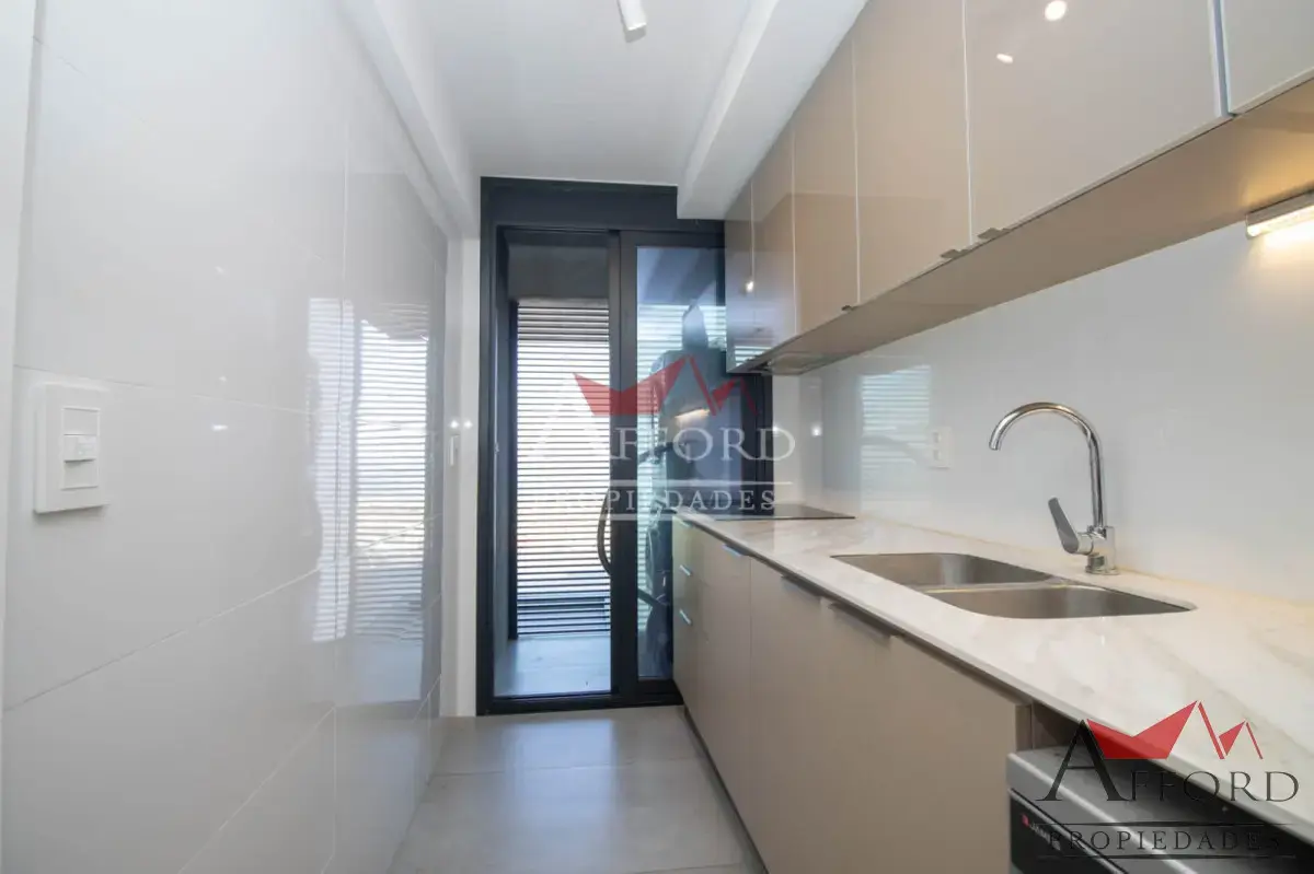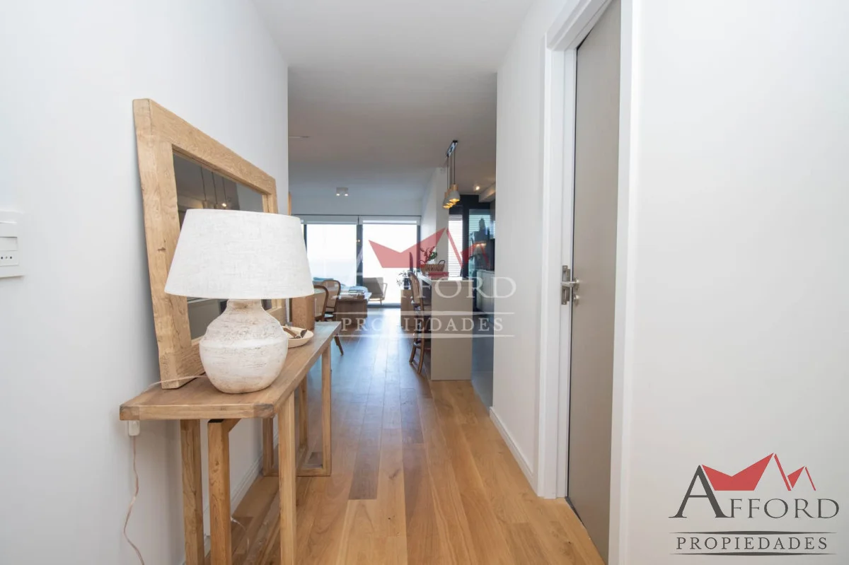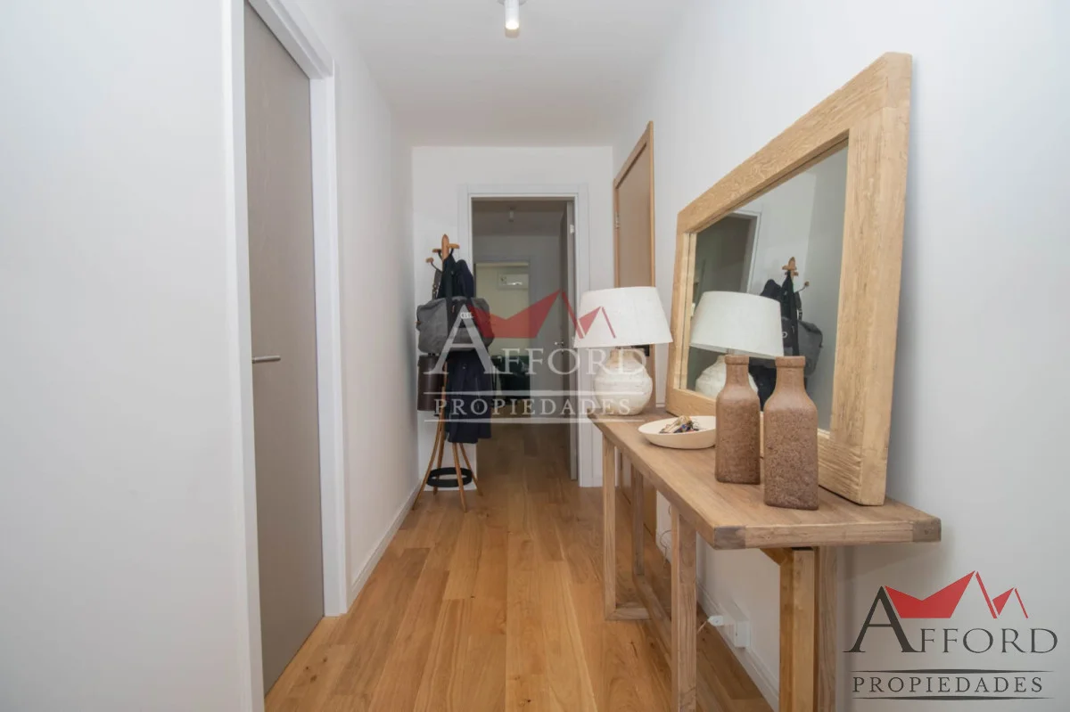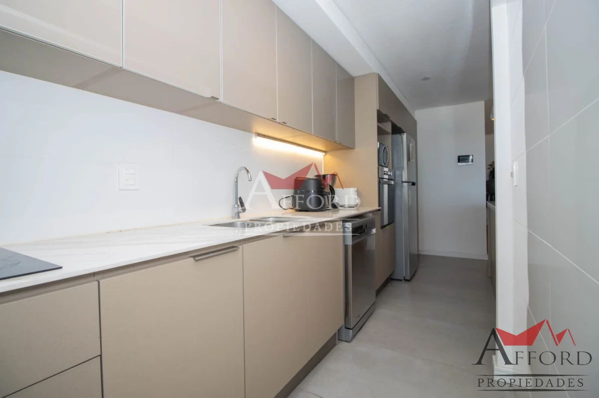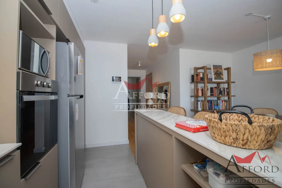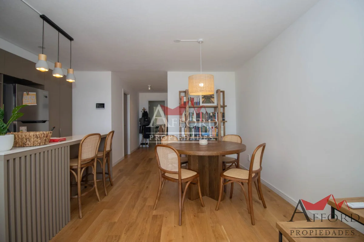 Living con acceso a terraza orientada al frente. Cocina integrada con placares sobre y bajo mesada. Mesada de apoyo y desayunadora. Al contrafrente dos dormitorios, uno de ellos con salida a terraza. Amplios placares. Dos baños completos. Opción de alquilar garajes.
